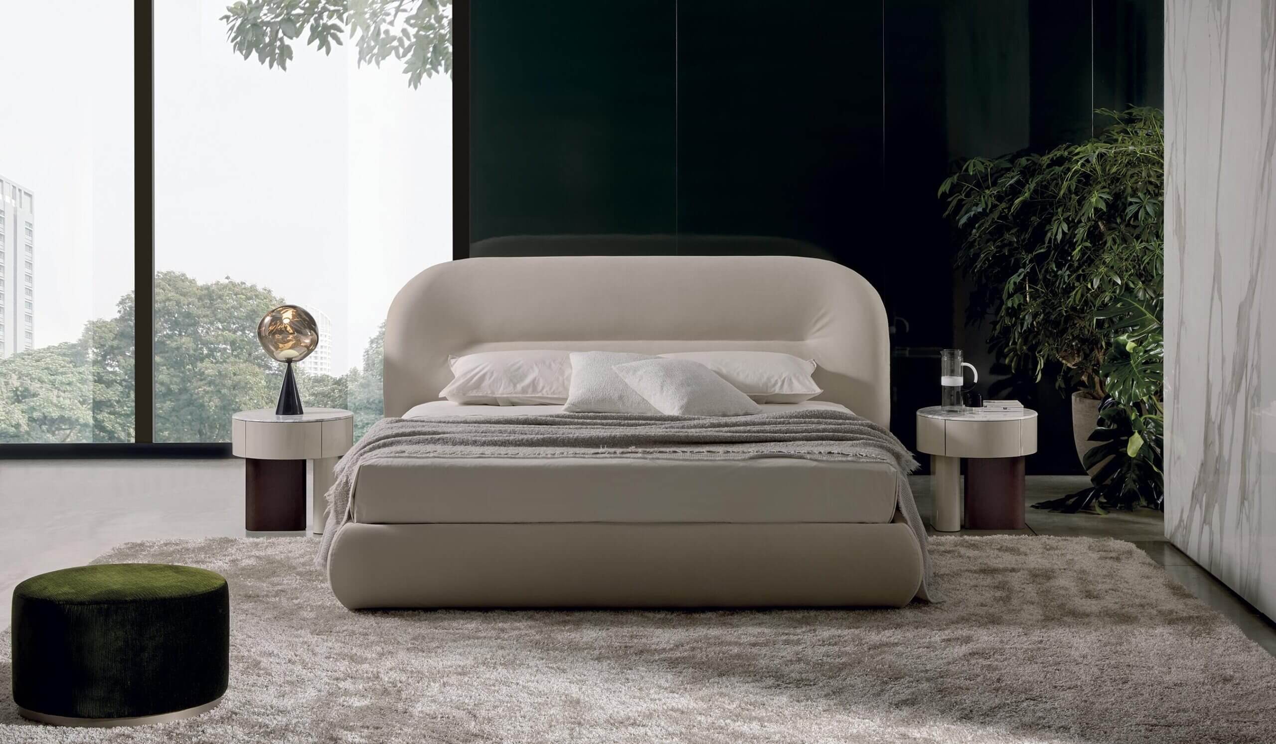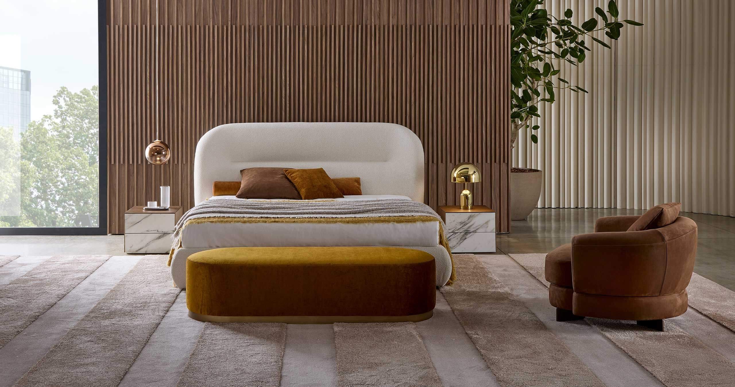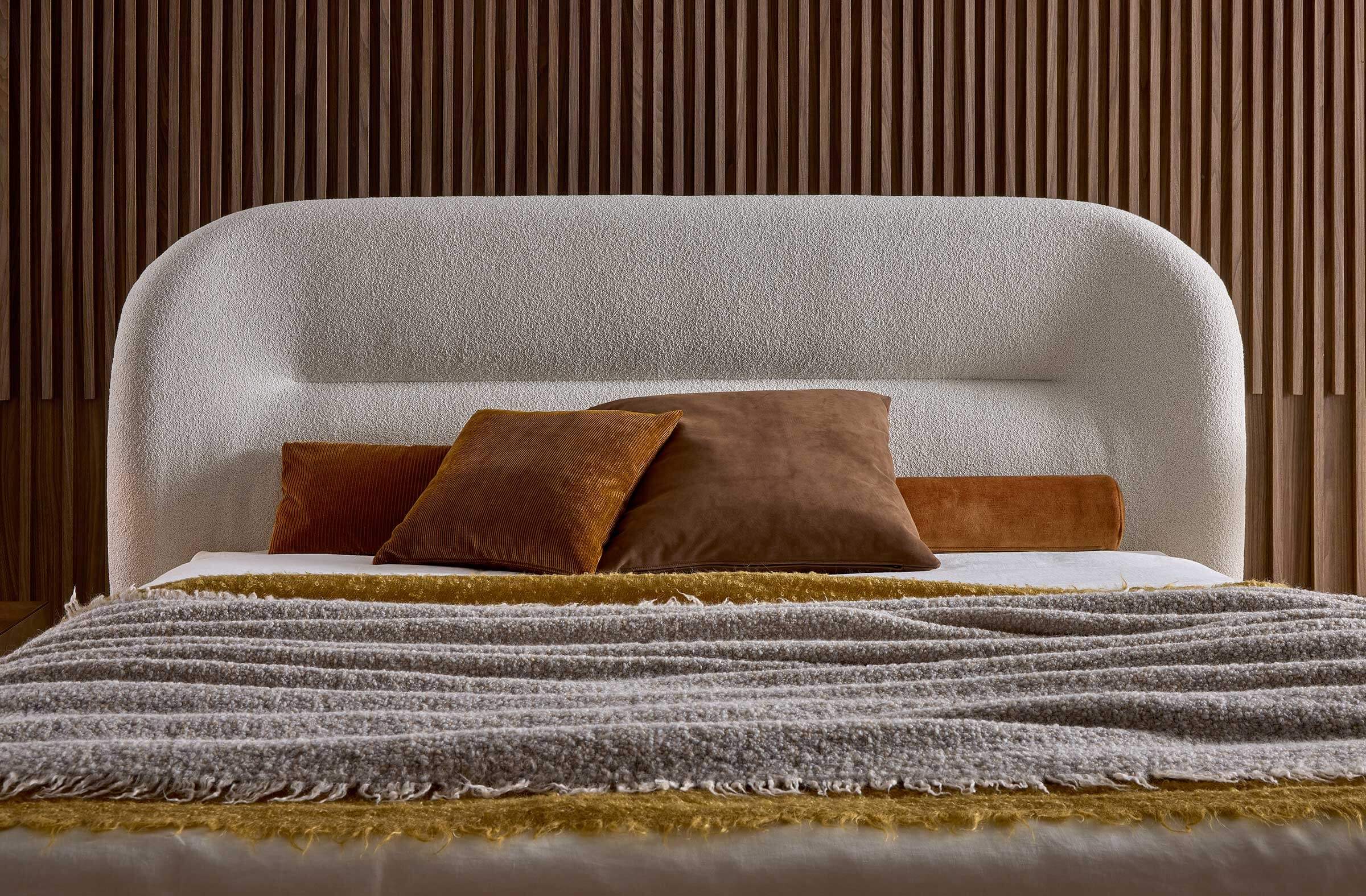 The Noah bed was inspired by the curved, sinuous and enveloping lines of the back of the sofa of the same name, creating a design that recalls the organic charm of the 1970s. This bed transforms any space into a warm and homely environment, offering a pleasant feeling of home comfort. Its distinctive lines give the headboard a strong personality, making it suitable not only for residential environments, but also for contract use, such as luxury hotels, offering guests a high-quality sleep and rest experience.