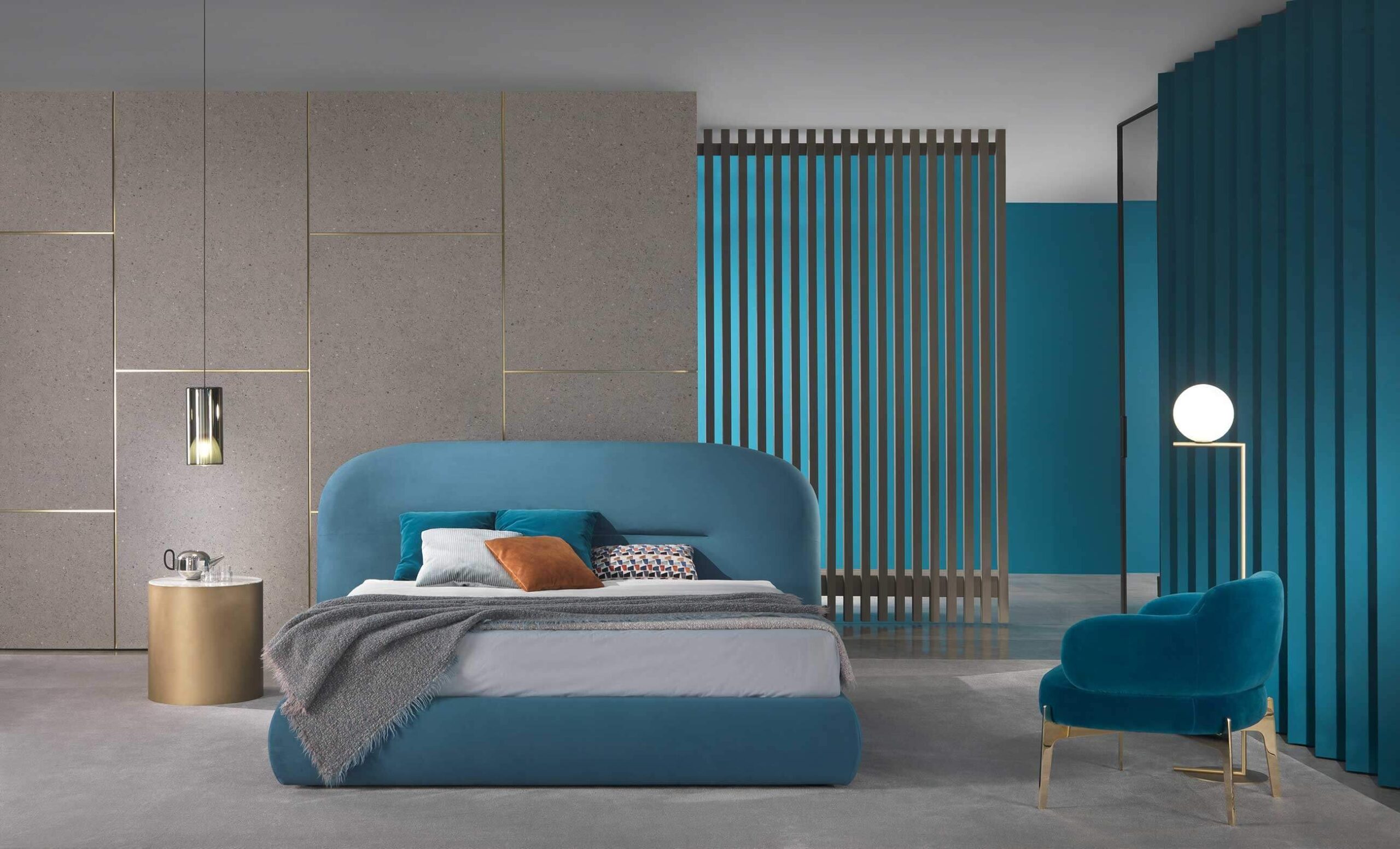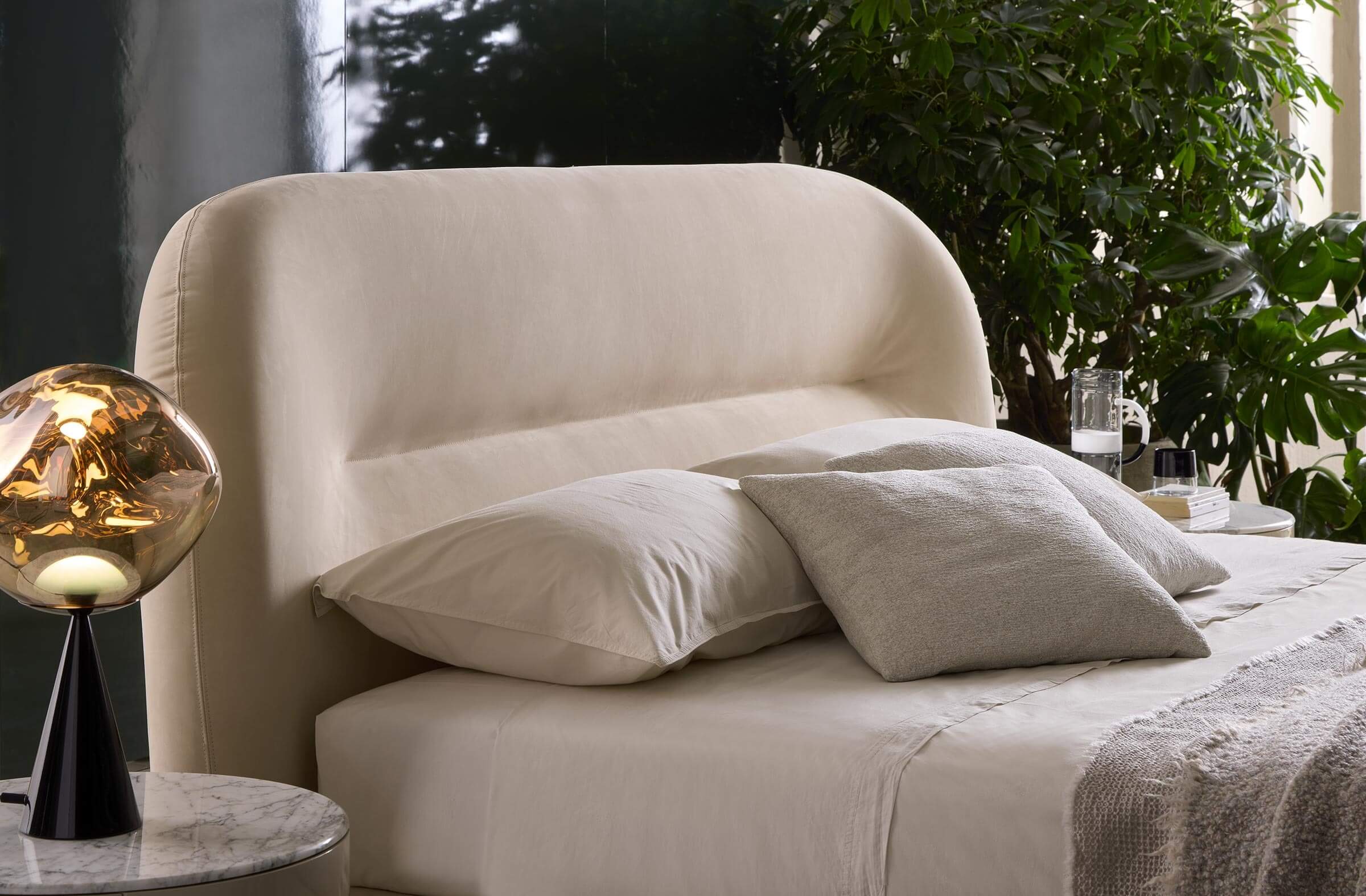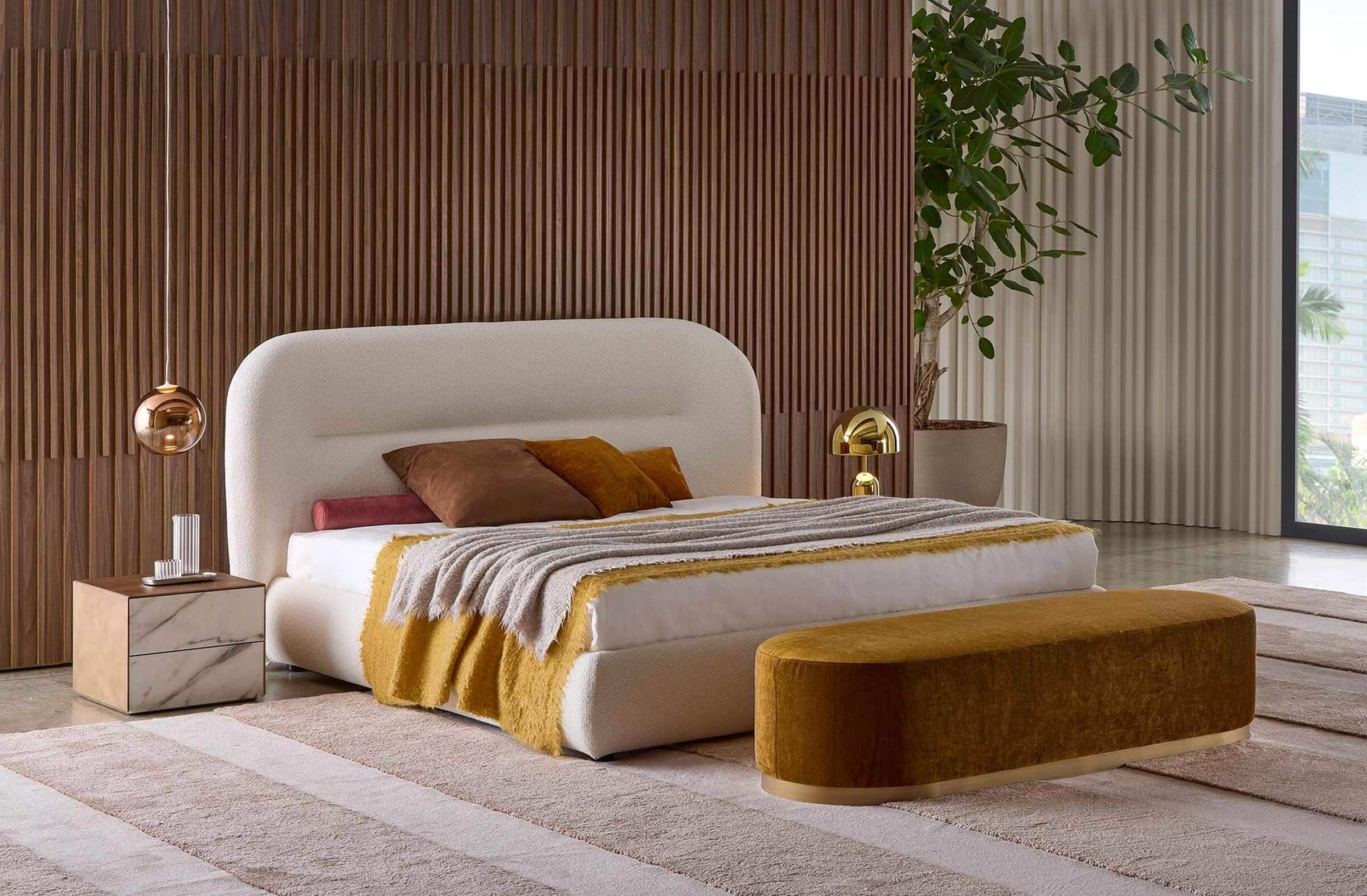 The Noah bed was inspired by the curved, sinuous and enveloping lines of the back of the sofa of the same name, creating a design that recalls the organic charm of the 1970s. This bed transforms any space into a warm and homely environment, offering a pleasant feeling of home comfort. Its distinctive lines give the headboard a strong personality, making it suitable not only for residential environments, but also for contract use, such as luxury hotels, offering guests a high-quality sleep and rest experience.
