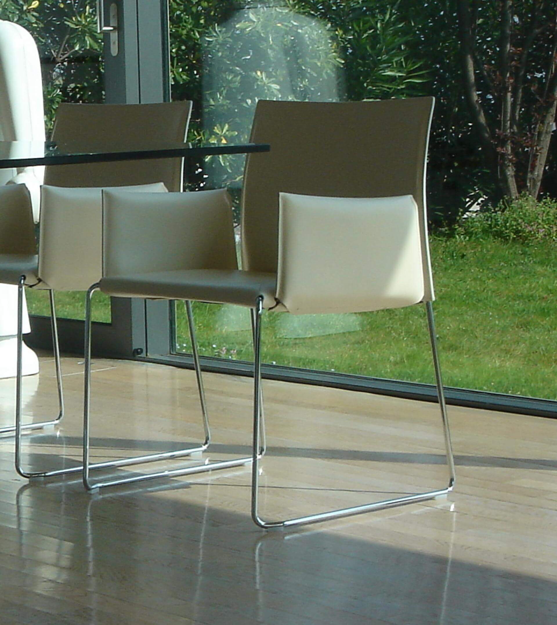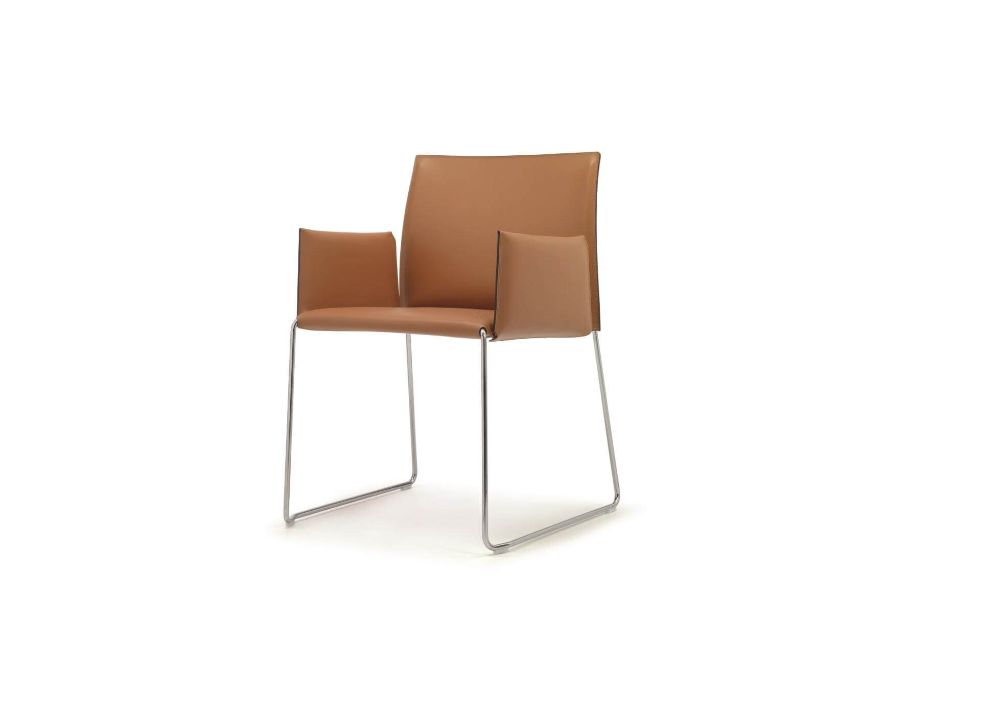 Chair with arms, with frame in chromed or painted steel rod (ø12 mm); seat and backrest upholstered and covered in different materials; non-slip nylon feet, under-seat with intertwined elastic straps (standard); seat cover in sheet covered with black technical fabric.