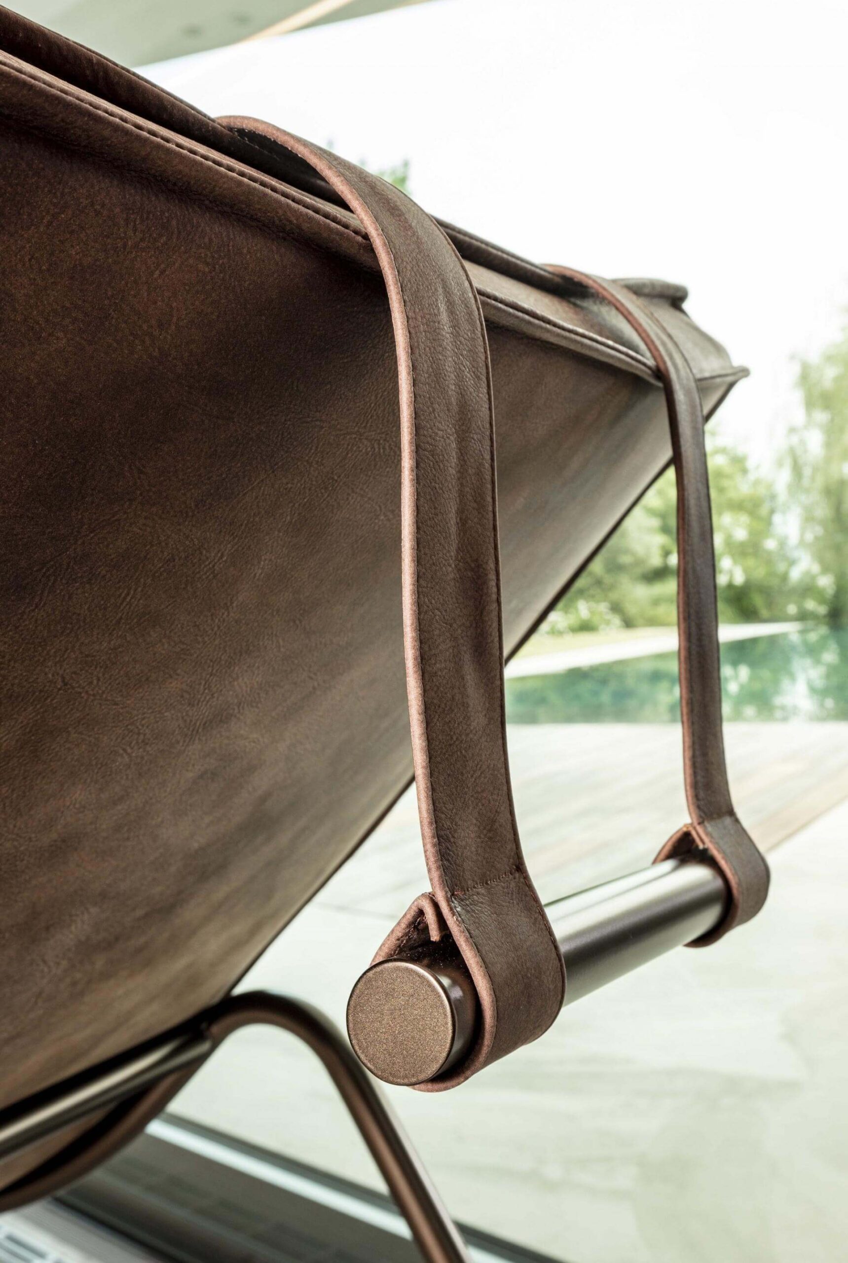 Chaise-longue with tubular metal base, painted in matt black, matt white, bronze or graphite. Seat with steel frame, polyurethane foam padding and covered in soft leather, vintage leather, felt, faux leather. Removable headrest cushion with a painted counterweight.