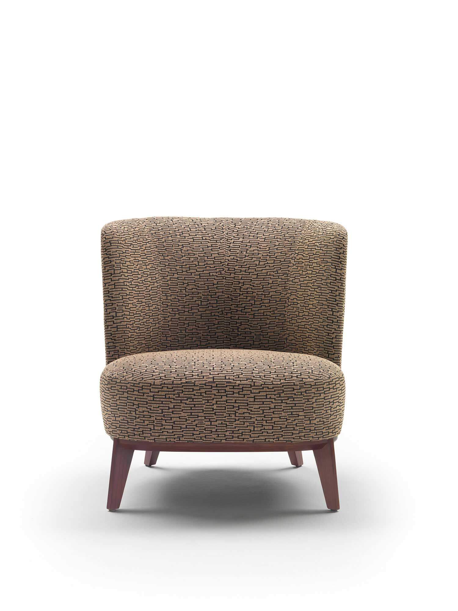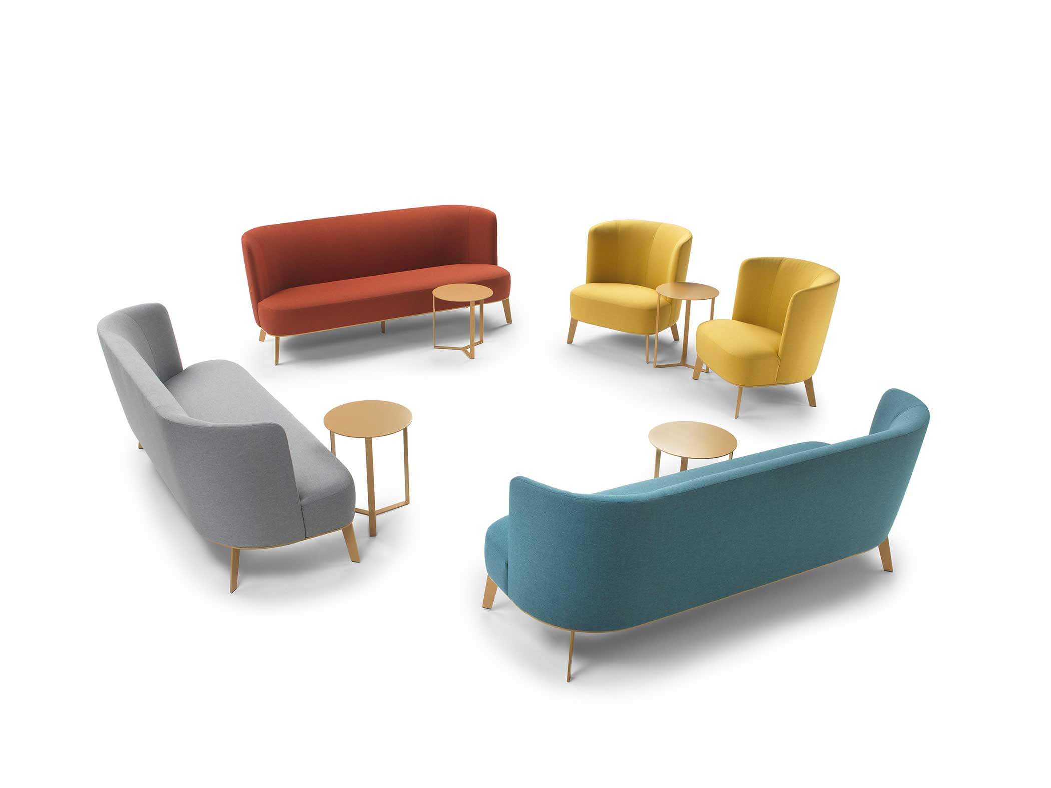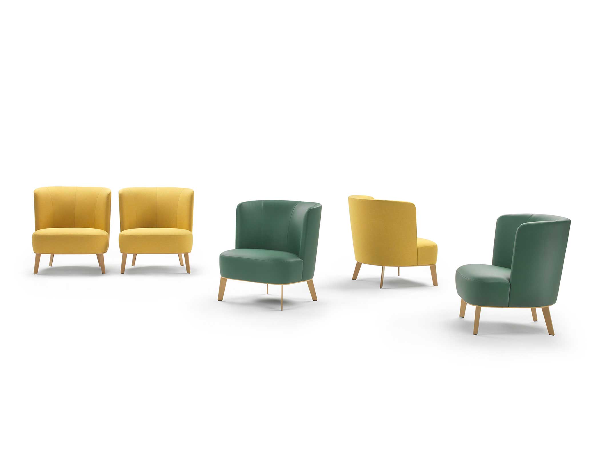 Derek is a family of armchairs and sofas characterised by soft, simple and fresh lines. This furniture has a clean look and can be customised with a metal or wooden base, depending on preference. The wide choice of fabrics, leathers and faux leathers allows them to be adapted to different projects and environments.