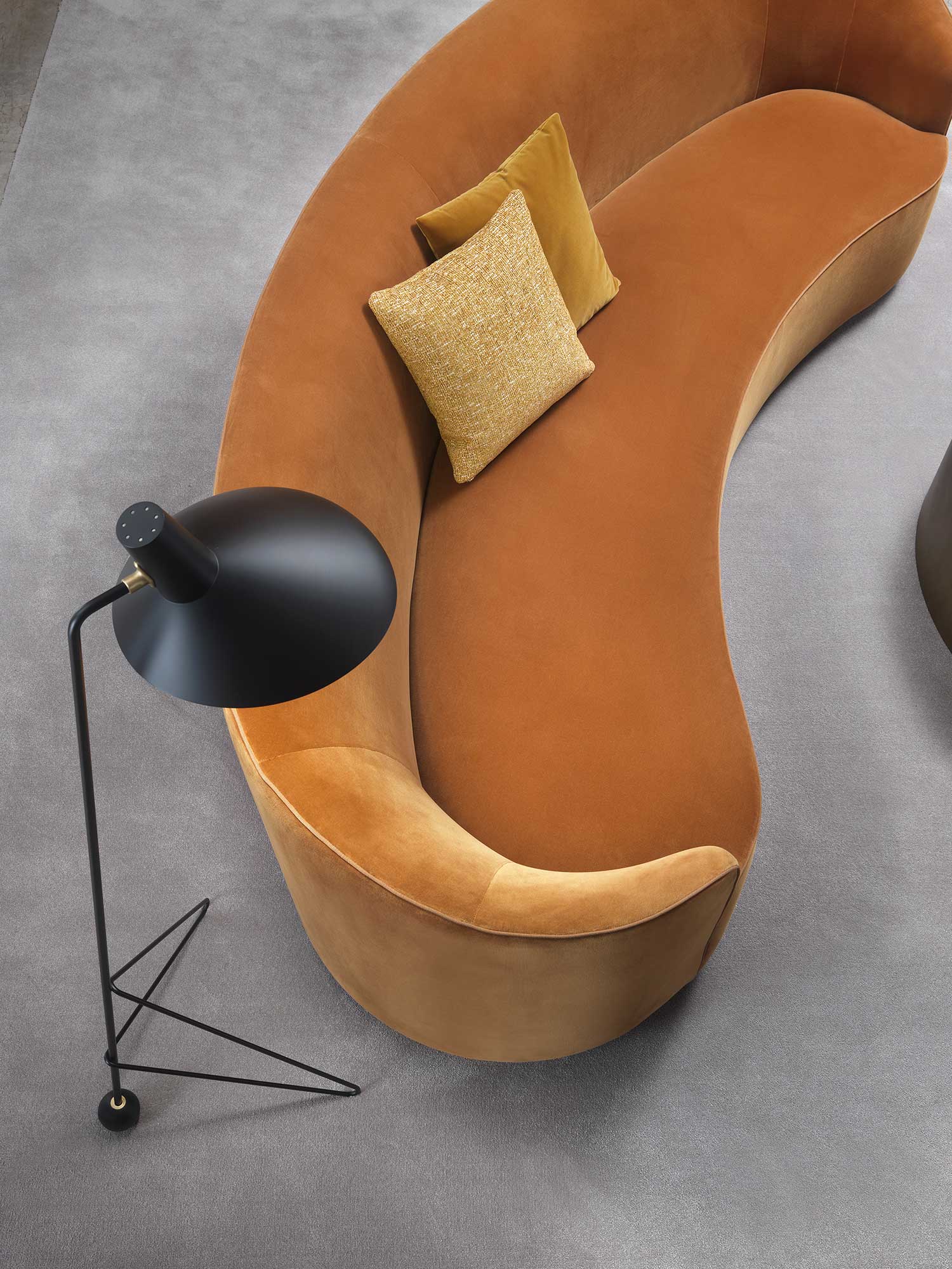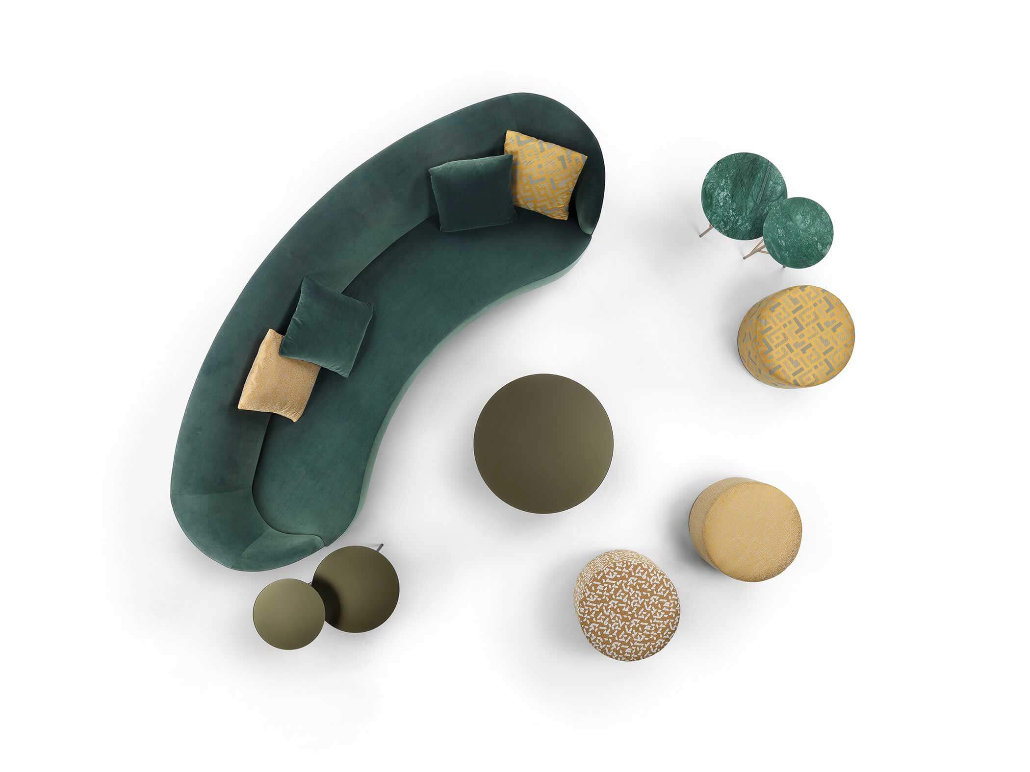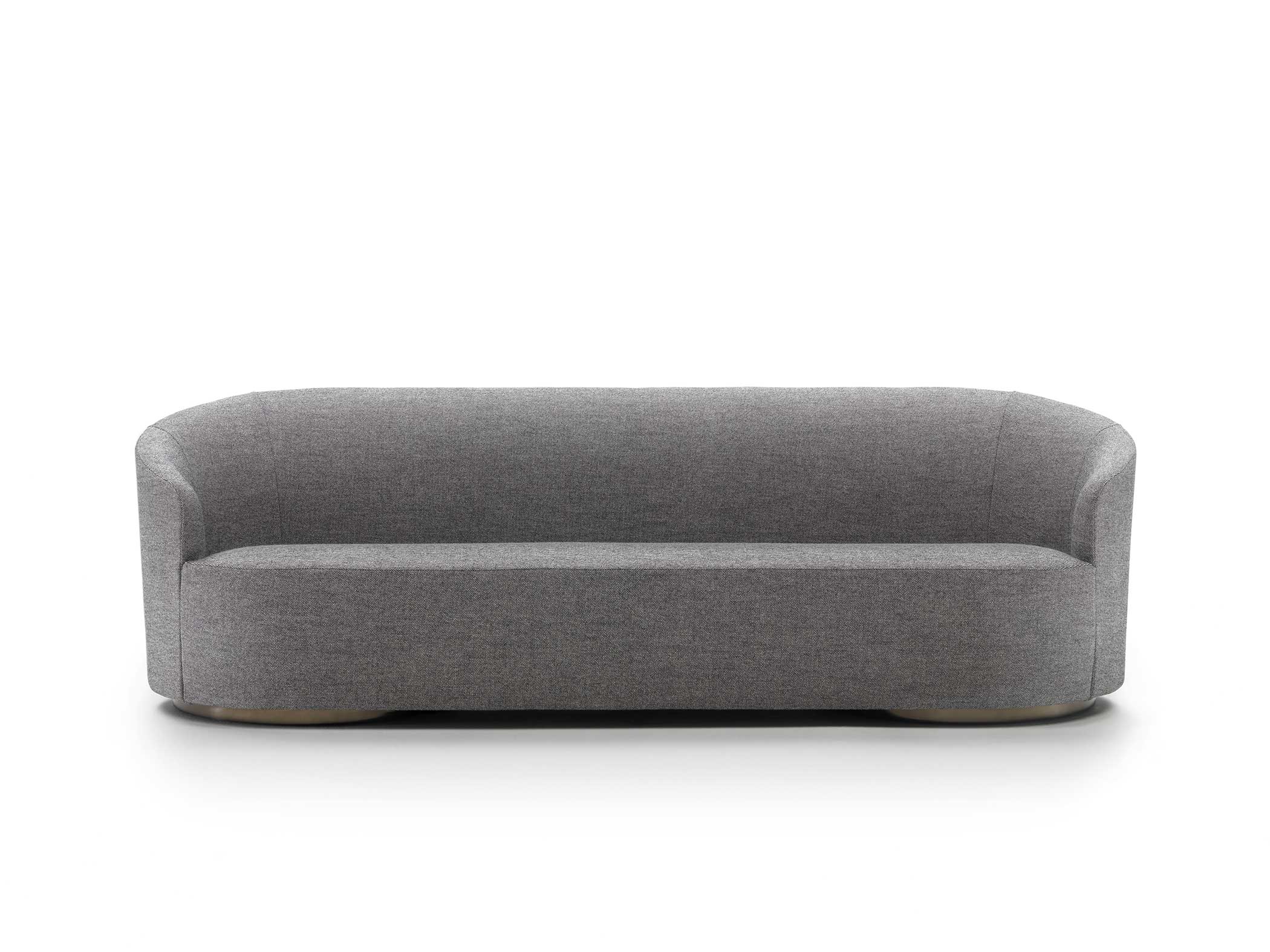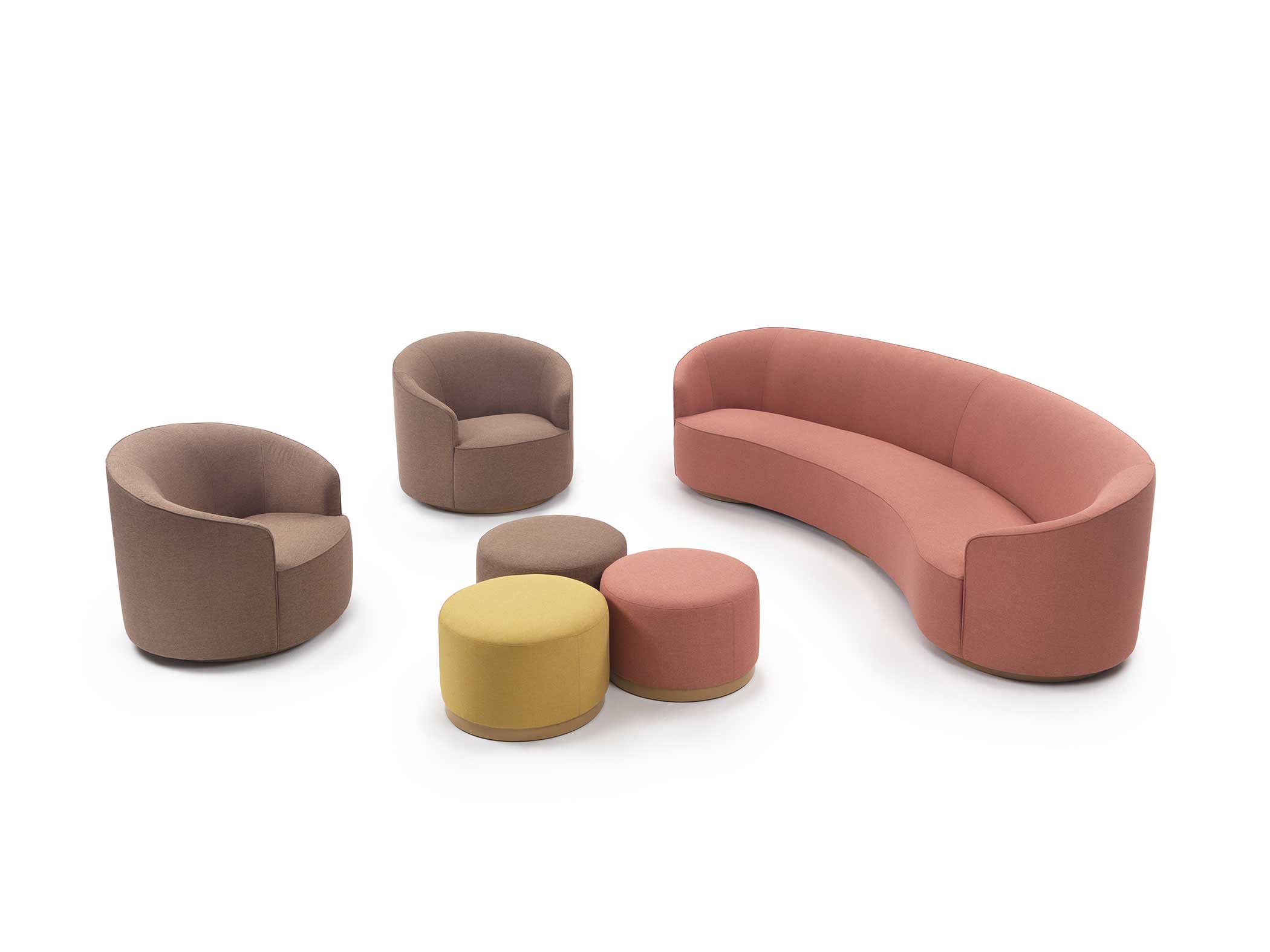 The sofas, armchairs and ottomans in the Moon collection are characterised by curved, elegant lines, with soft, rounded volumes in the upholstered parts and a light metal base on which they rest. This combination offers a design that is distinguished by its lightness, while at the same time presenting solid and compact volumes.