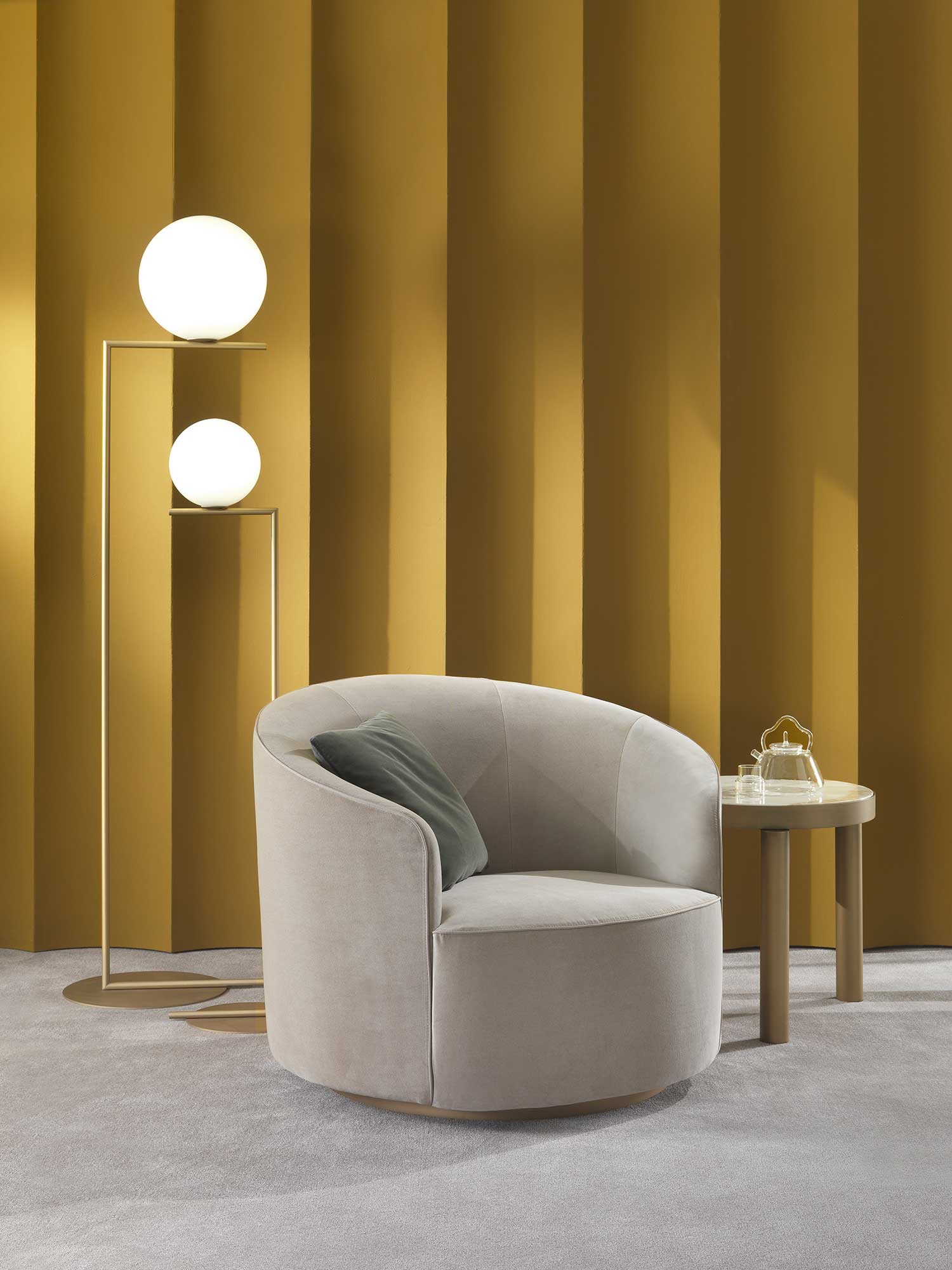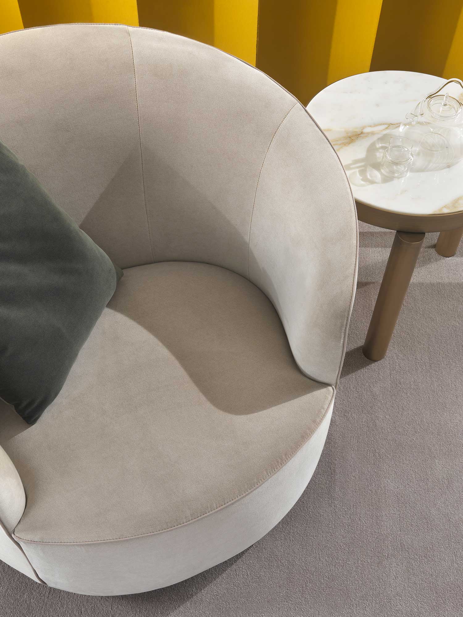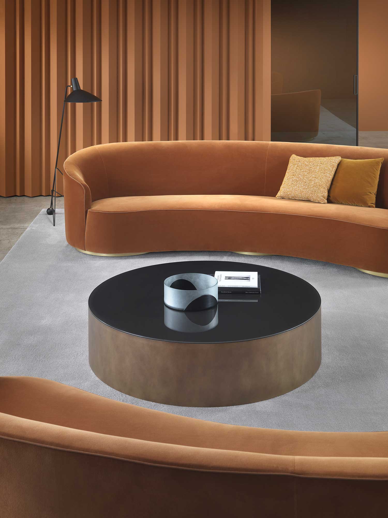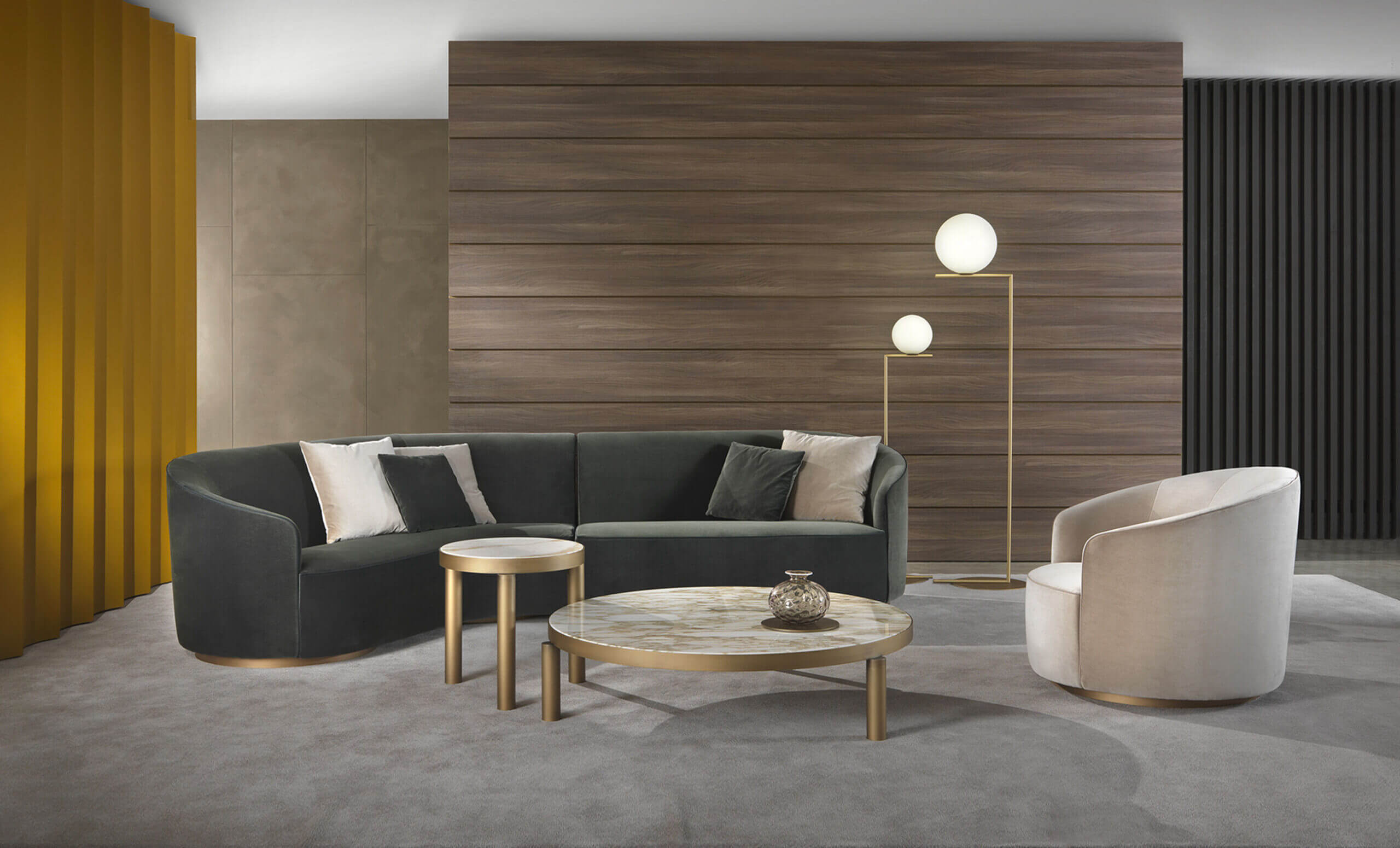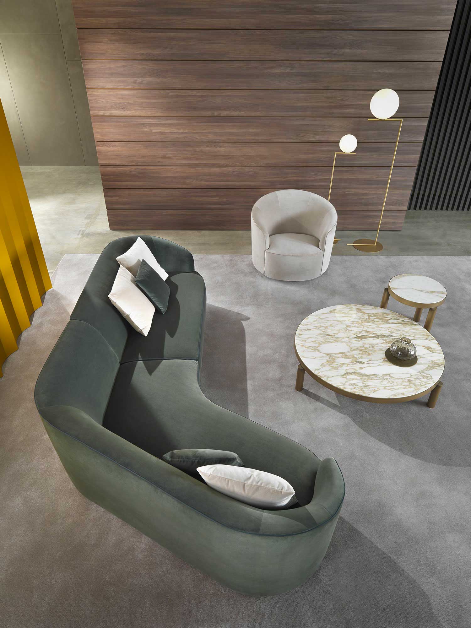 The sofas, armchairs and ottomans in the Moon collection are characterised by curved, elegant lines, with soft, rounded volumes in the upholstered parts and a light metal base on which they rest. This combination offers a design that is distinguished by its lightness, while at the same time presenting solid and compact volumes.