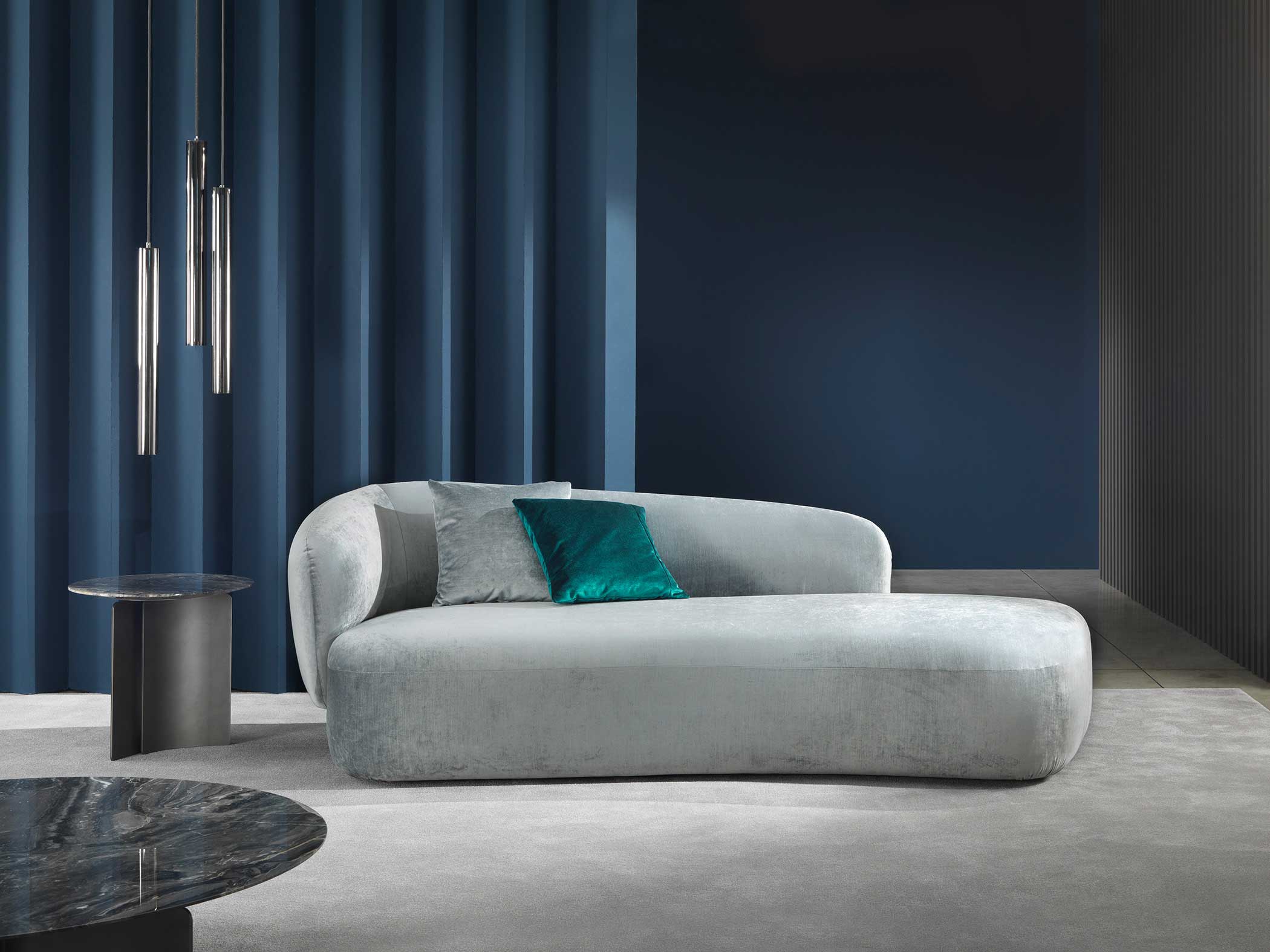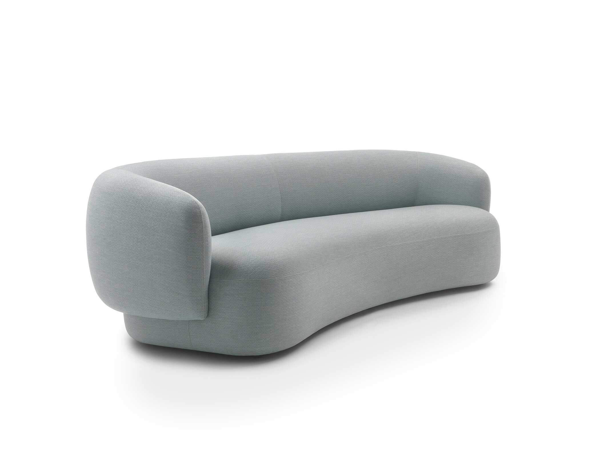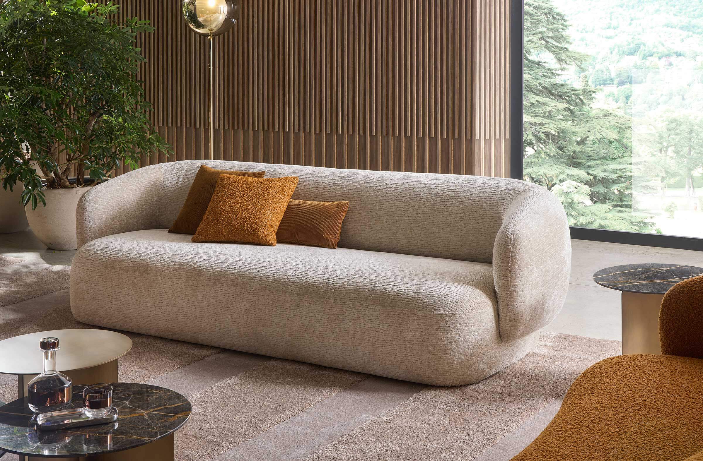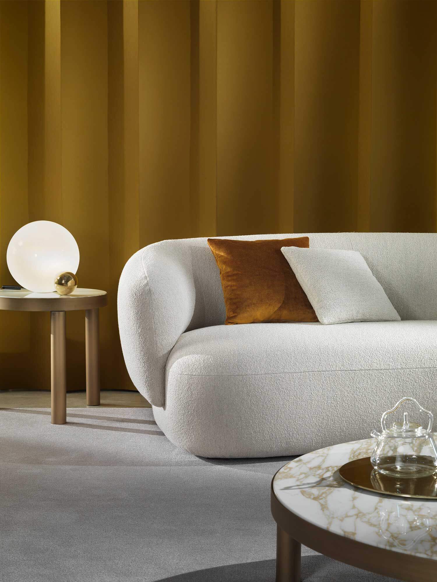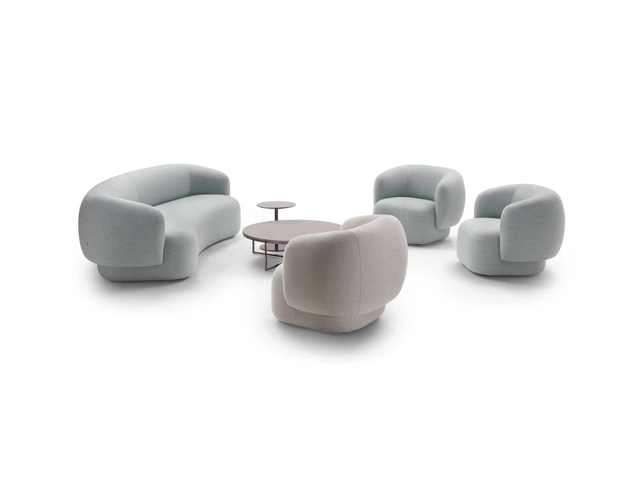 Noah sofas and armchairs are characterised by a sinuous, enveloping design with soft lines inspired by the charm of the 1970s. This style gives them a cosy and homely feel, perfect for creating a warm and comfortable ambience. The range of available sizes includes both curved and straight sofas, allowing them to adapt to different spaces and layouts.