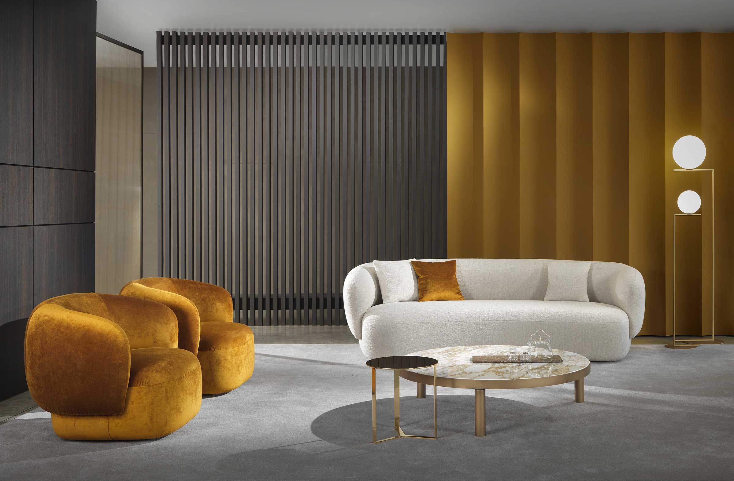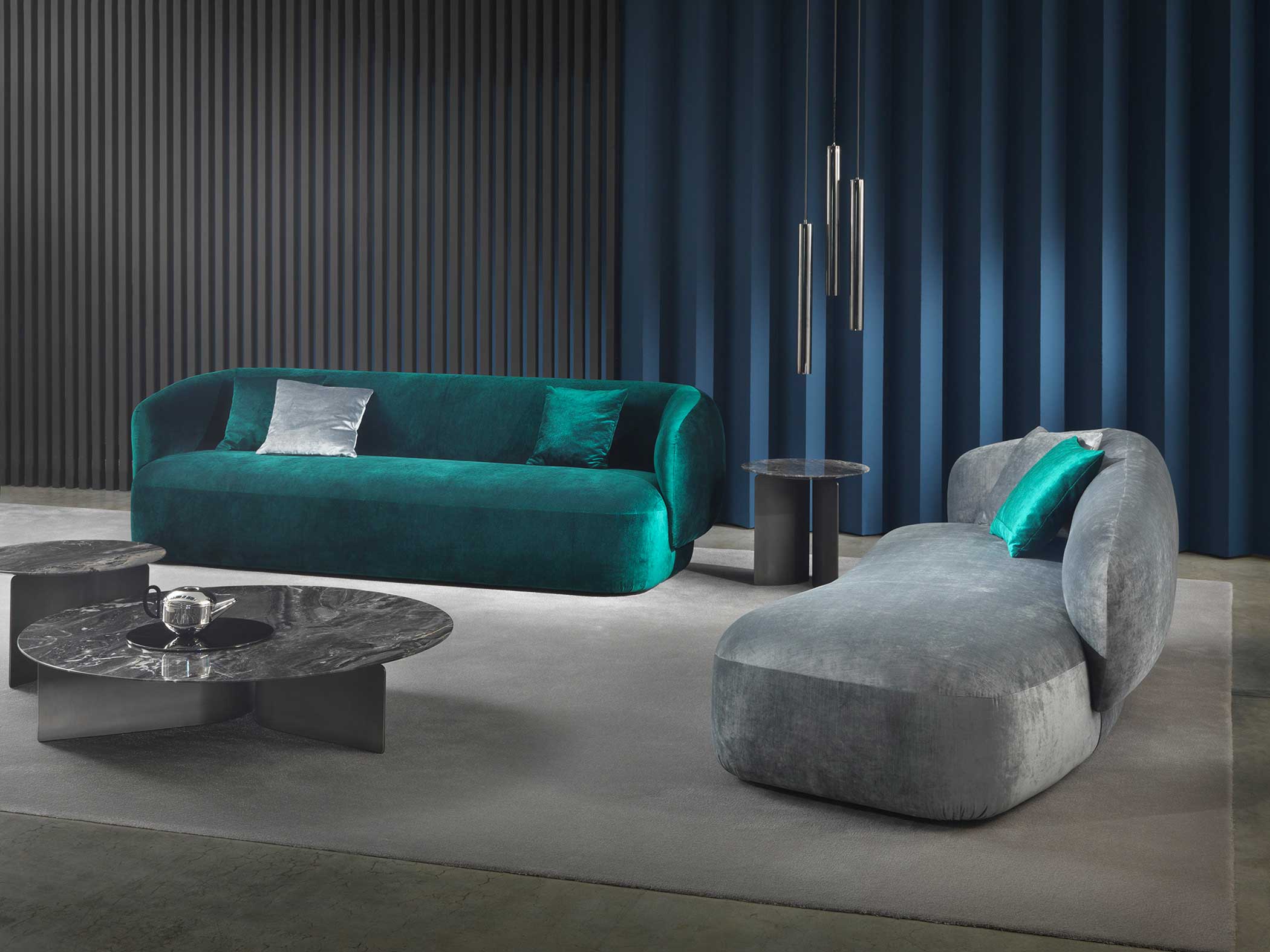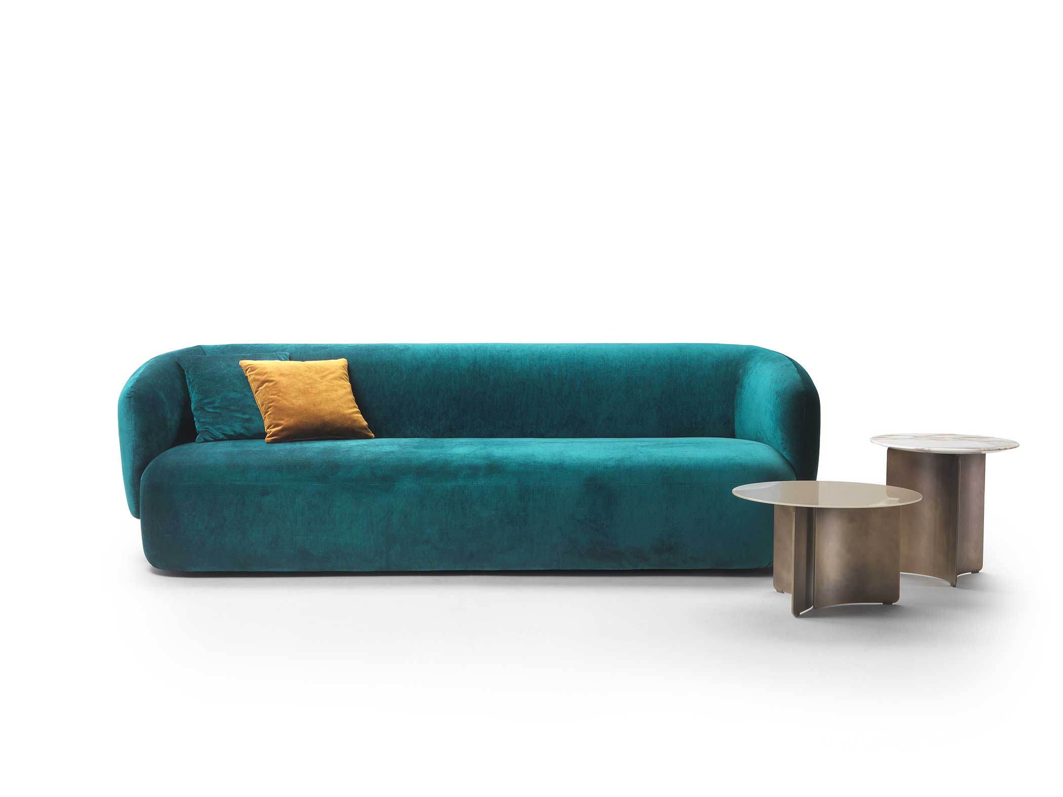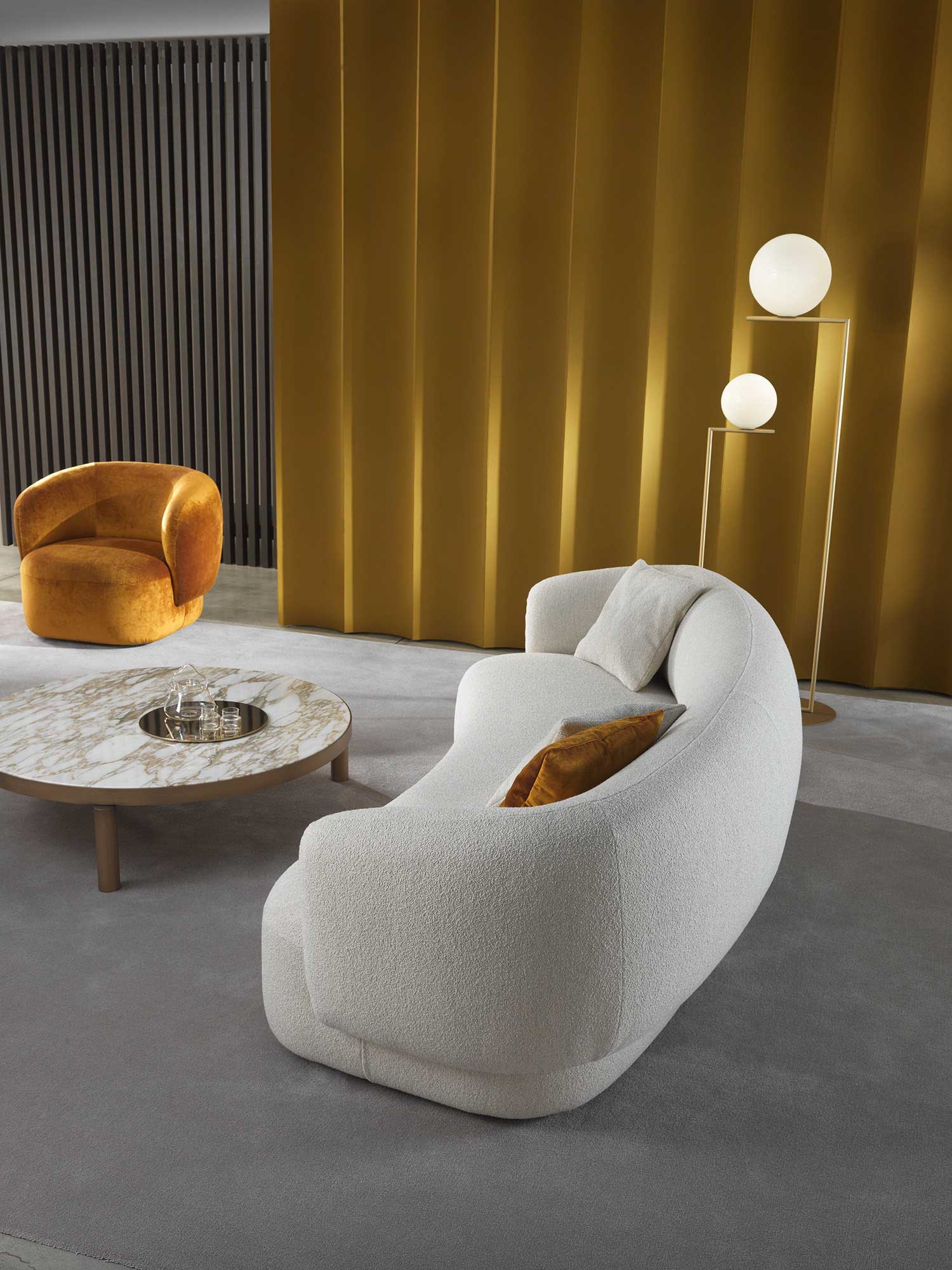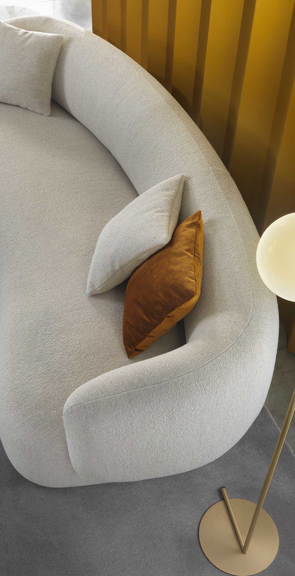 Noah sofas and armchairs are characterised by a sinuous, enveloping design with soft lines inspired by the charm of the 1970s. This style gives them a cosy and homely feel, perfect for creating a warm and comfortable ambience. The range of available sizes includes both curved and straight sofas, allowing them to adapt to different spaces and layouts.