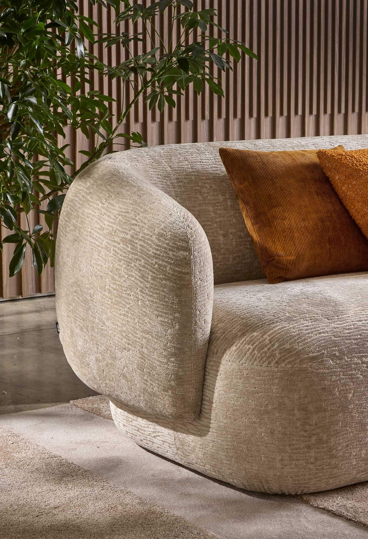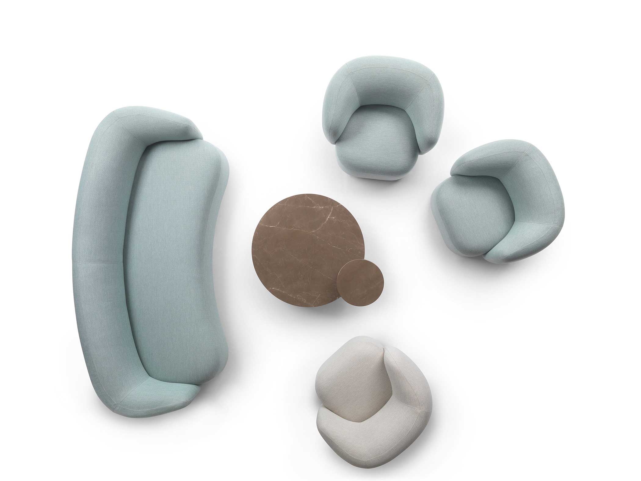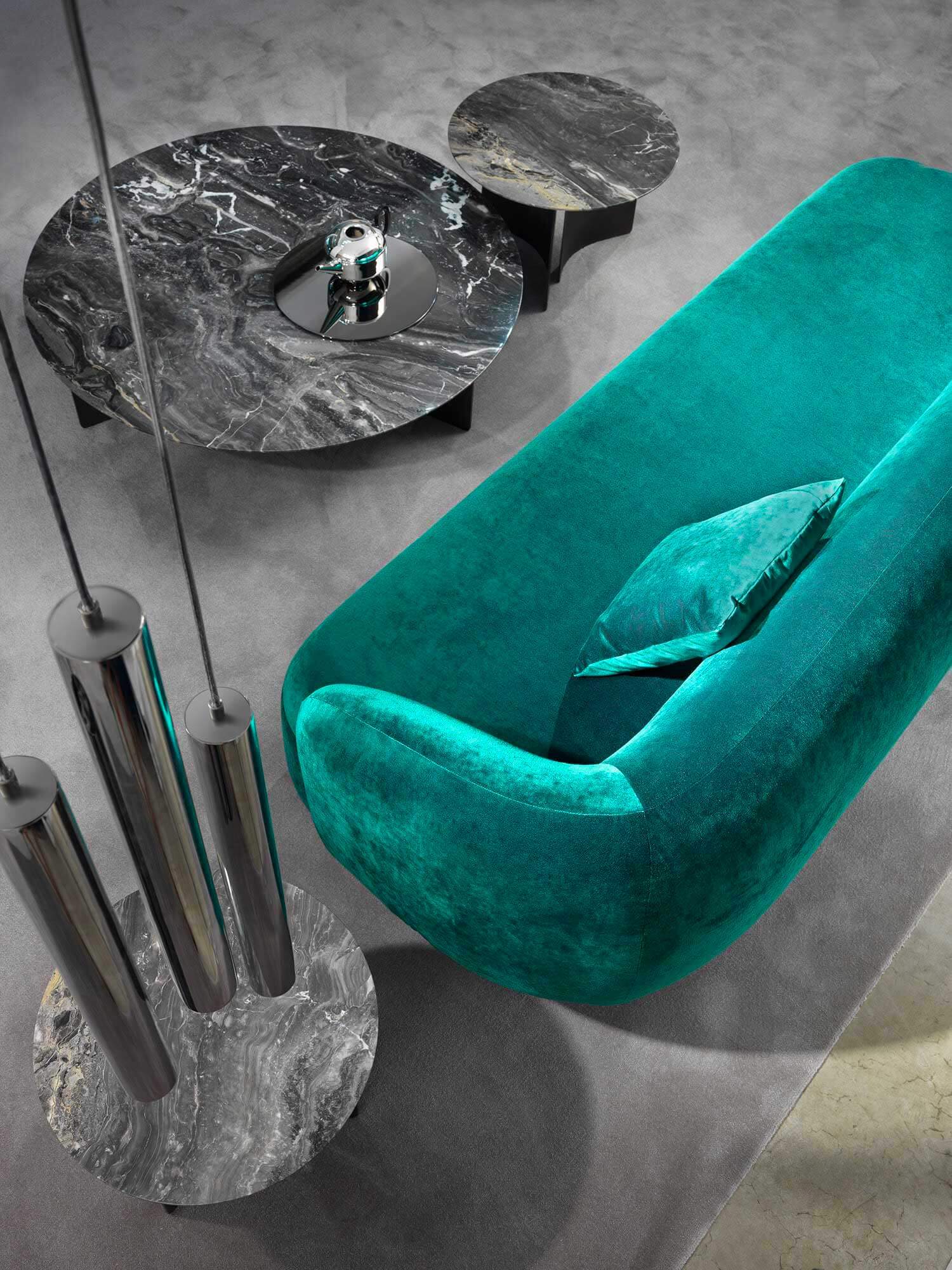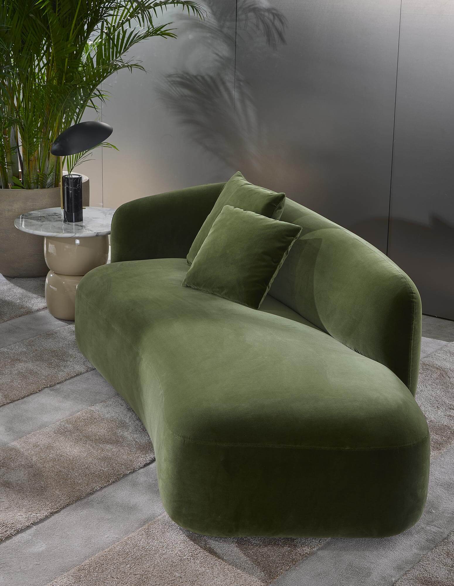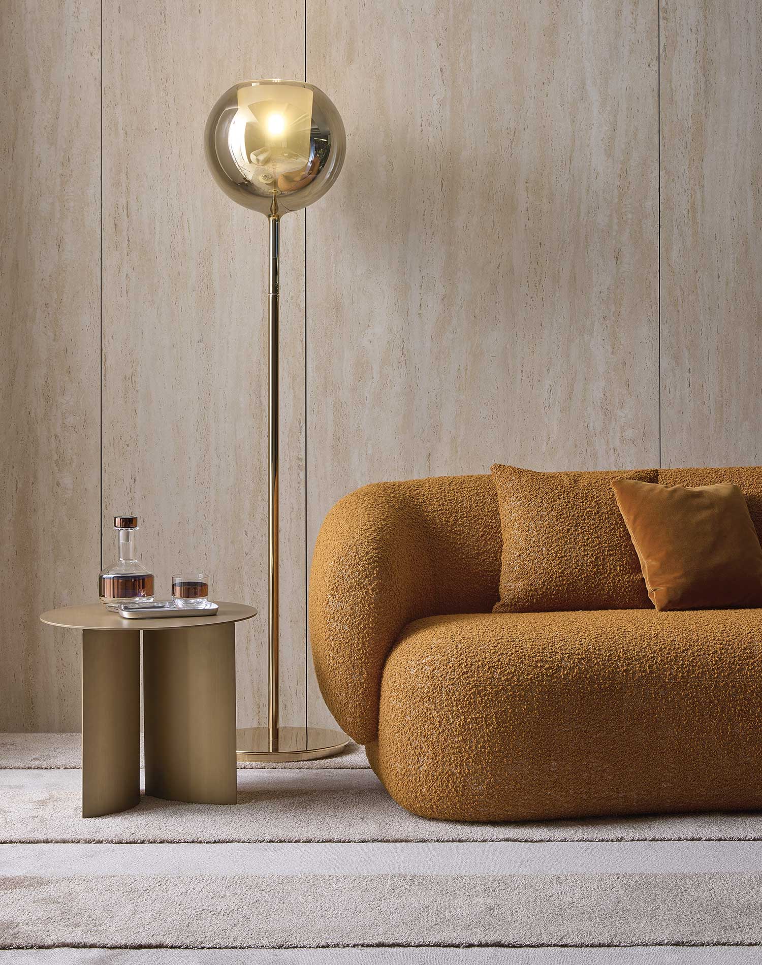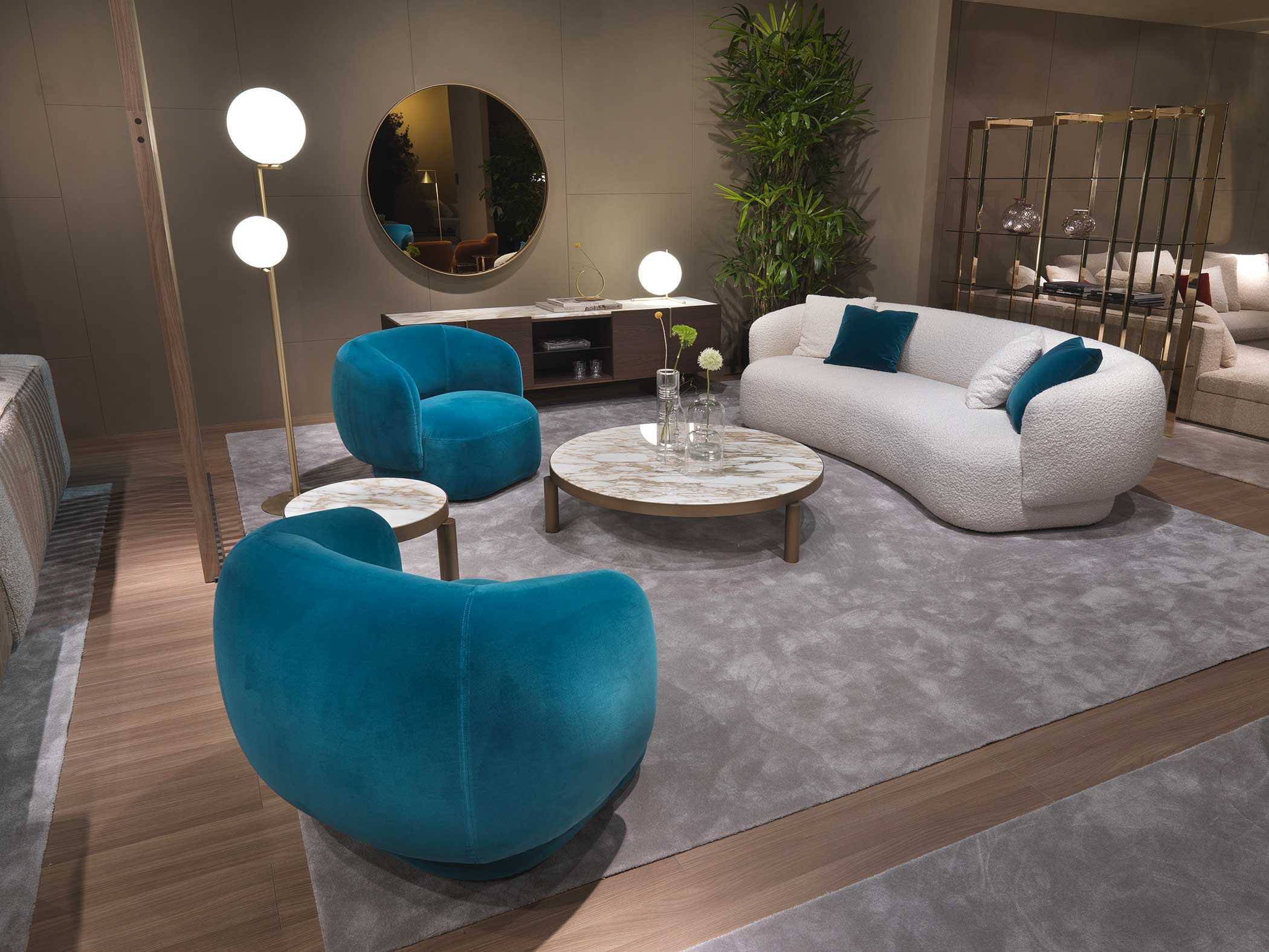 Noah sofas and armchairs are characterised by a sinuous, enveloping design with soft lines inspired by the charm of the 1970s. This style gives them a cosy and homely feel, perfect for creating a warm and comfortable ambience. The range of available sizes includes both curved and straight sofas, allowing them to adapt to different spaces and layouts.