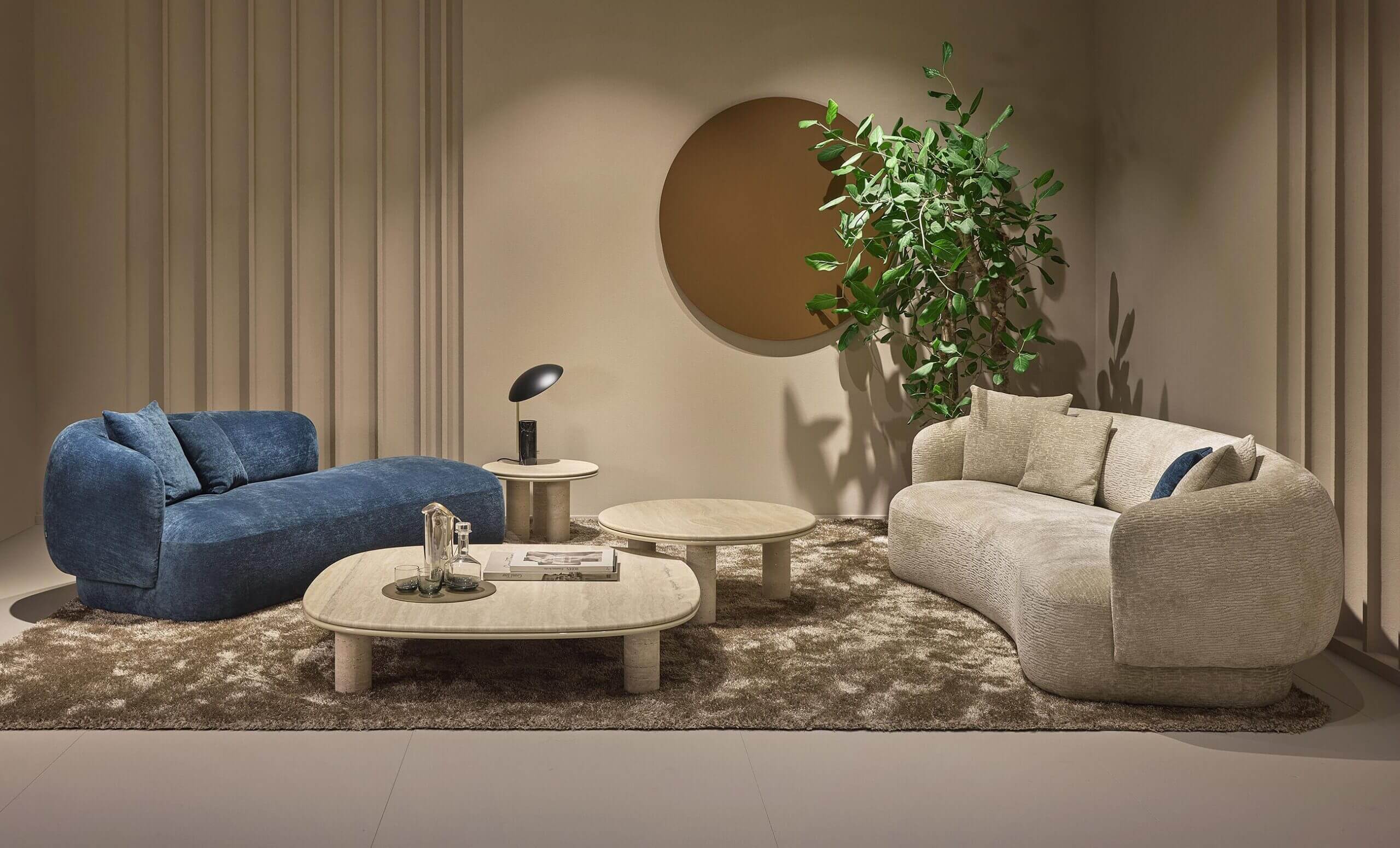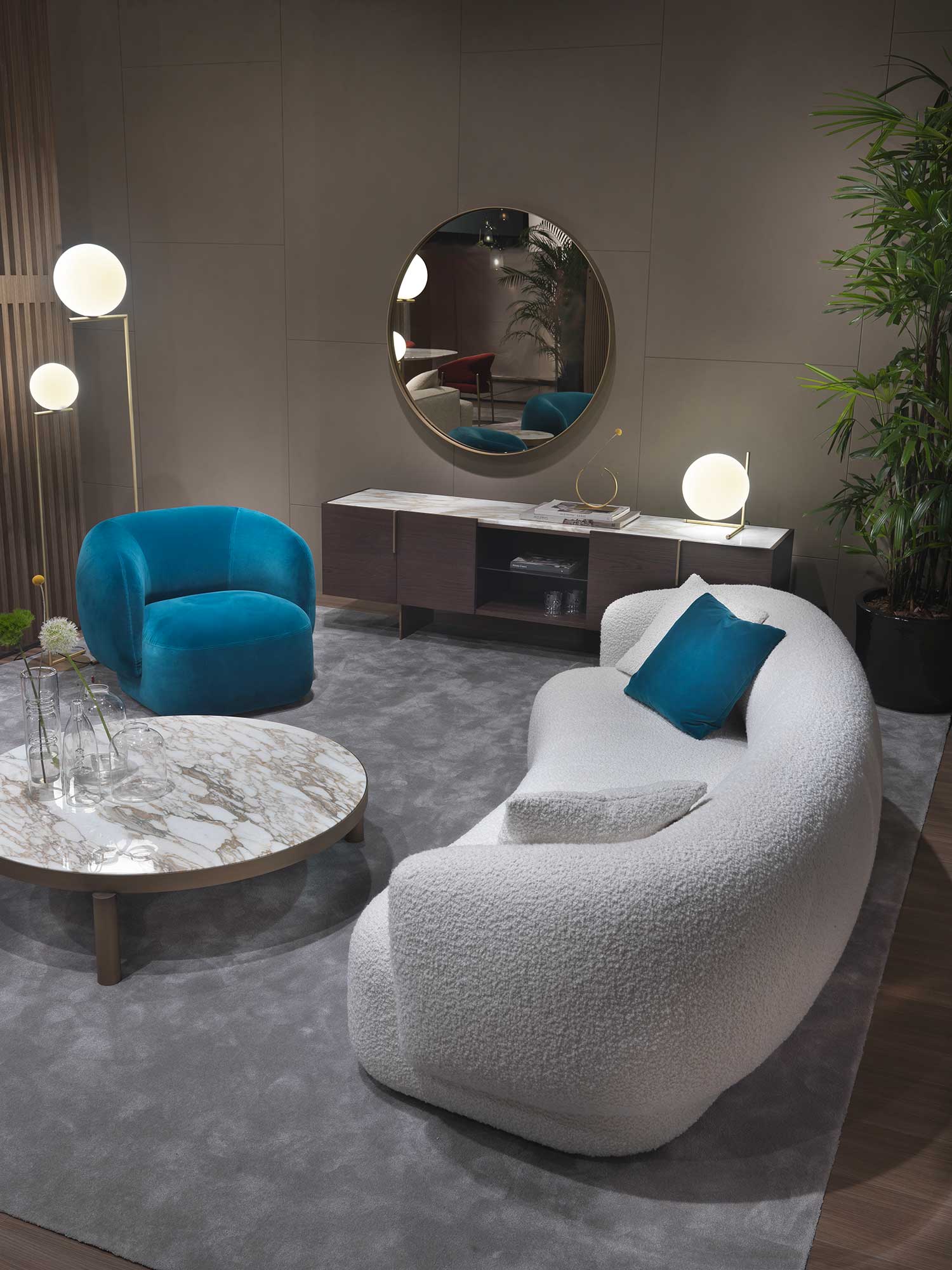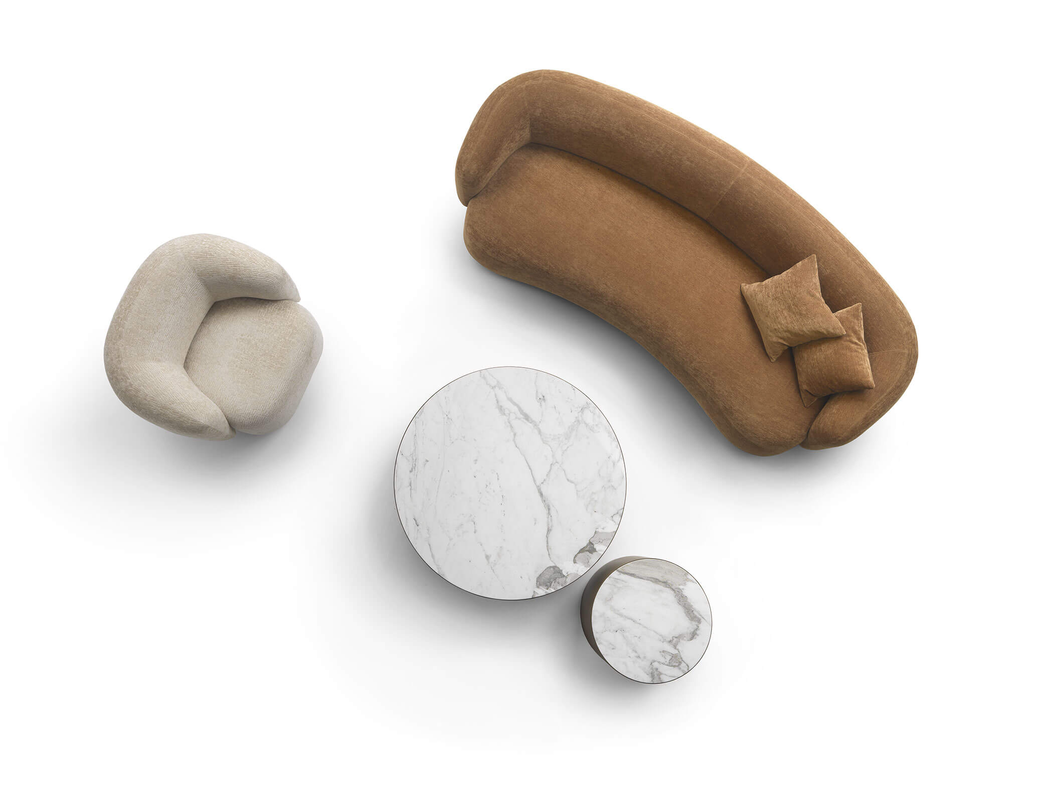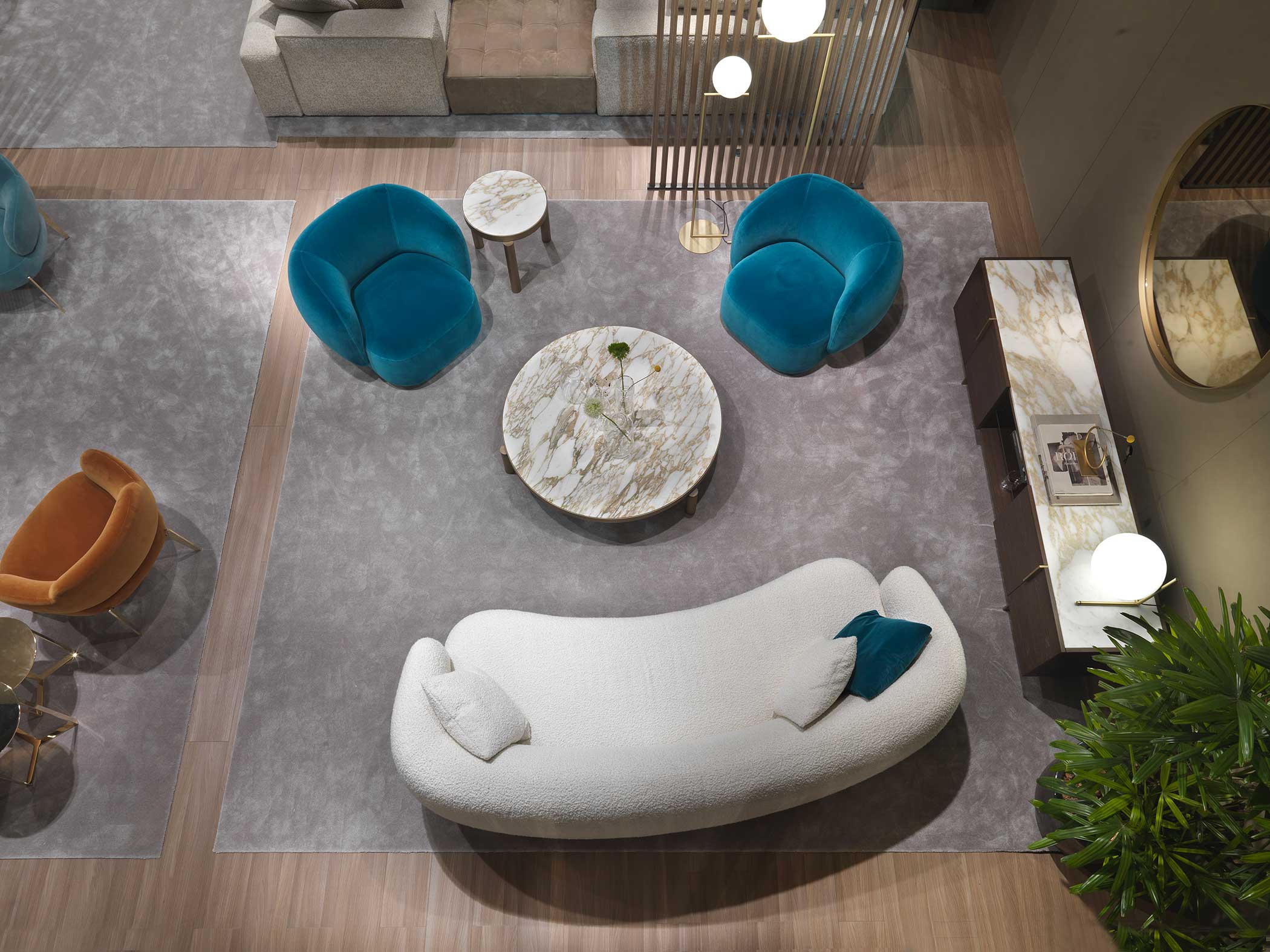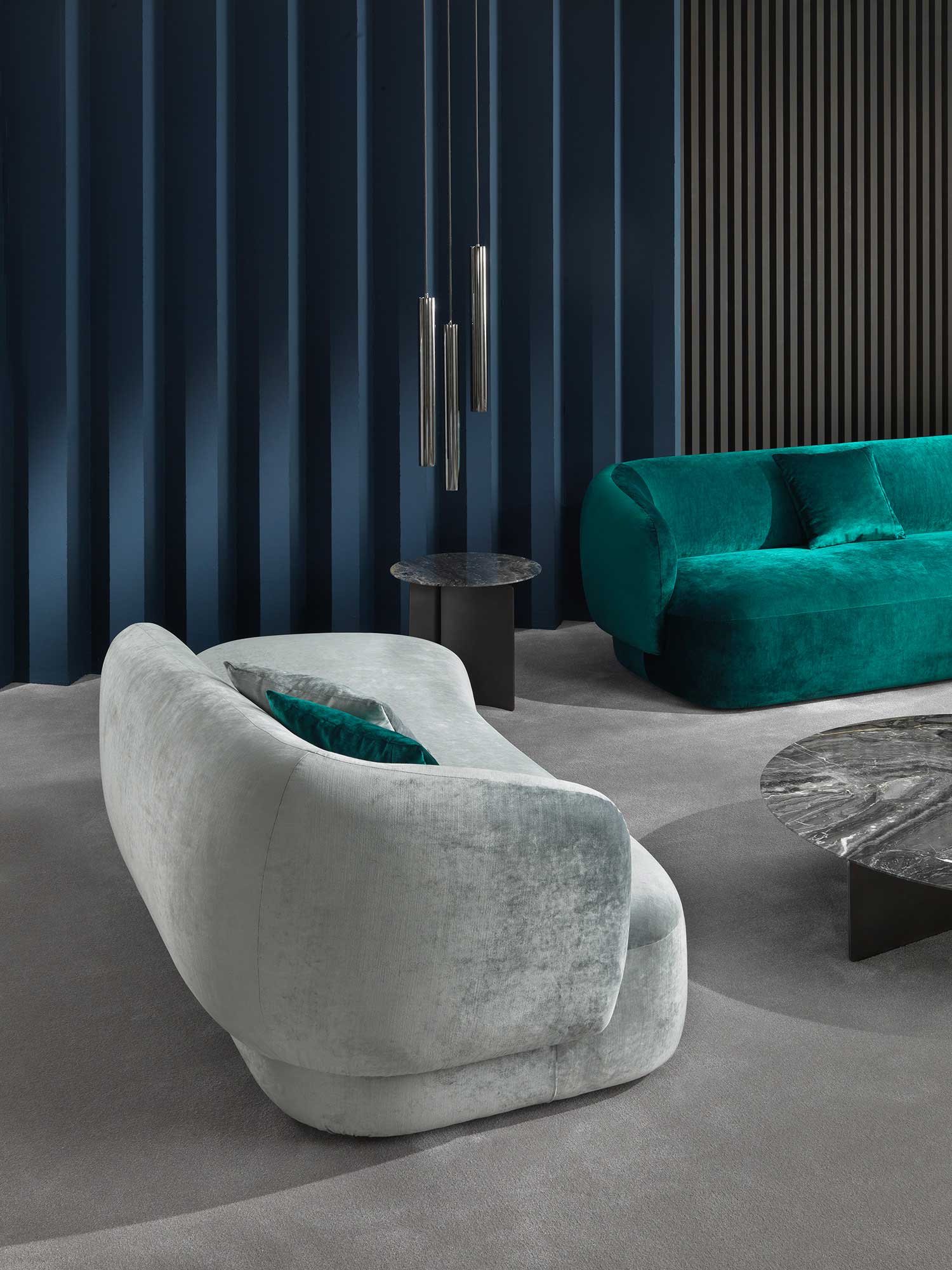 Noah sofas and armchairs are characterised by a sinuous, enveloping design with soft lines inspired by the charm of the 1970s. This style gives them a cosy and homely feel, perfect for creating a warm and comfortable ambience. The range of available sizes includes both curved and straight sofas, allowing them to adapt to different spaces and layouts.
