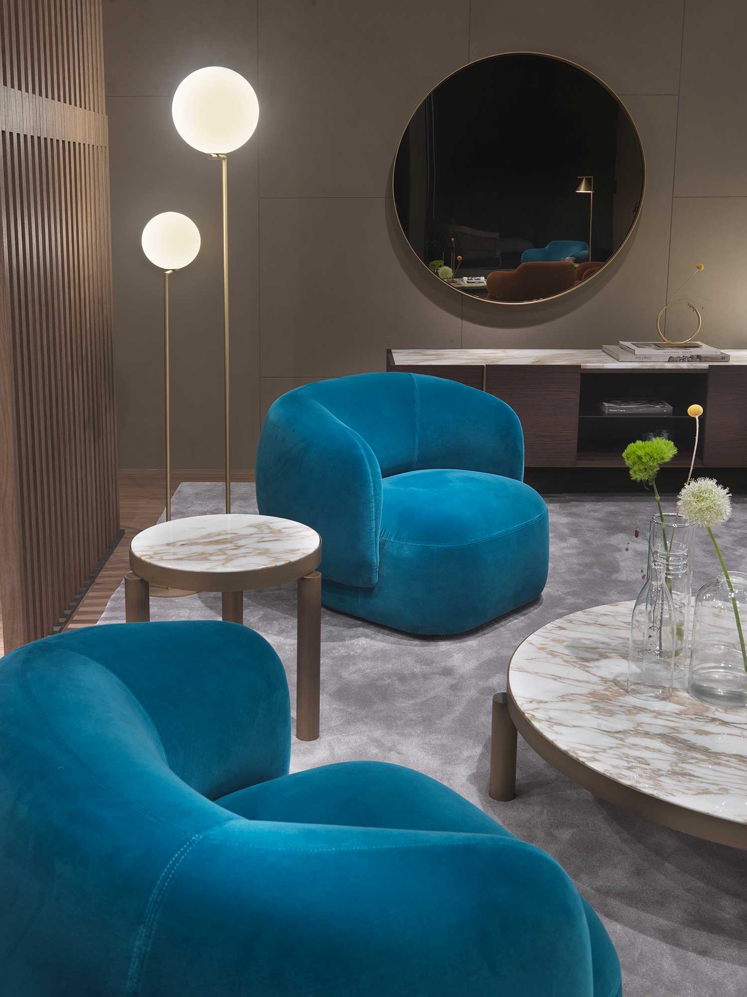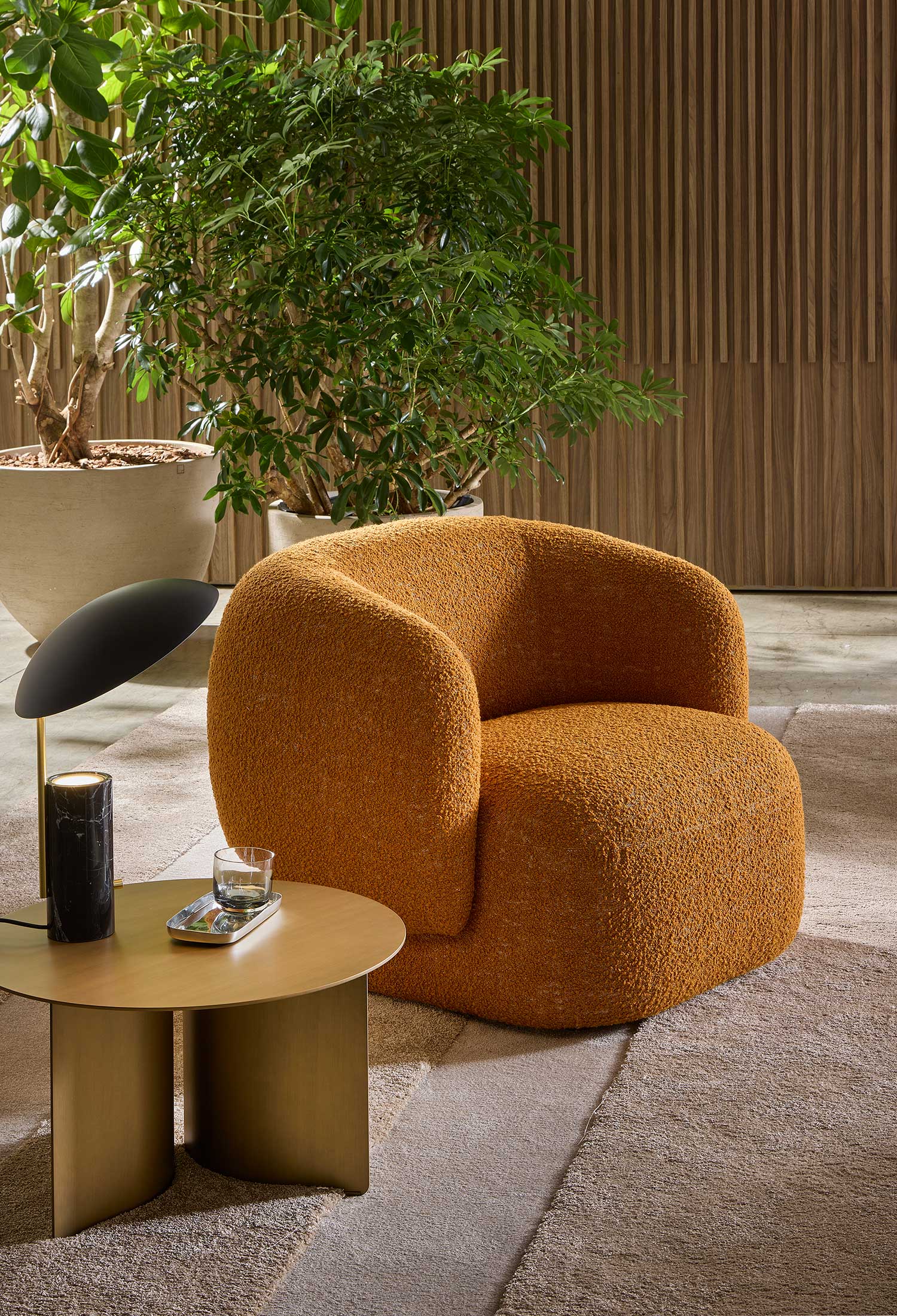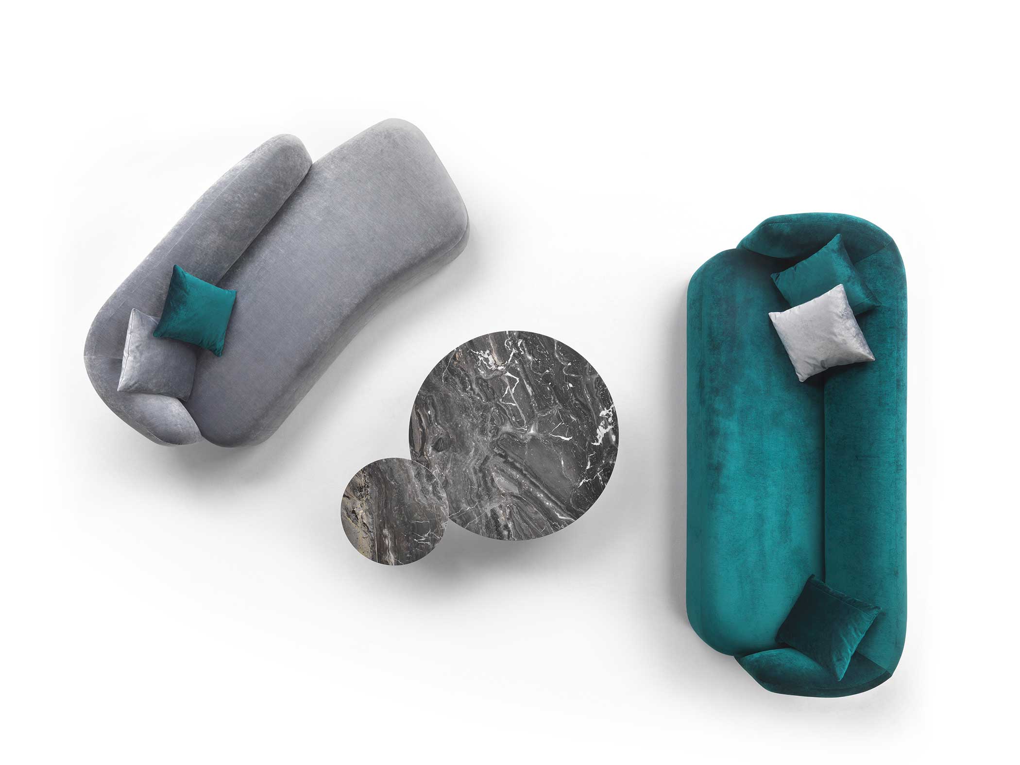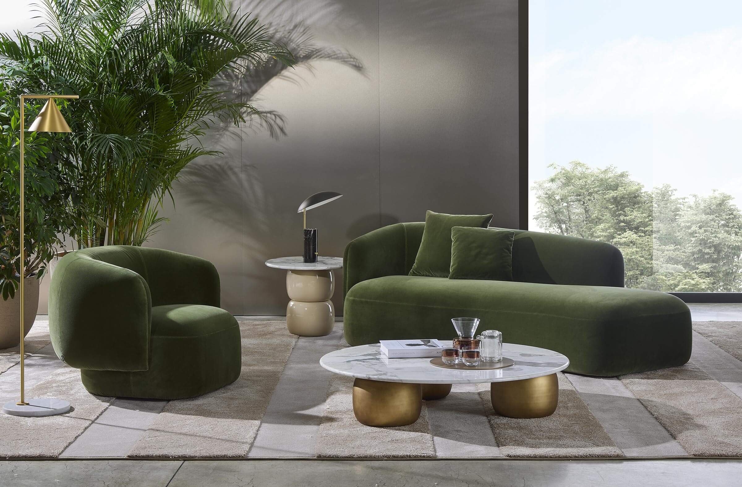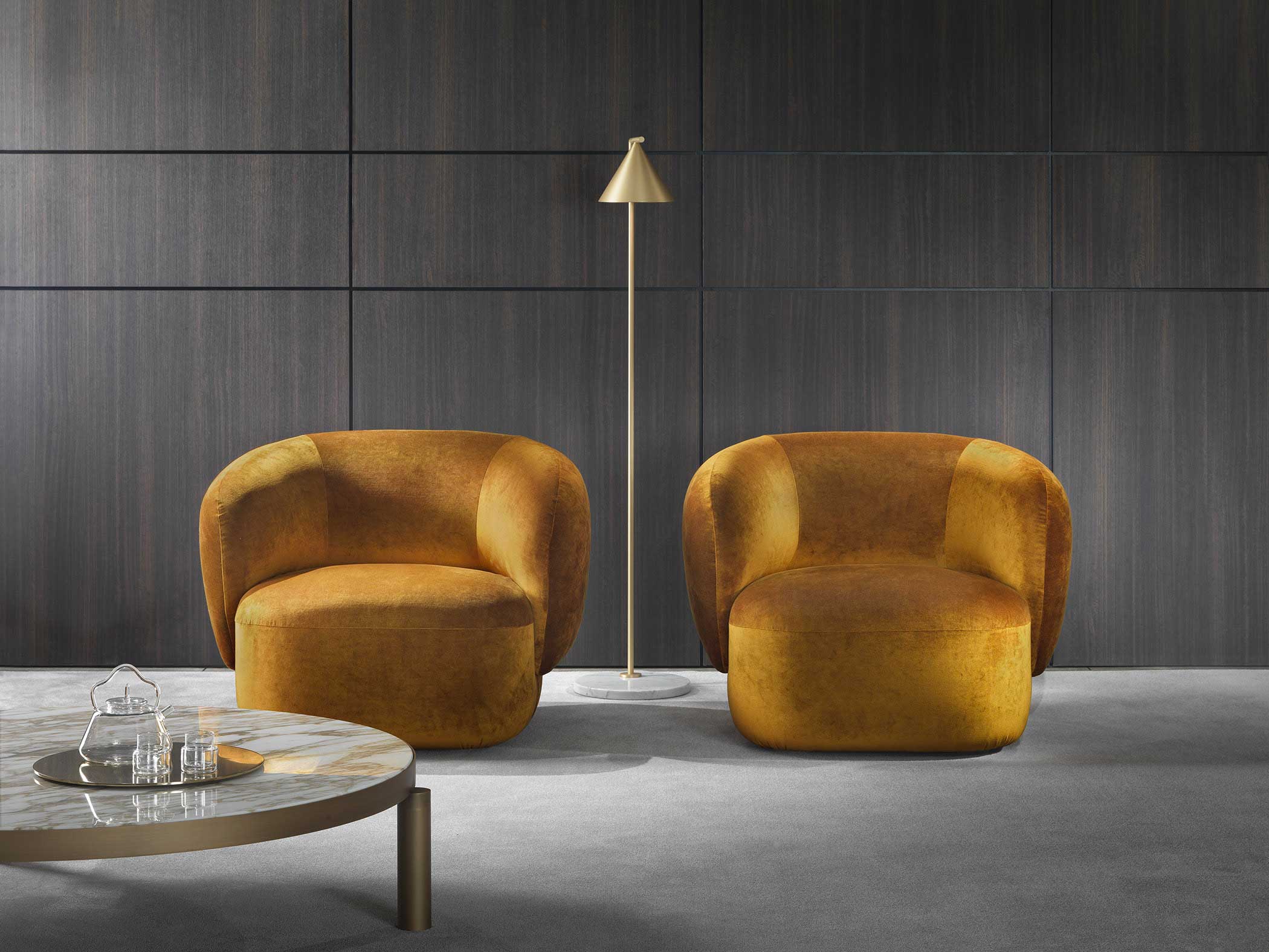 Noah sofas and armchairs are characterised by a sinuous, enveloping design with soft lines inspired by the charm of the 1970s. This style gives them a cosy and homely feel, perfect for creating a warm and comfortable ambience. The range of available sizes includes both curved and straight sofas, allowing them to adapt to different spaces and layouts.