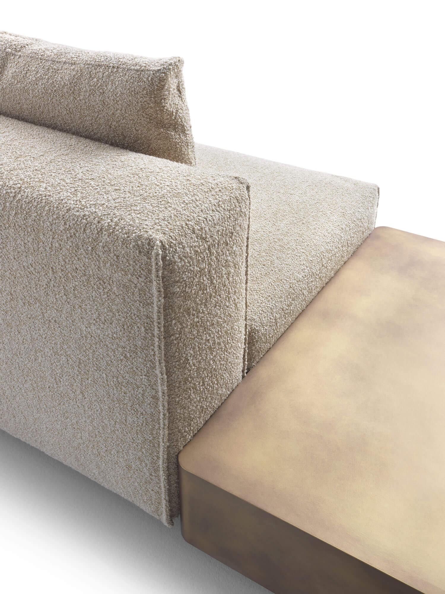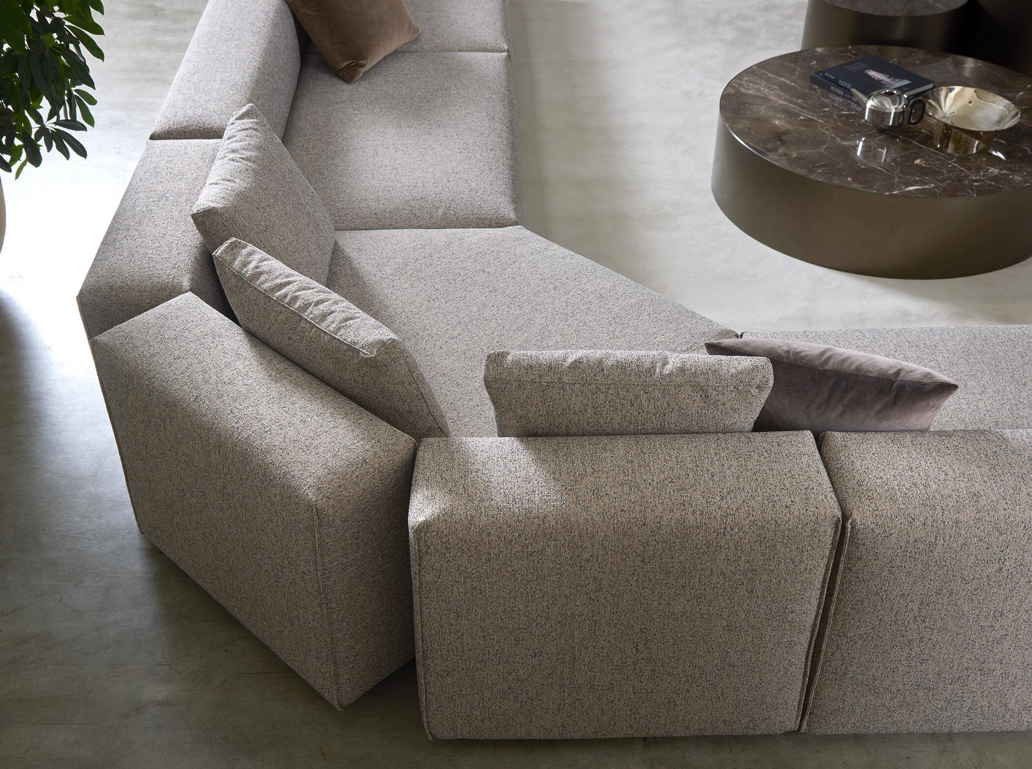 Yann stands out for its high level of comfort and meticulous attention to detail. A distinctive element is the vertical edged seam, which enhances the design with a sartorial touch. For those who want even more original solutions, it is possible to configure the sofa with non-straight corner elements, creating dynamic compositions with a strong visual impact.