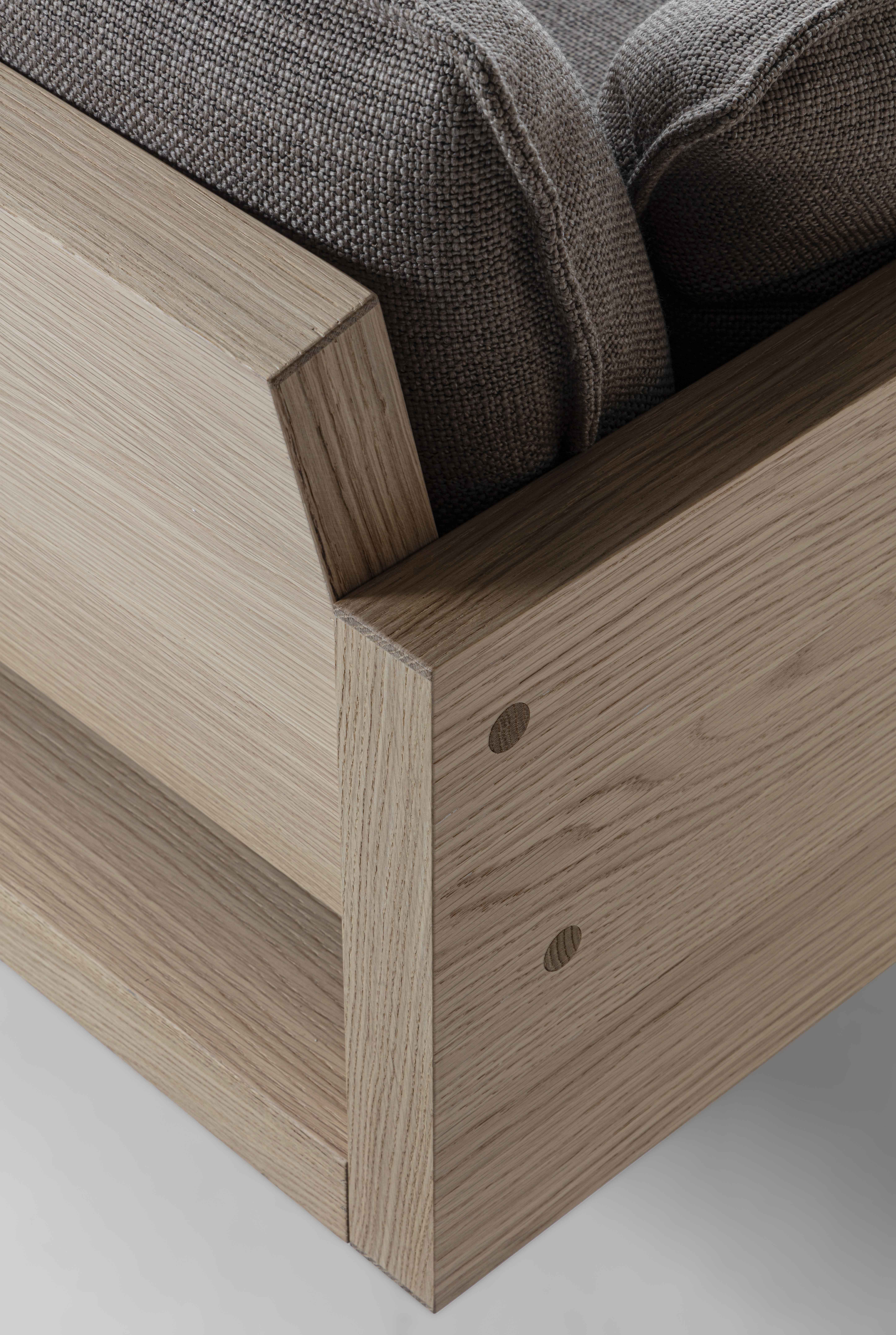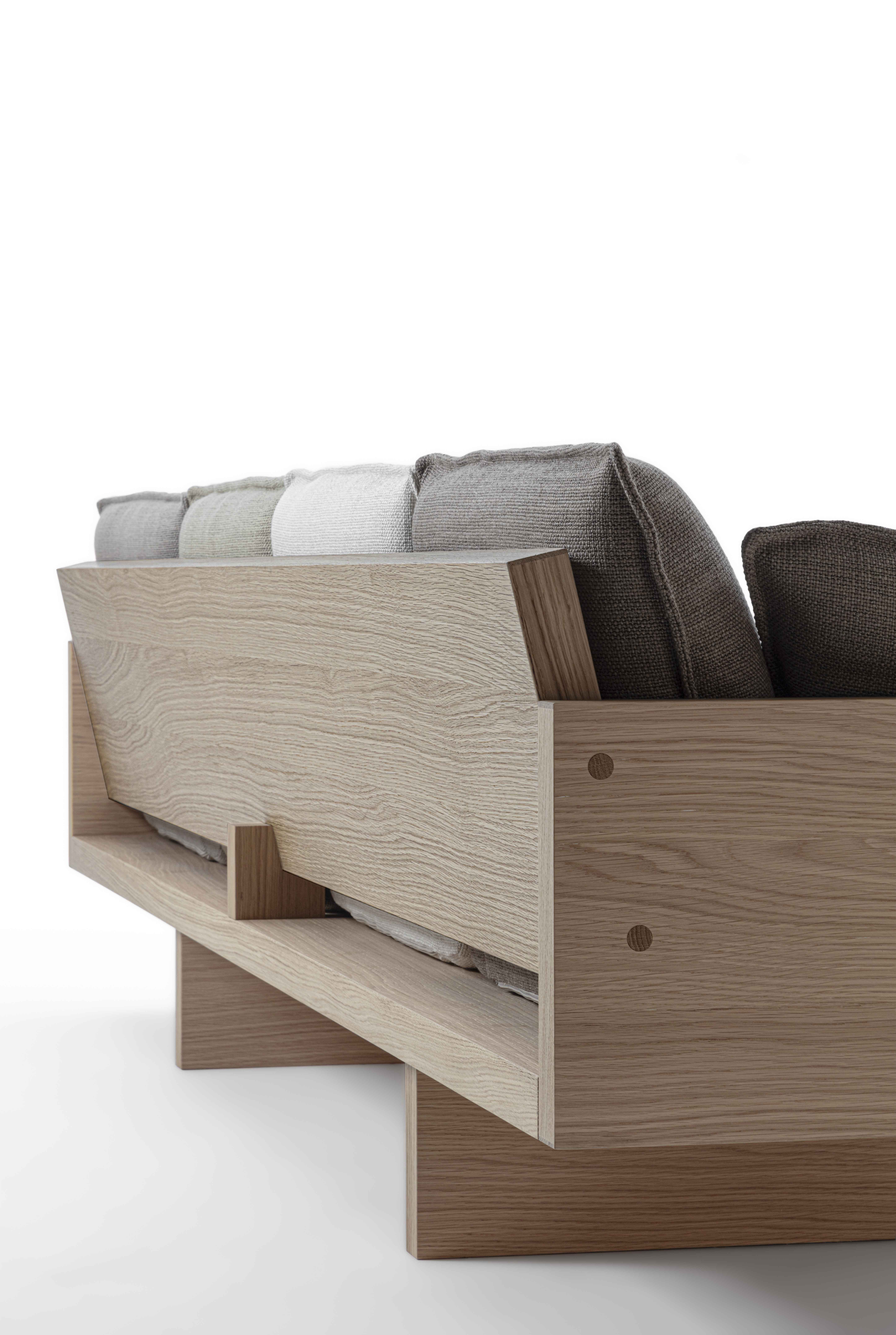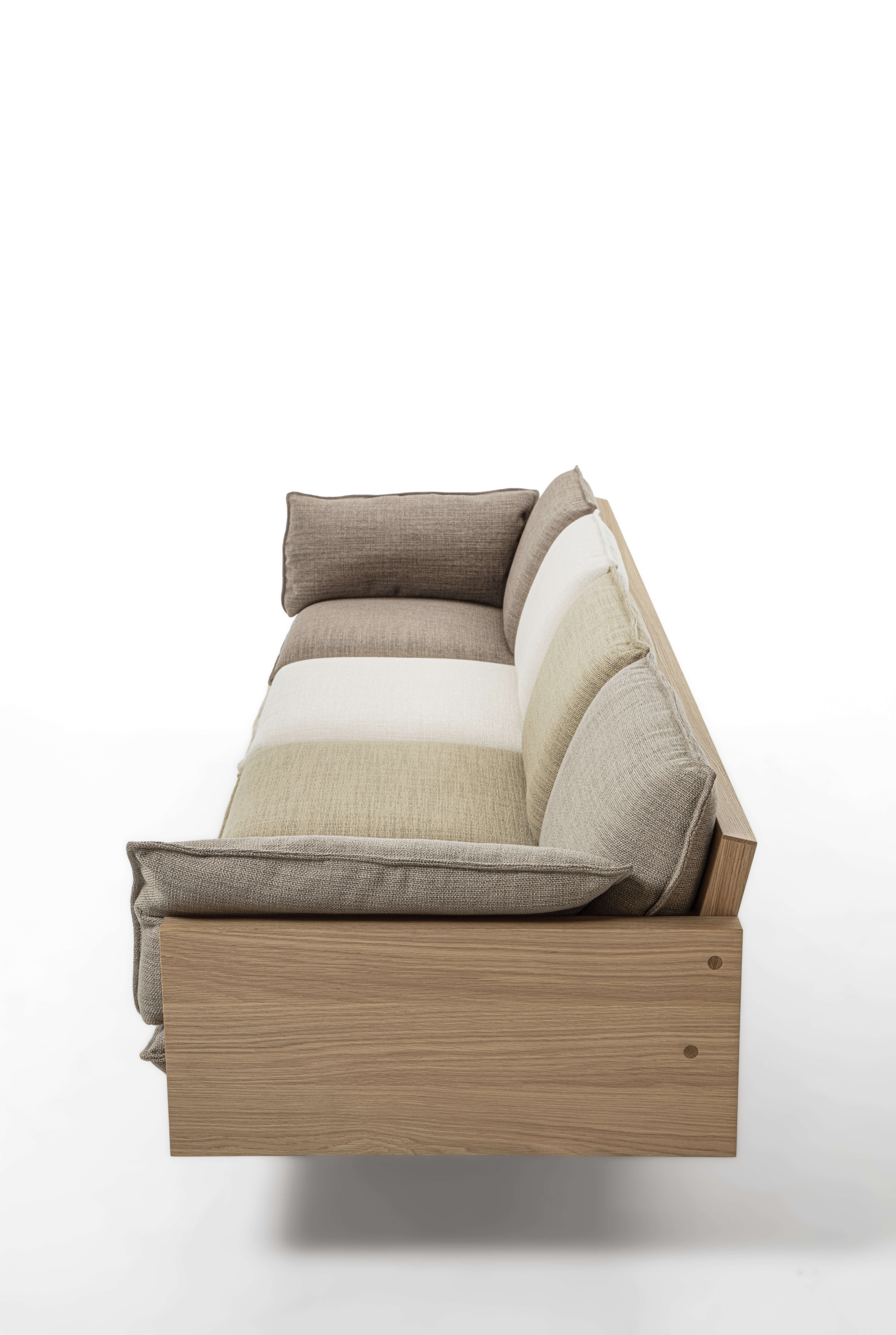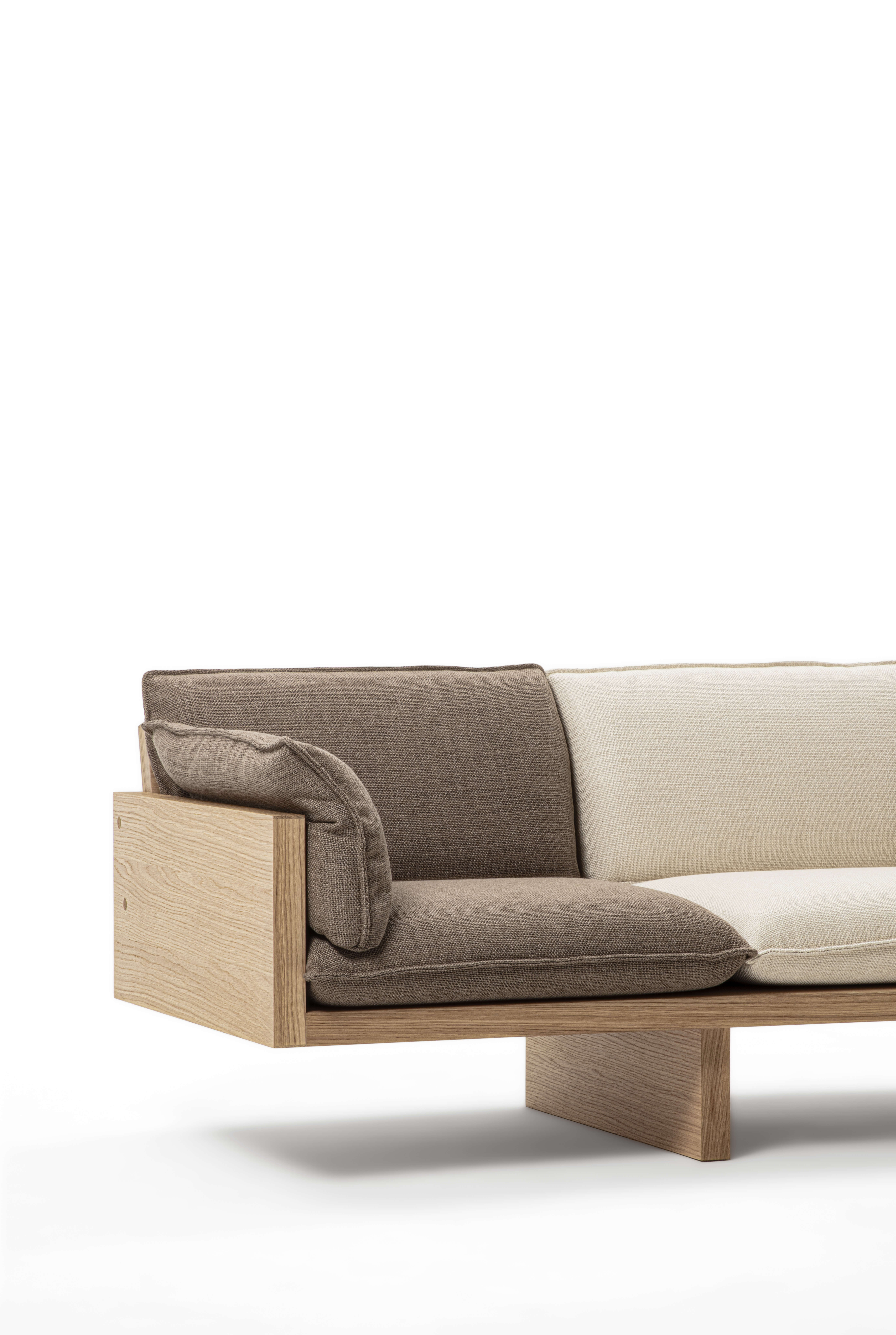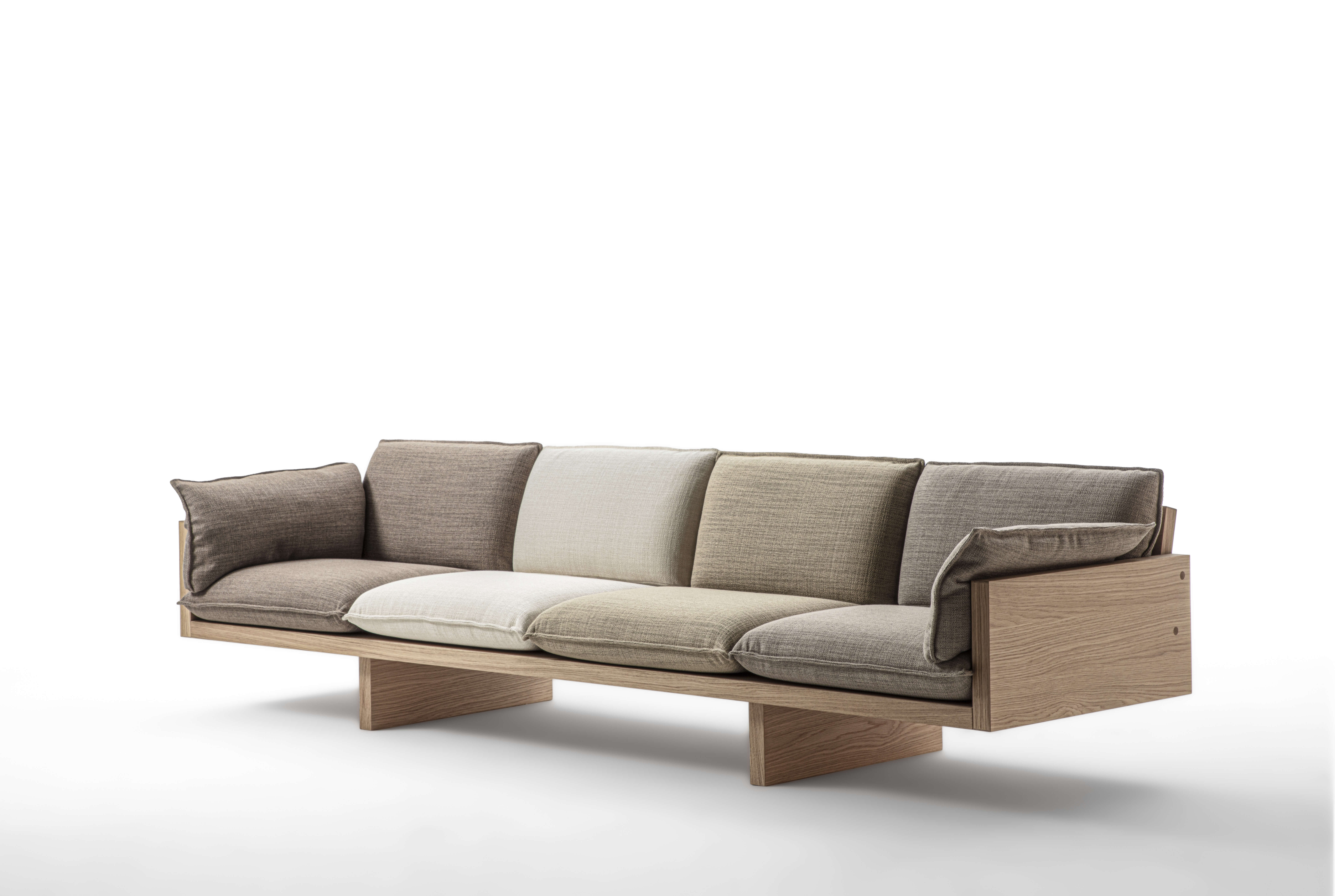 A sofa crafted with a wooden frame and adorned in either fabric or leather upholstery that encompasses seating, backrests, and armrests.