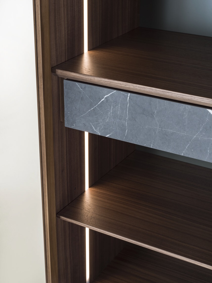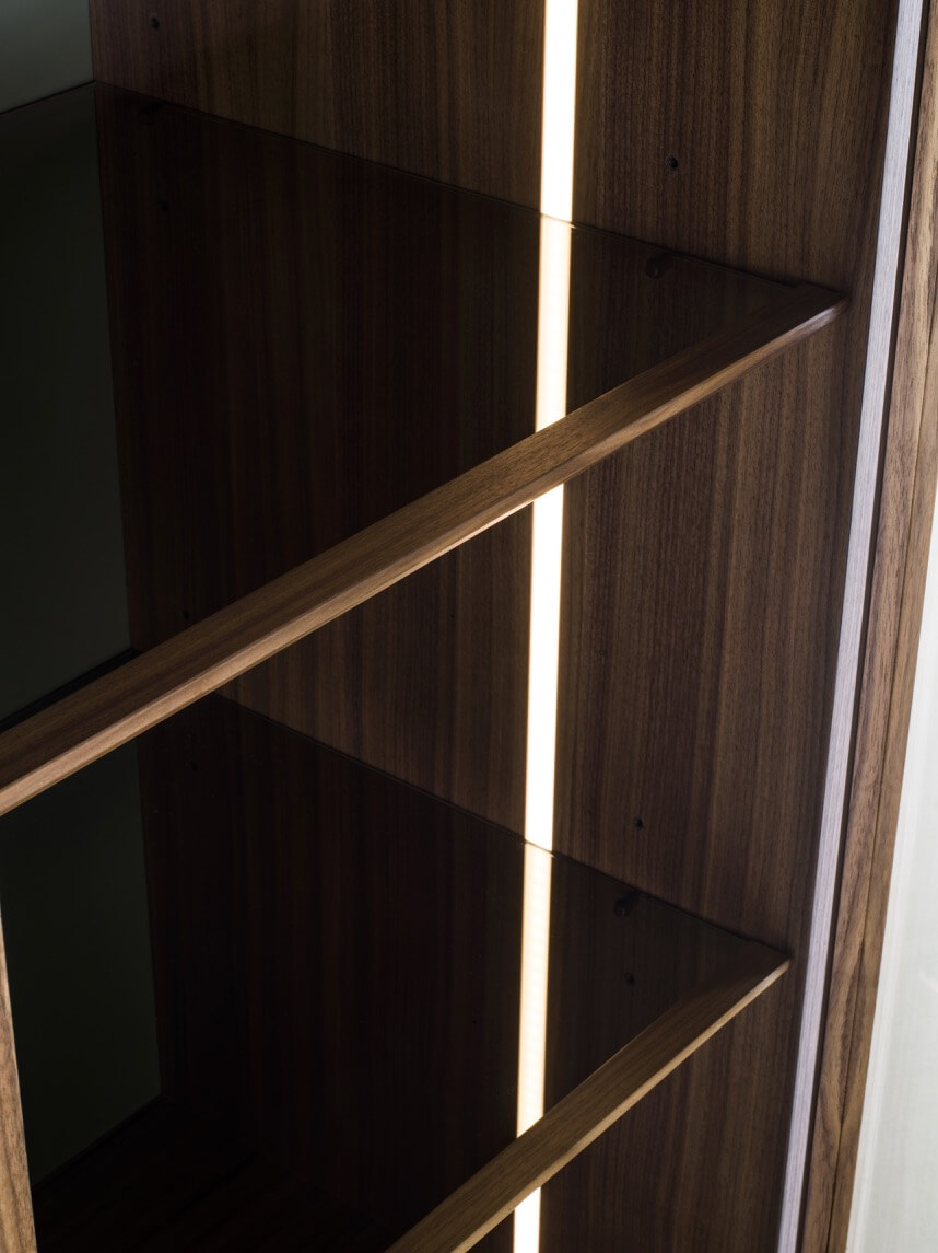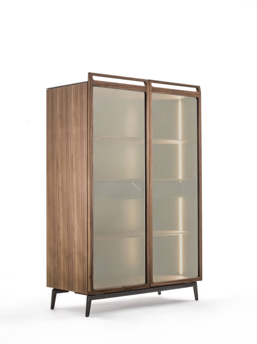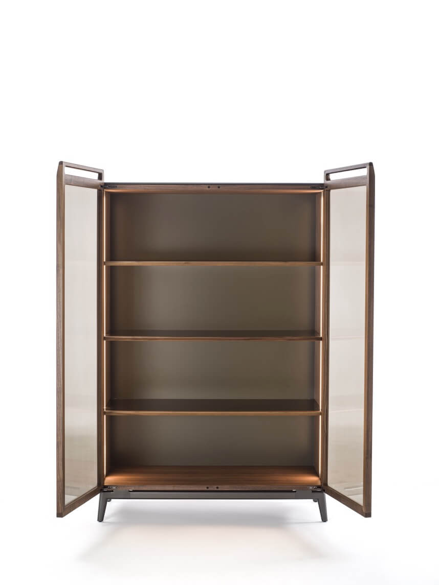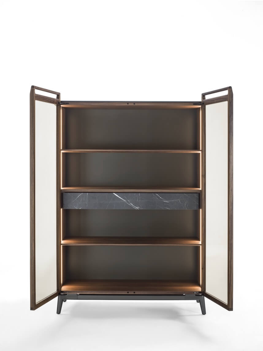 Cupboard in wood with two glass doors and solid wood handle. The top is in wood or porcelain stoneware and the base in metal. The internal division is characterized by wooden shelves, drawer (optional) with front as the top and led lighting.