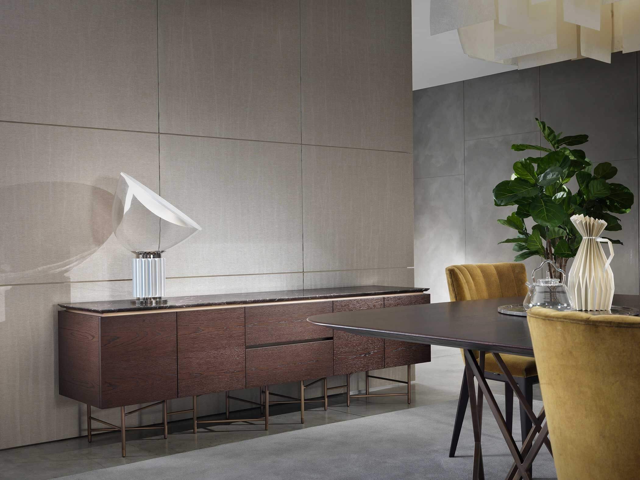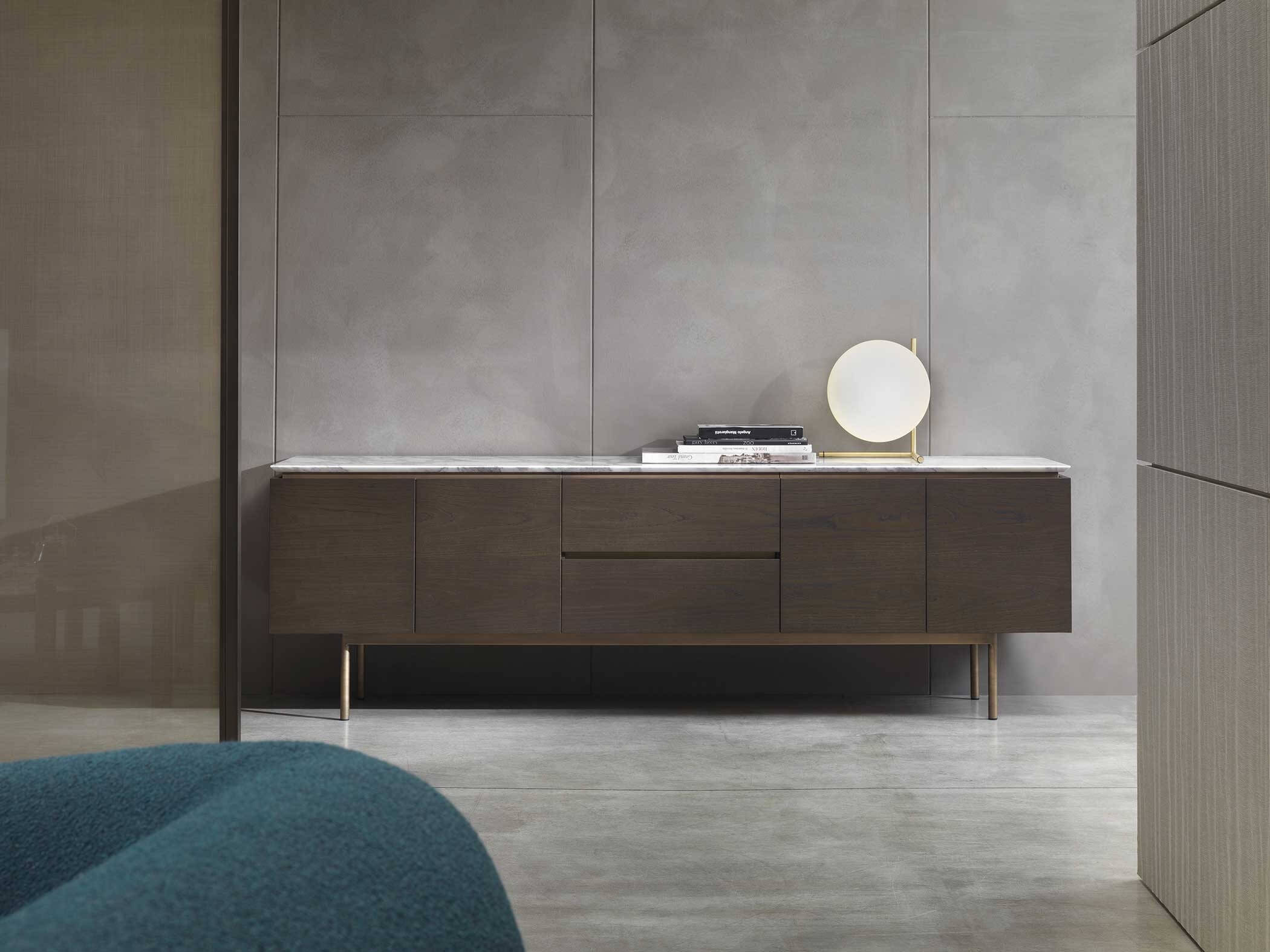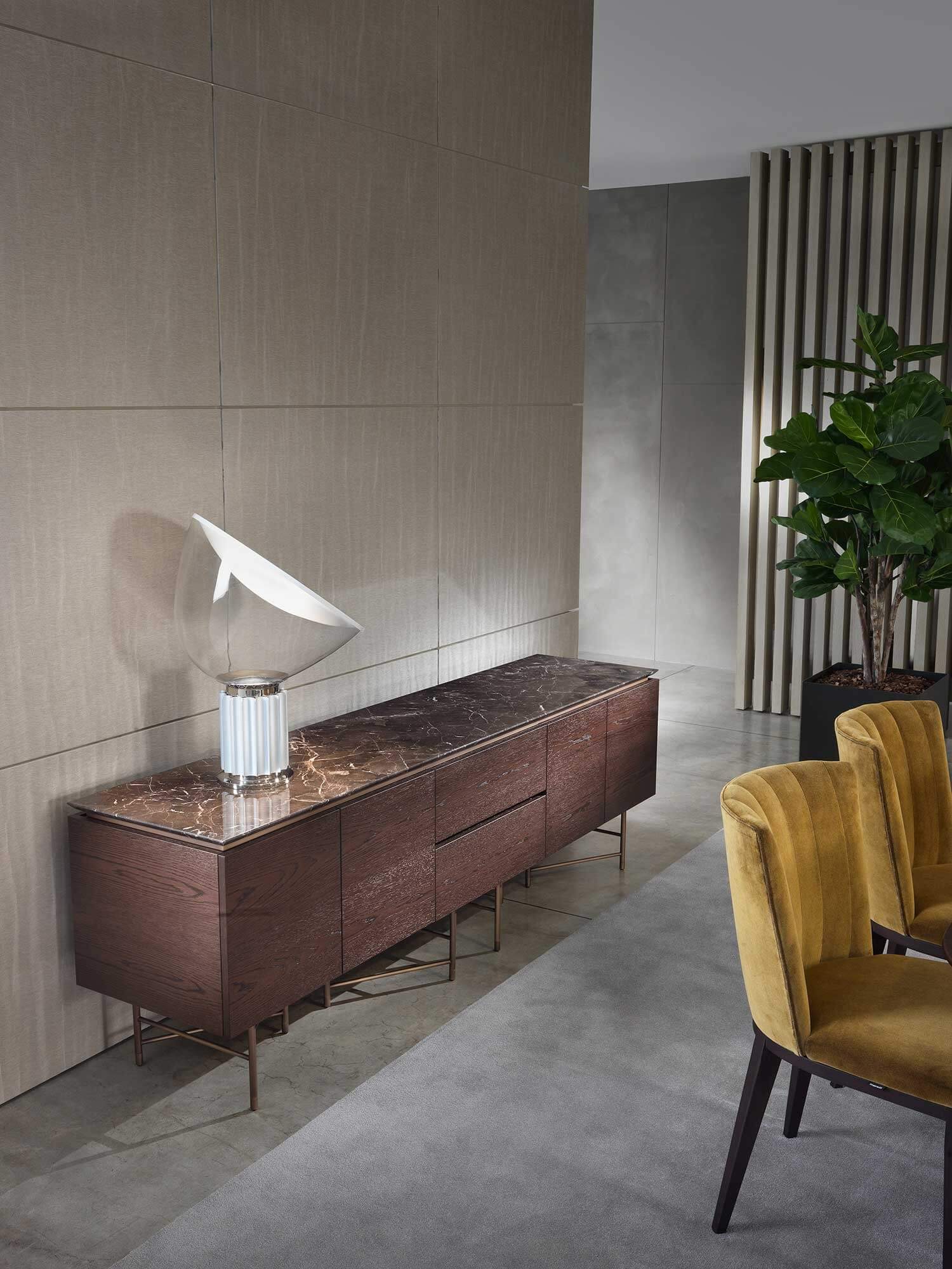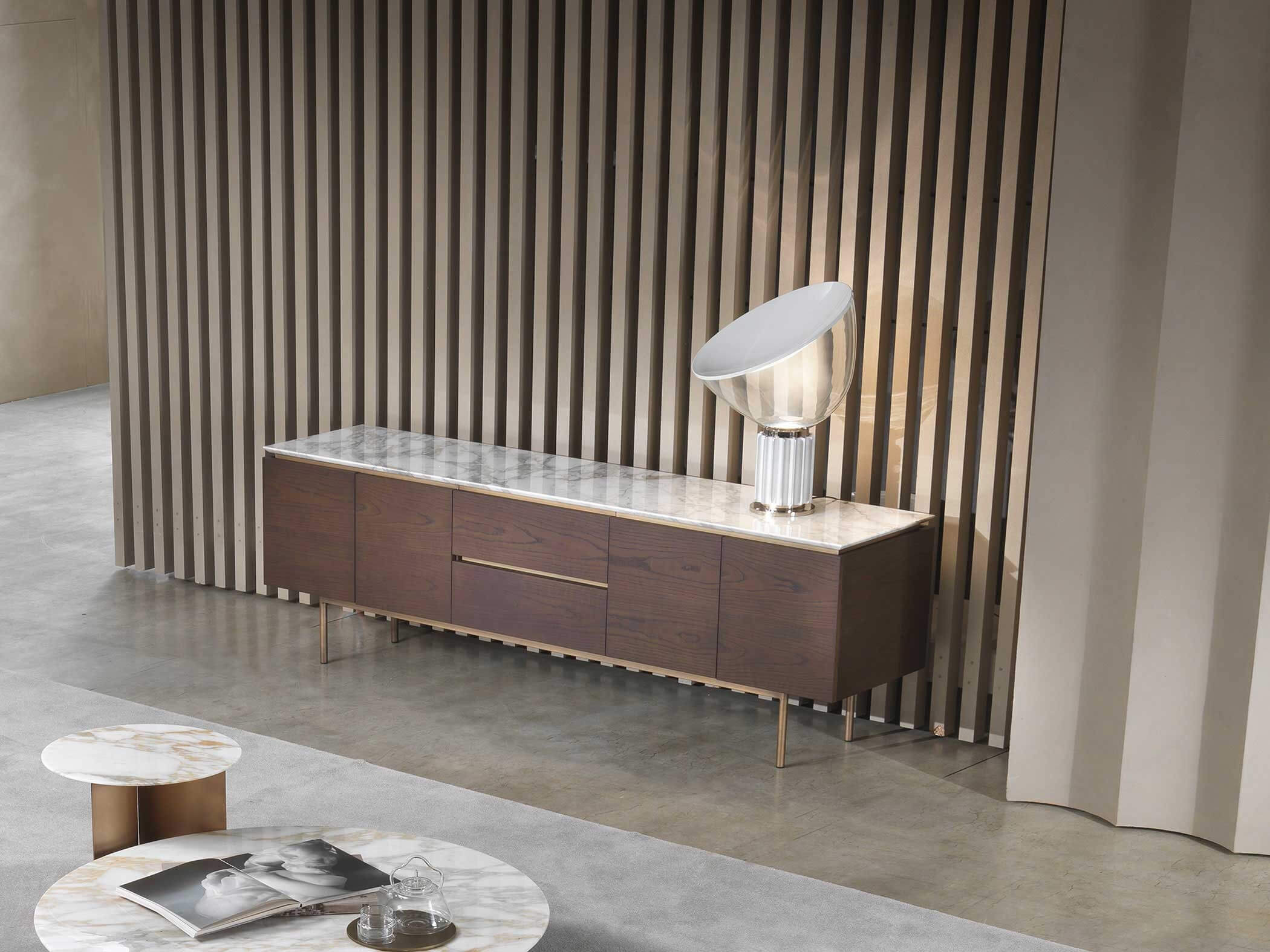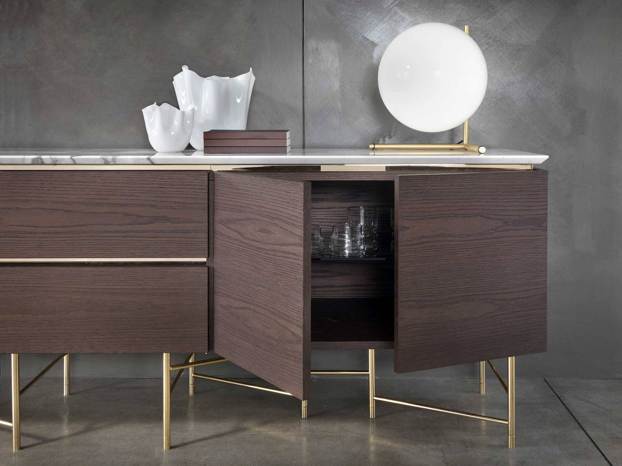The top is available in marble, glass and wood, offering a wide choice of finishes to suit the desired taste and furnishing style. The base units are available in three different versions: floor-standing, raised with four legs or, the most iconic, with six legs that echo those of the tables.