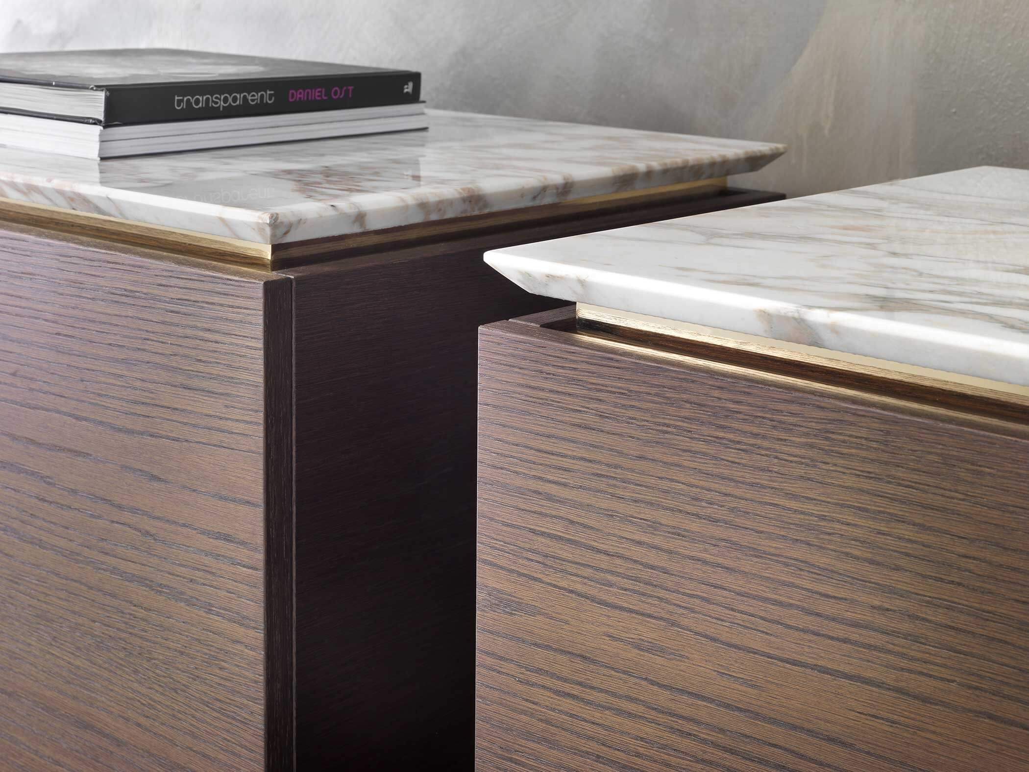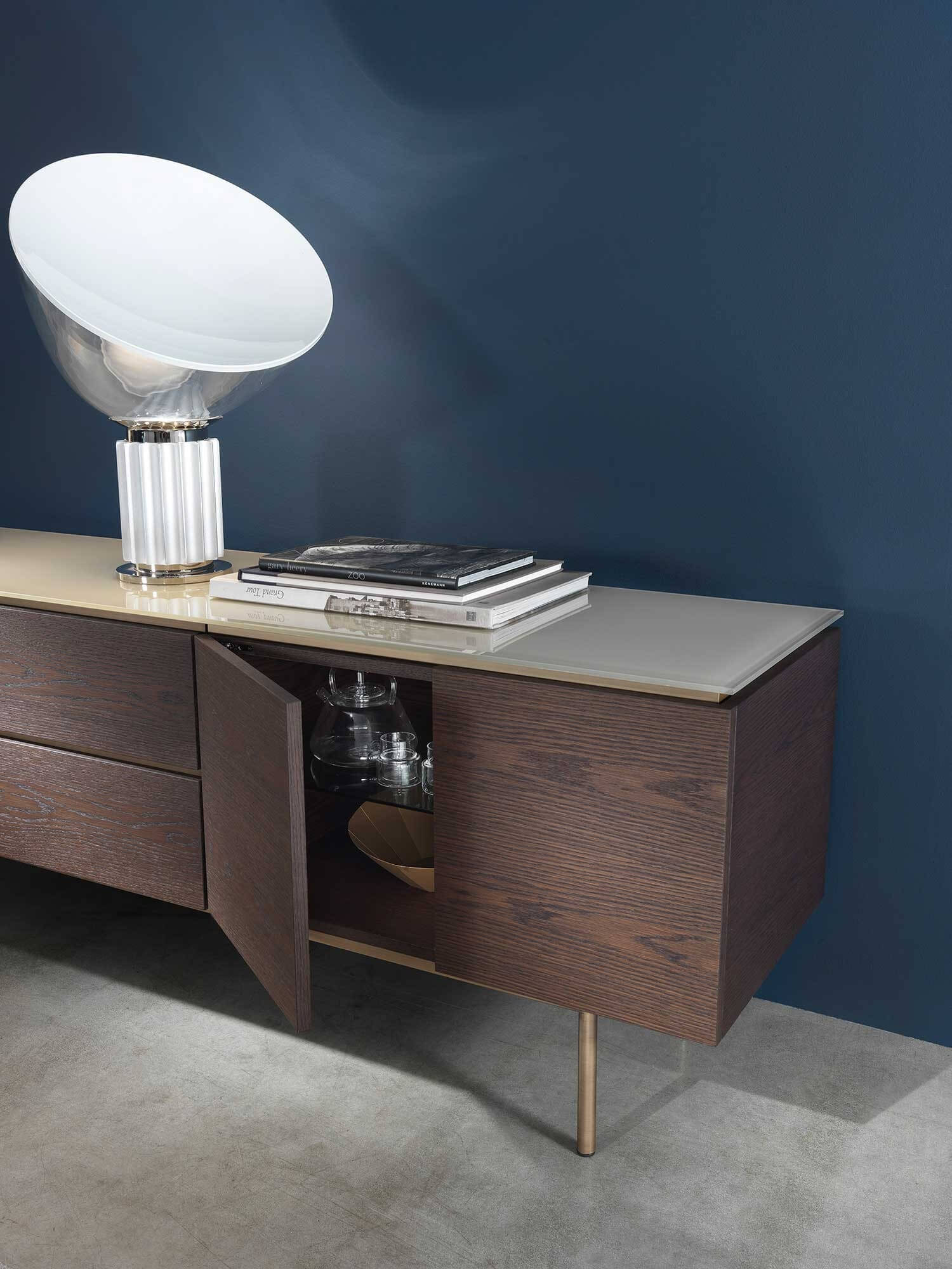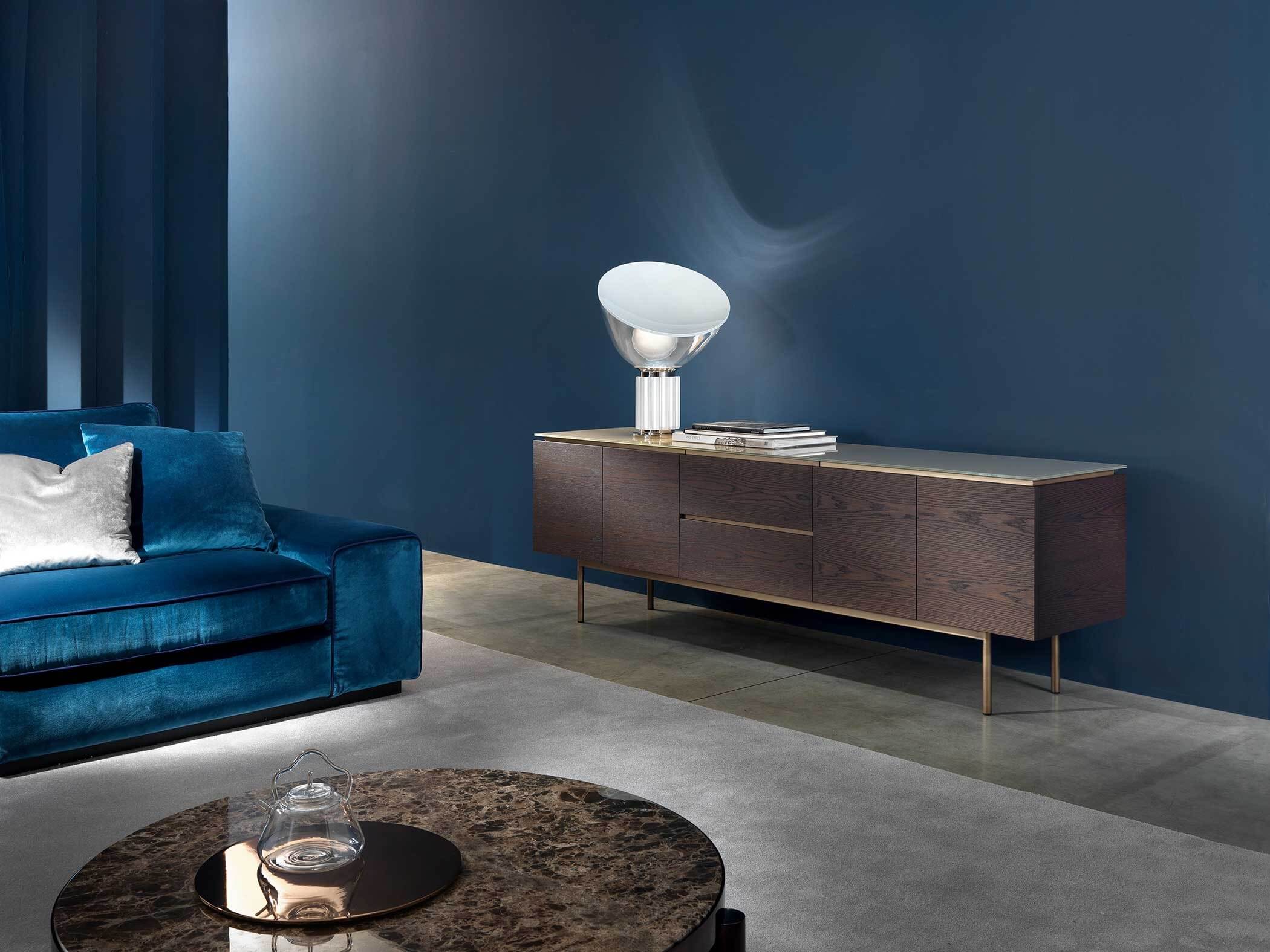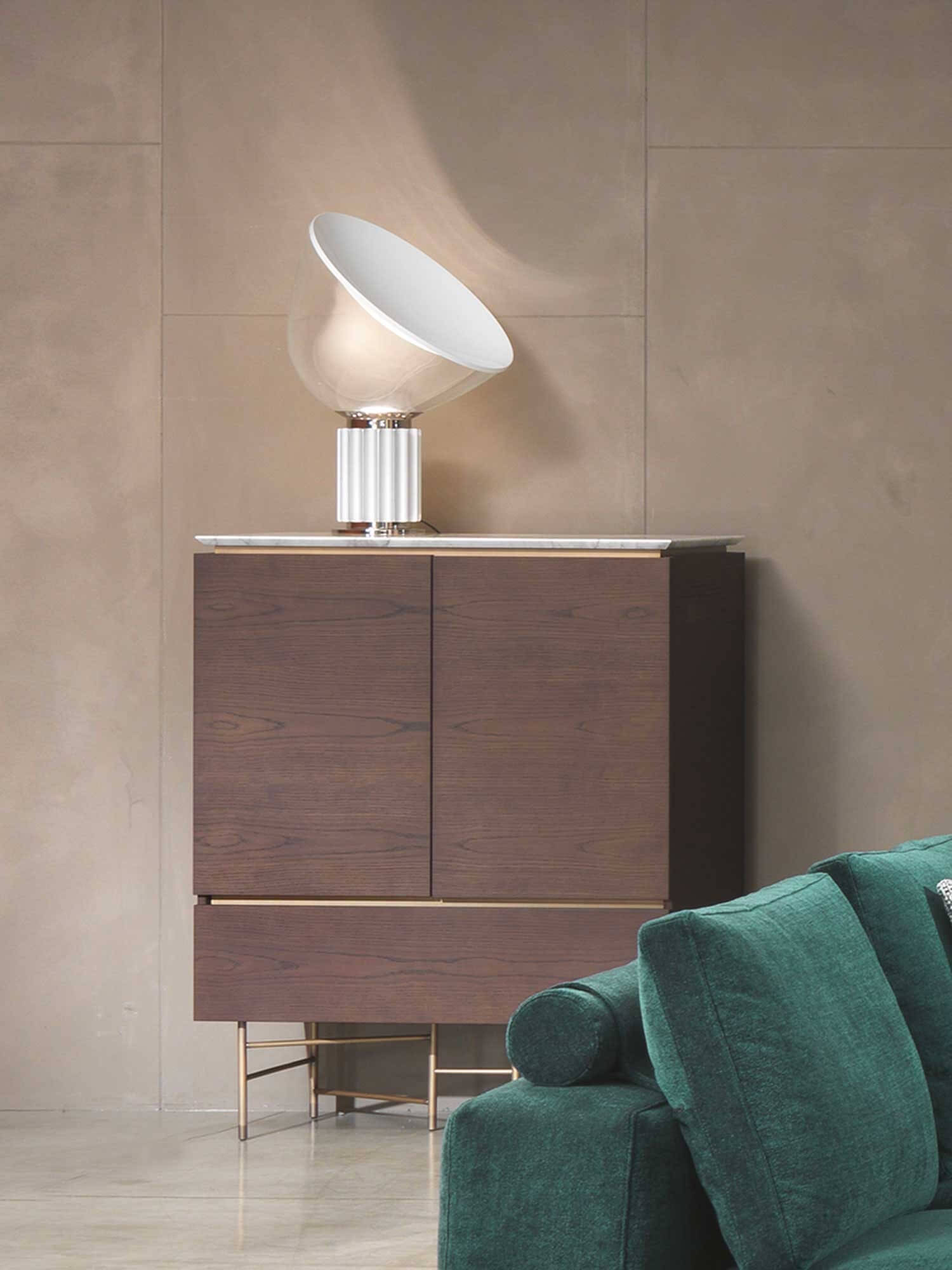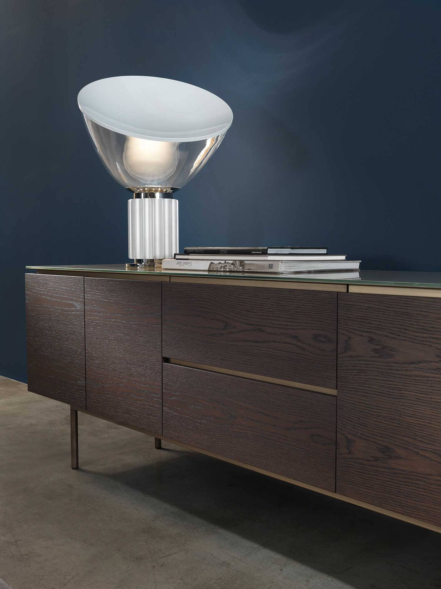 The top is available in marble, glass and wood, offering a wide choice of finishes to suit the desired taste and furnishing style. The base units are available in three different versions: floor-standing, raised with four legs or, the most iconic, with six legs that echo those of the tables.
