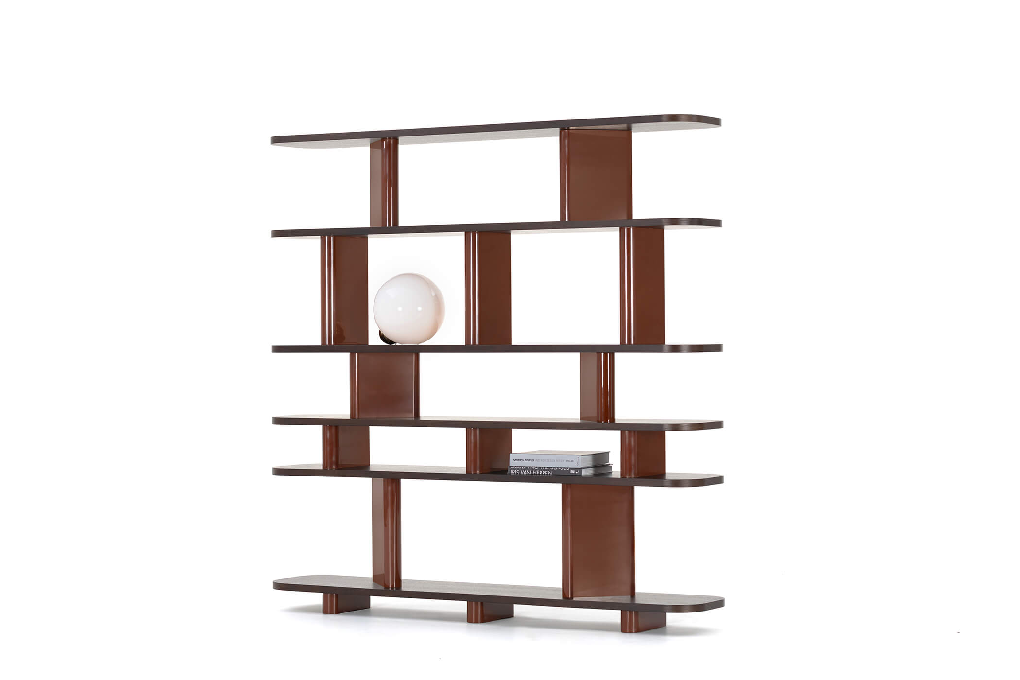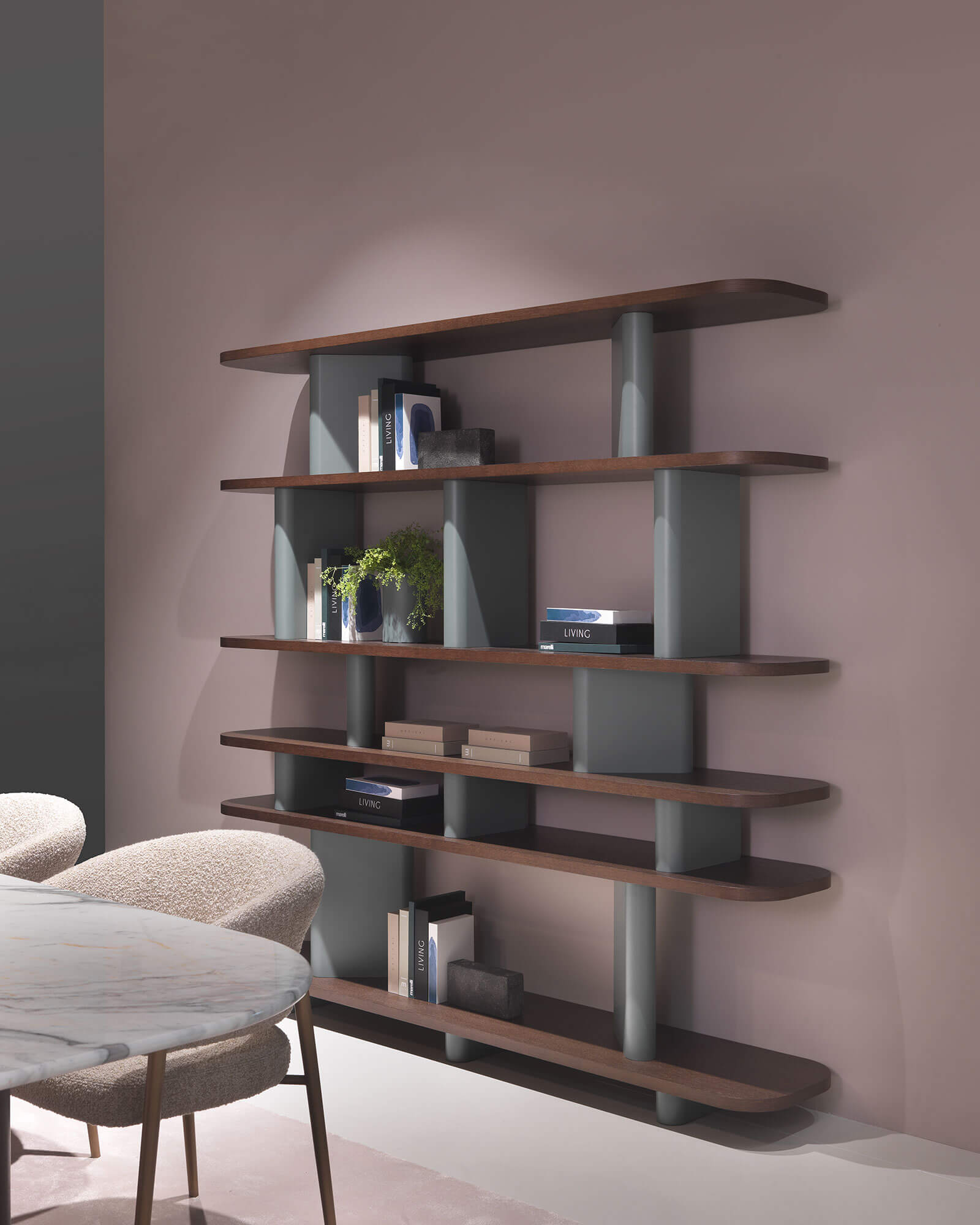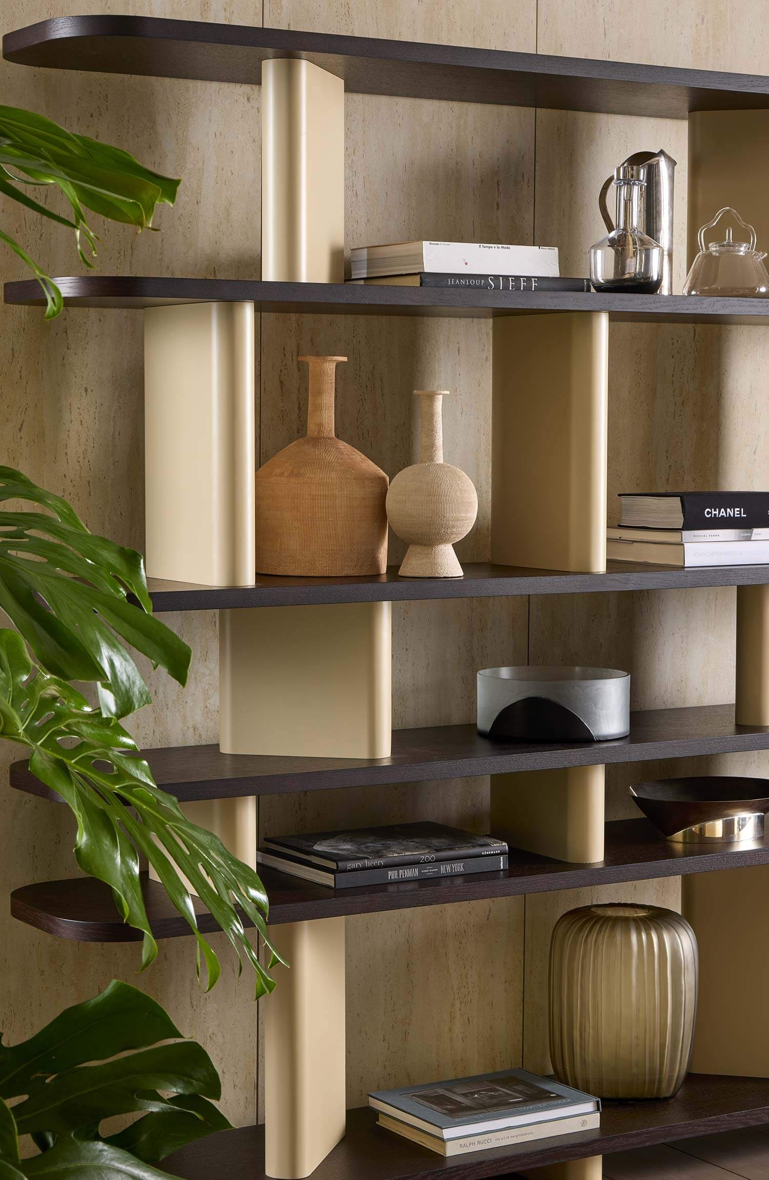 A distinctive feature is the possibility to customise the wooden shelves, offering over 15 different types of finishes to choose from. This choice allows you to adapt the bookcase to your own style and preferences, creating a unique and customised décor. In addition, the vertical elements can be lacquered gloss or matt, or painted with a delabré or pewter metallic finish.