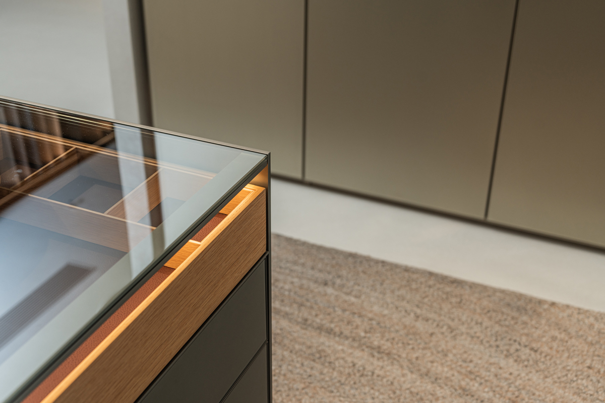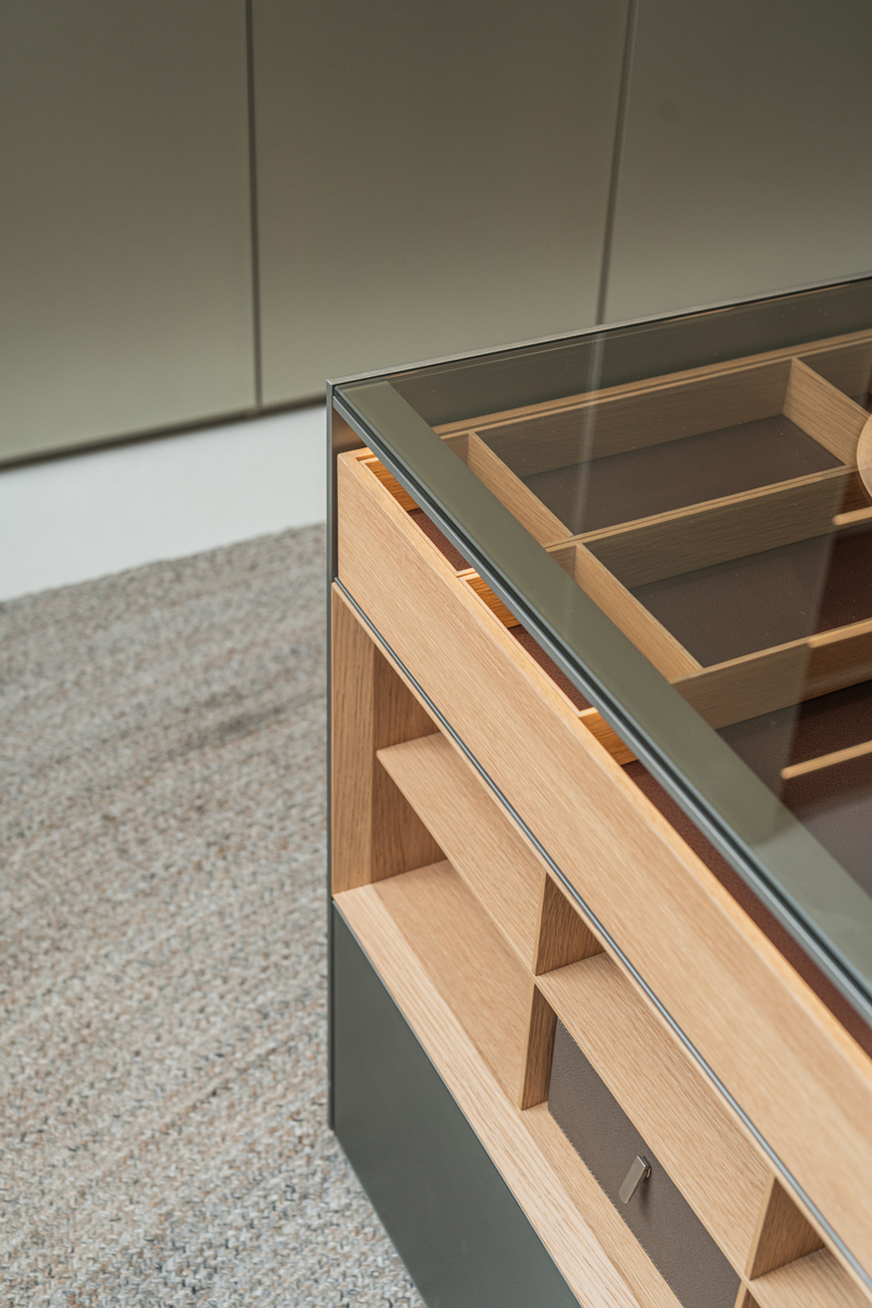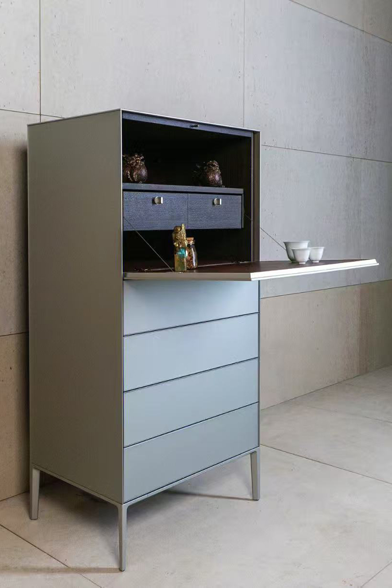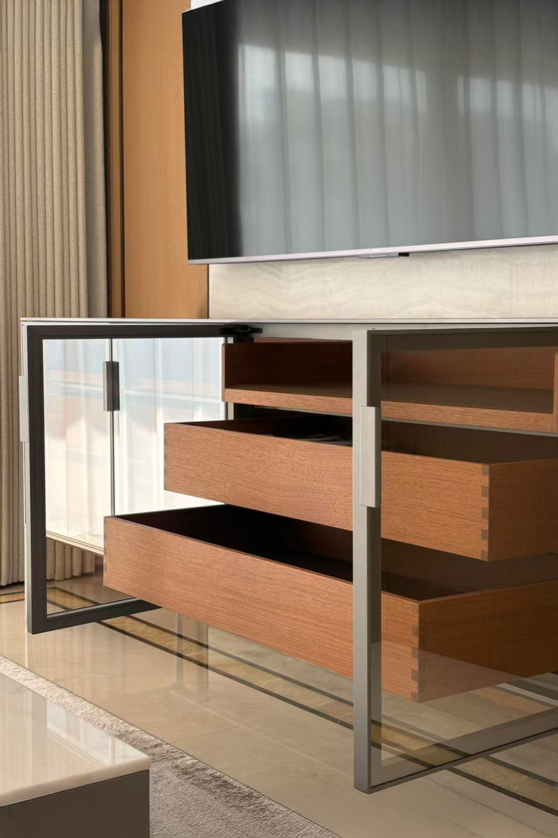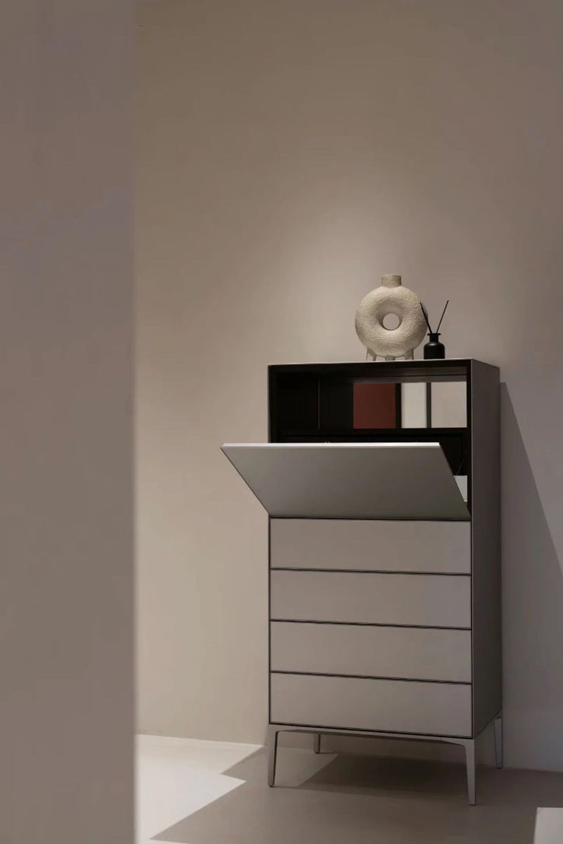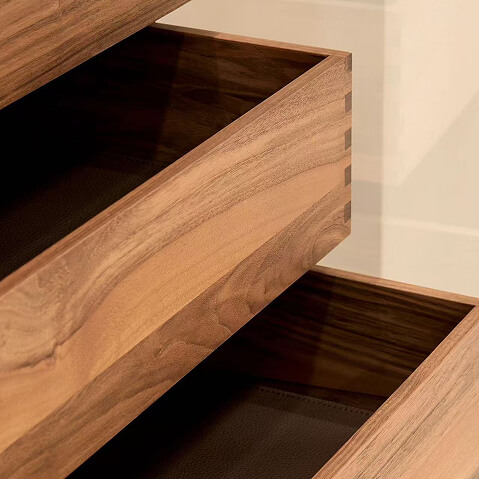 Inside, walnut-veneered drawers constructed with traditional dovetail joints provide both aesthetic appeal and structural integrity. Suspended on concealed internal structures, these drawers appear to float within the cabinet, emphasizing the minimalist design.