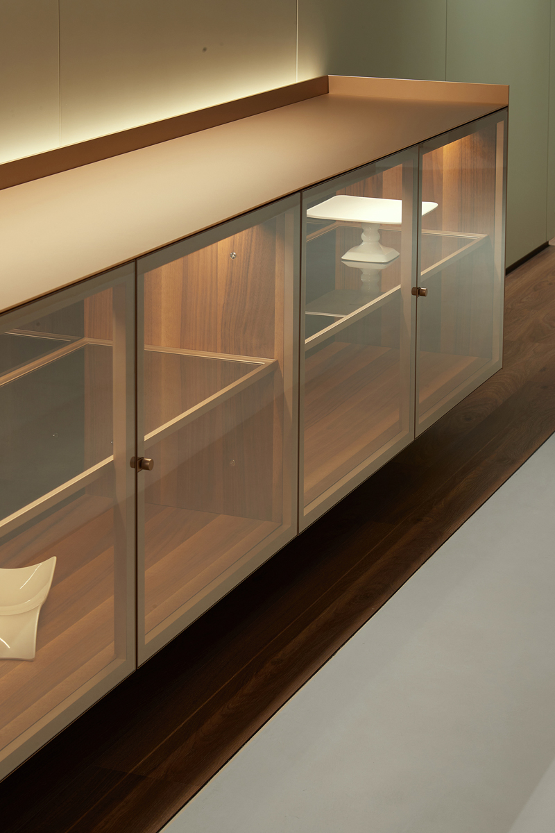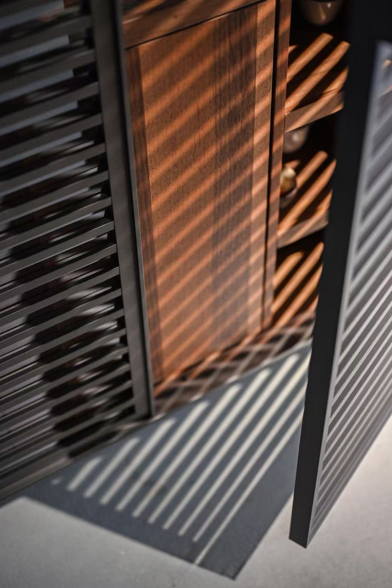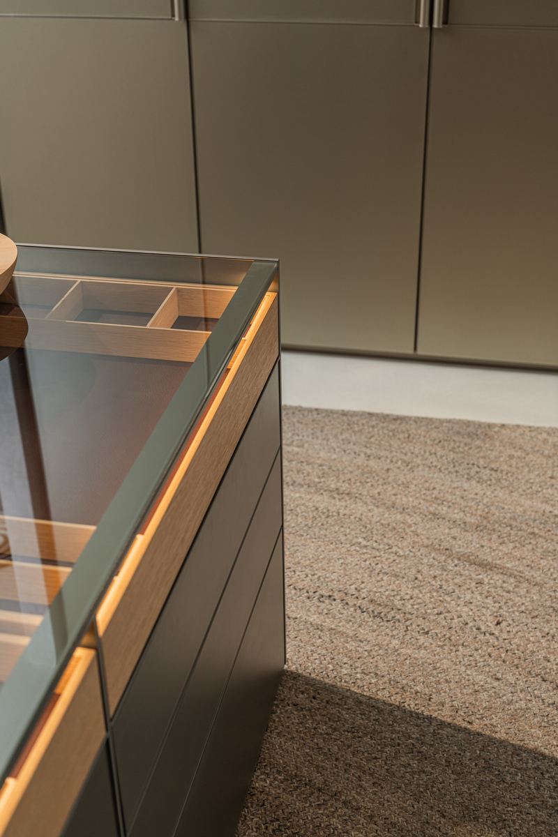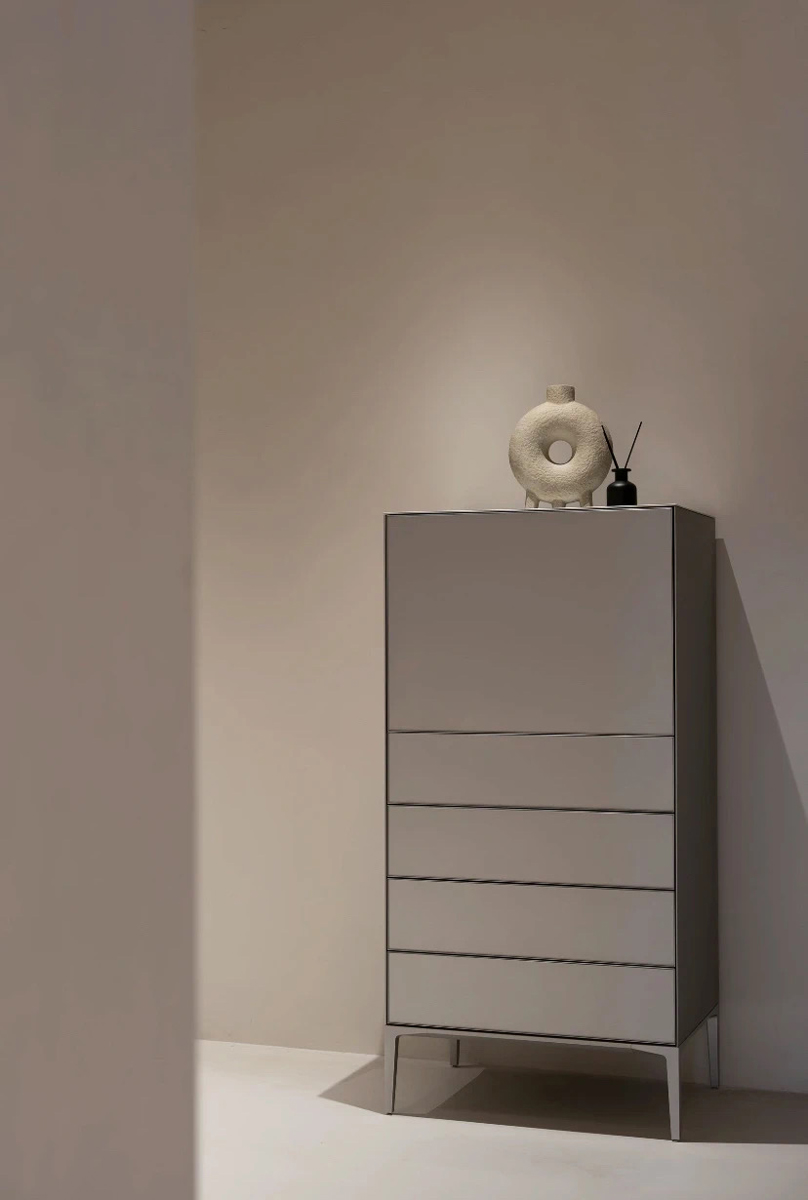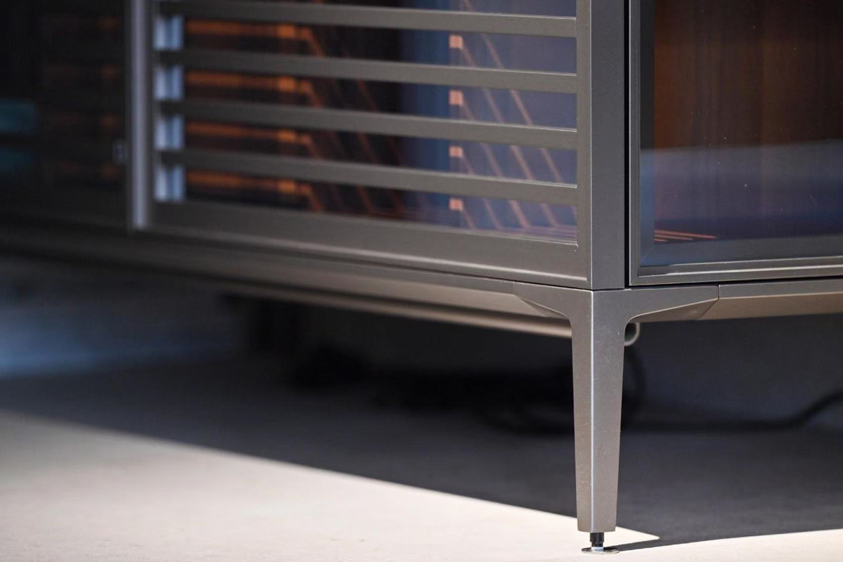Inside, walnut-veneered drawers constructed with traditional dovetail joints provide both aesthetic appeal and structural integrity. Suspended on concealed internal structures, these drawers appear to float within the cabinet, emphasizing the minimalist design.