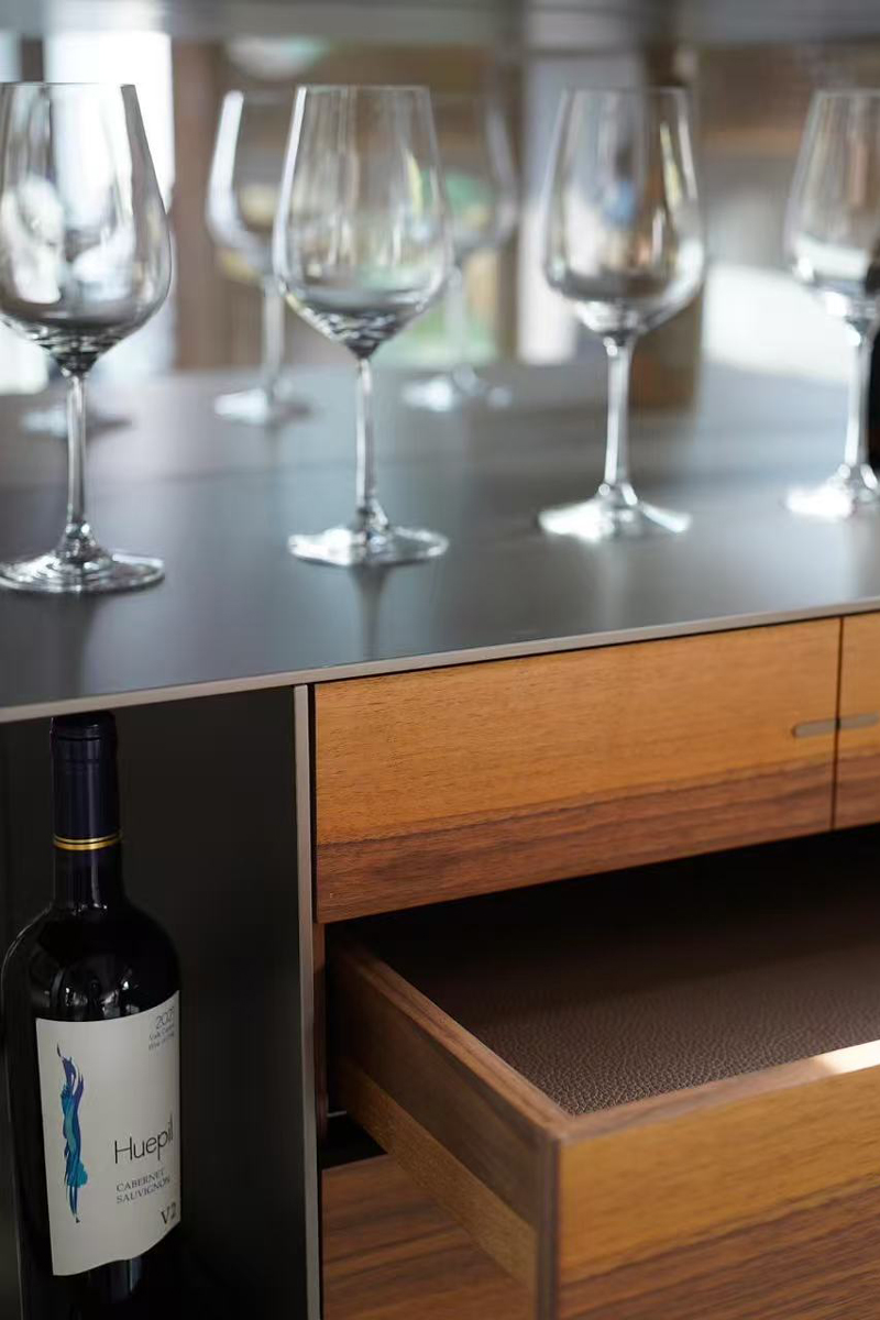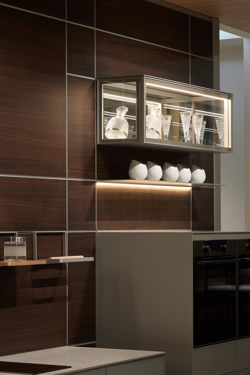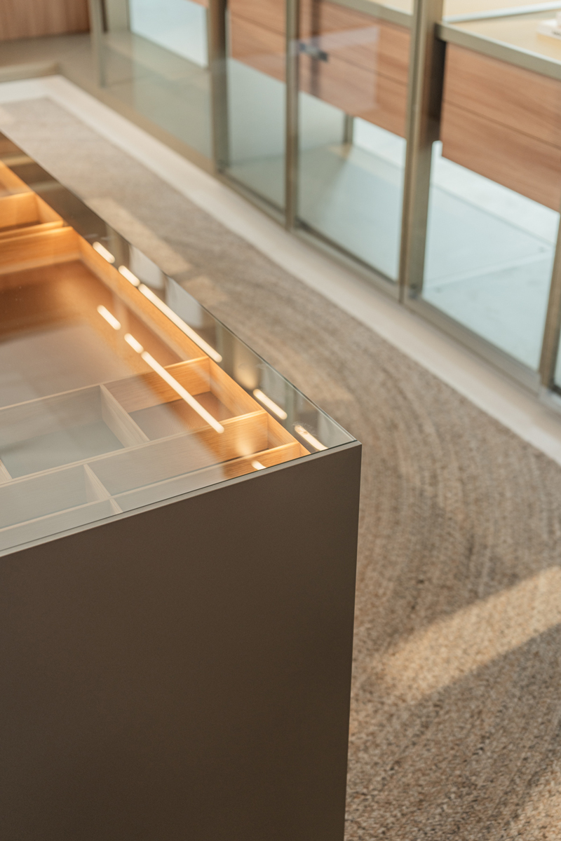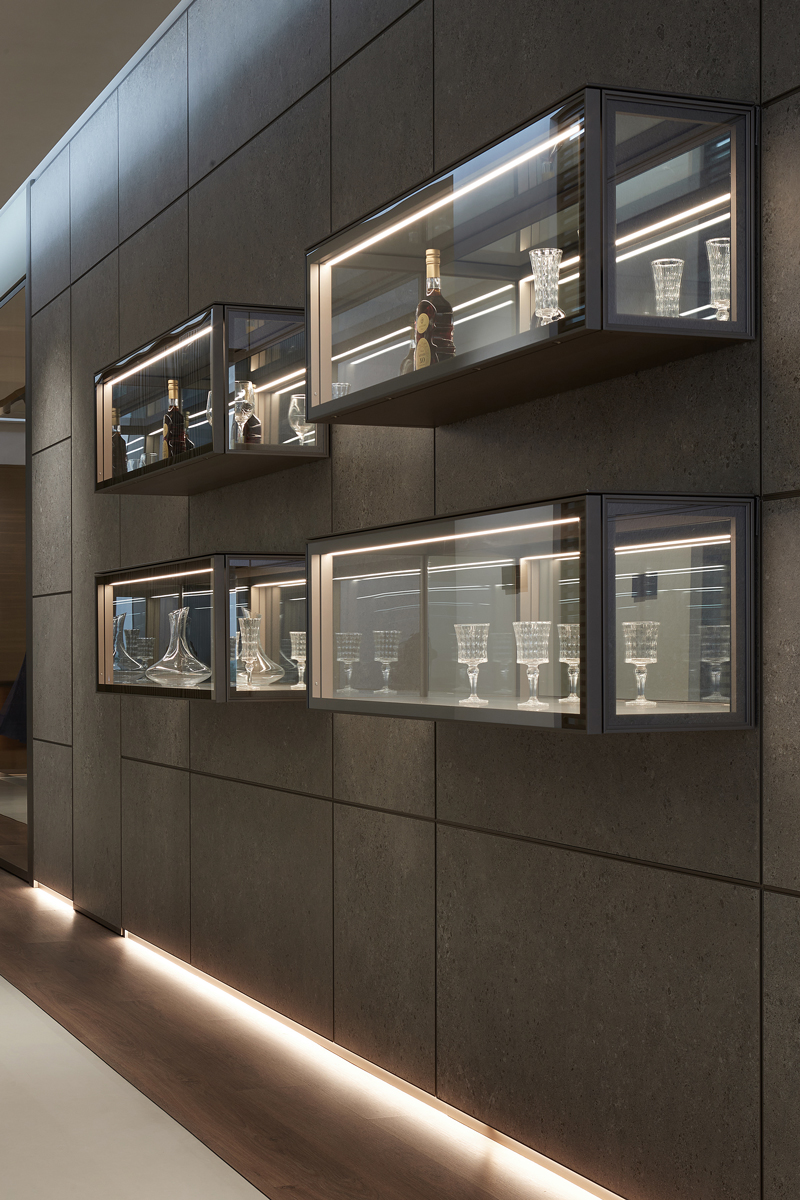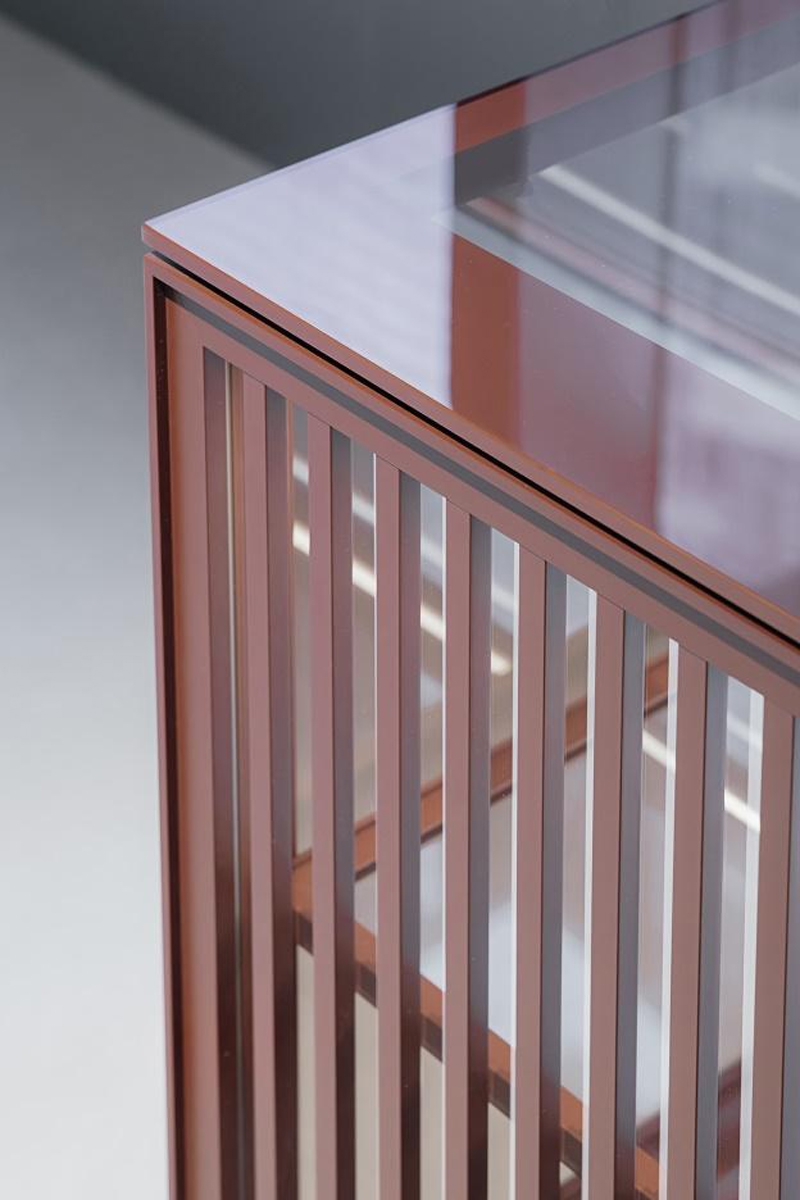 Inside, walnut-veneered drawers constructed with traditional dovetail joints provide both aesthetic appeal and structural integrity. Suspended on concealed internal structures, these drawers appear to float within the cabinet, emphasizing the minimalist design.