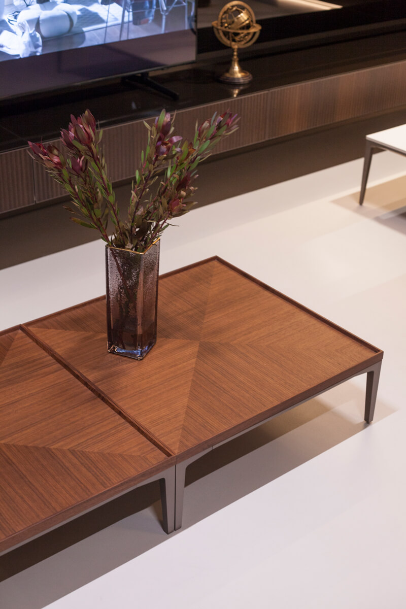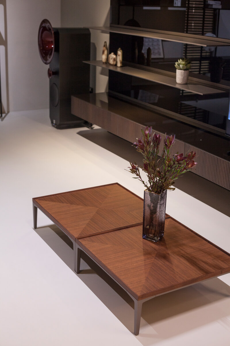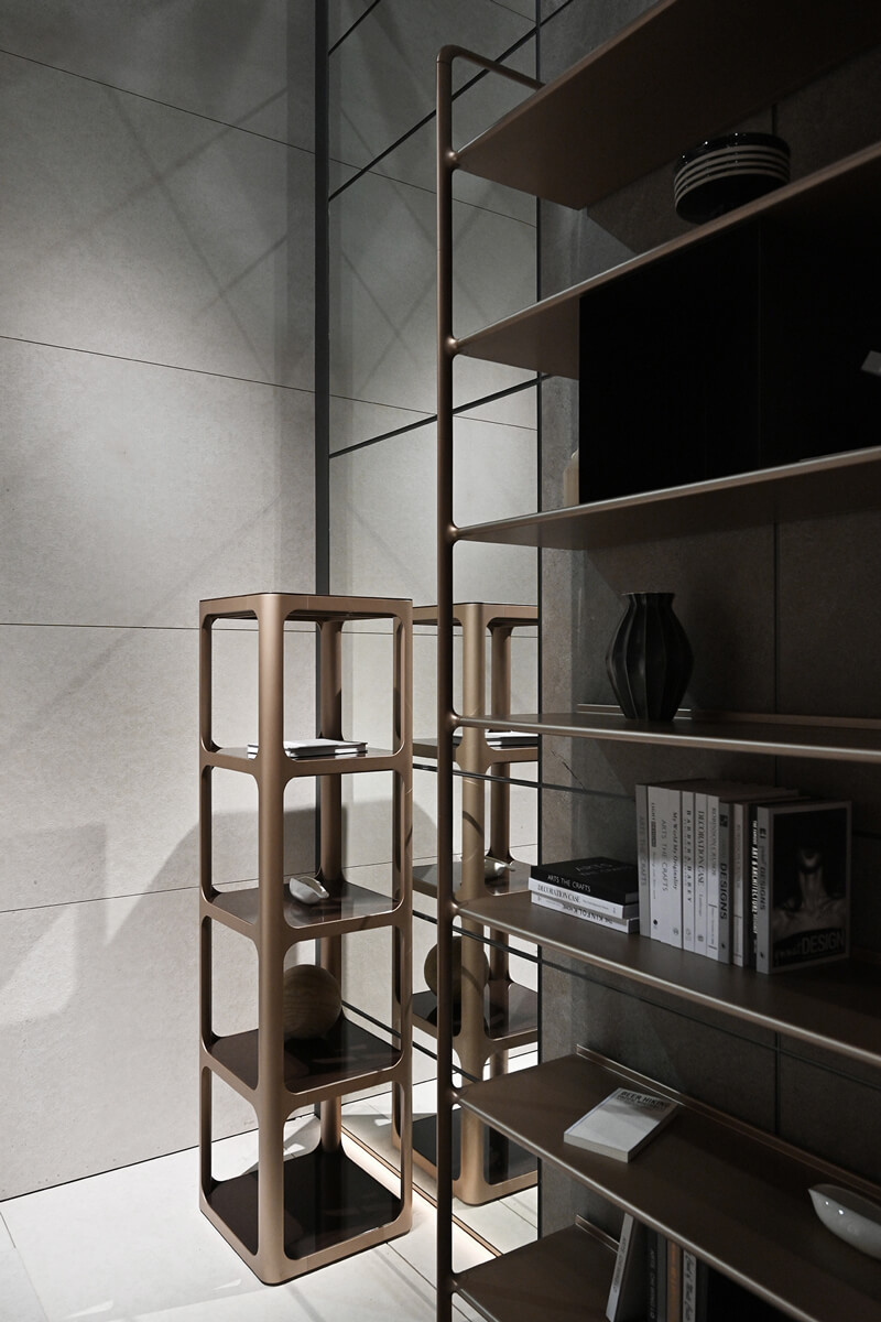 The living room furniture version of Modular Furniture boasts an aluminum structure that can be paired with drawers, flap doors, or open storage modules. An optional cable duct is also available for convenient TV installation.