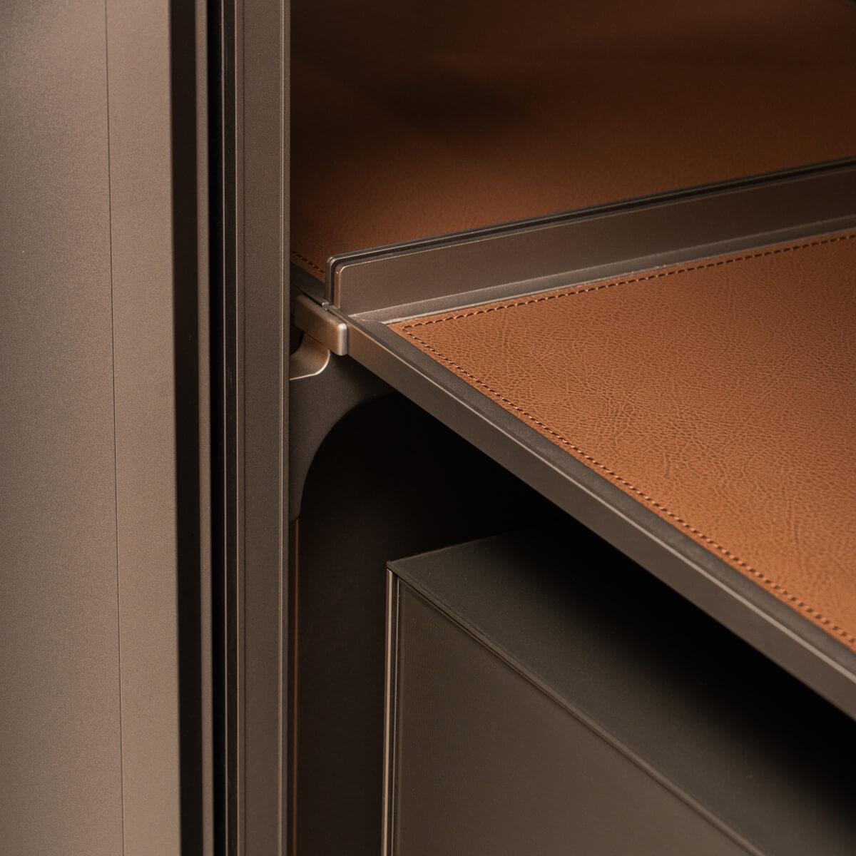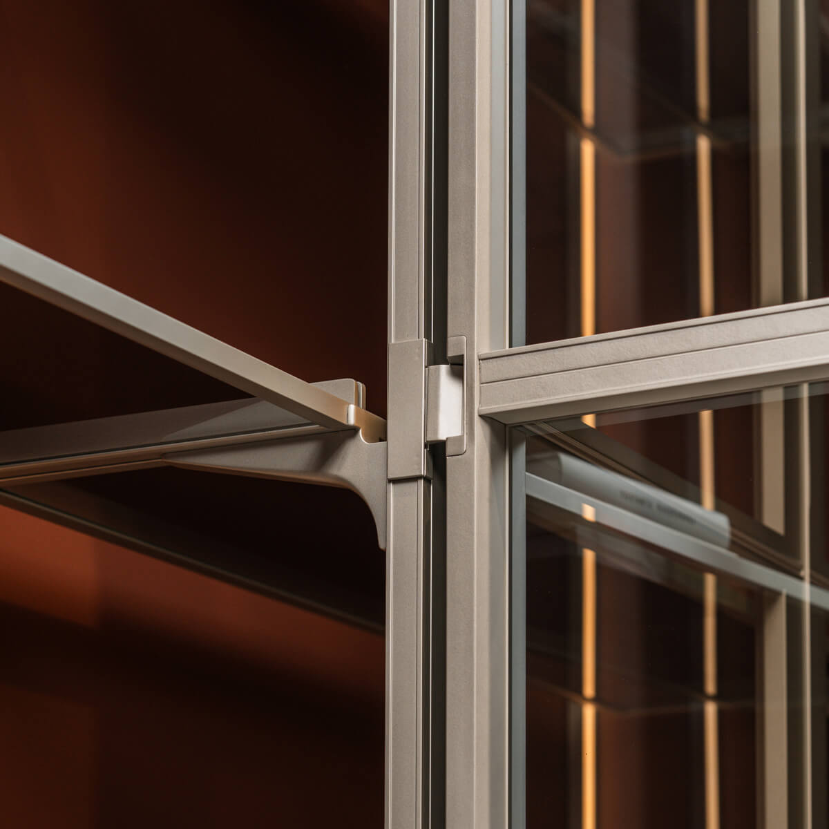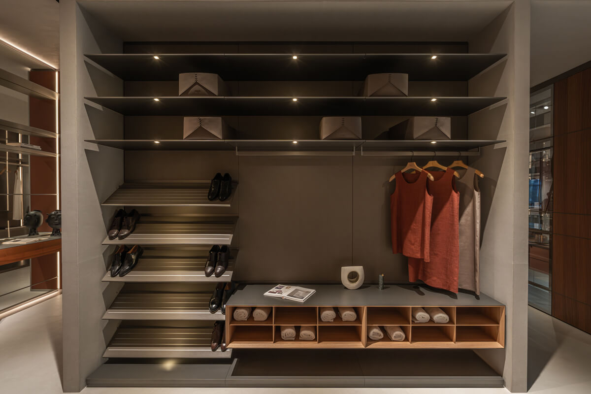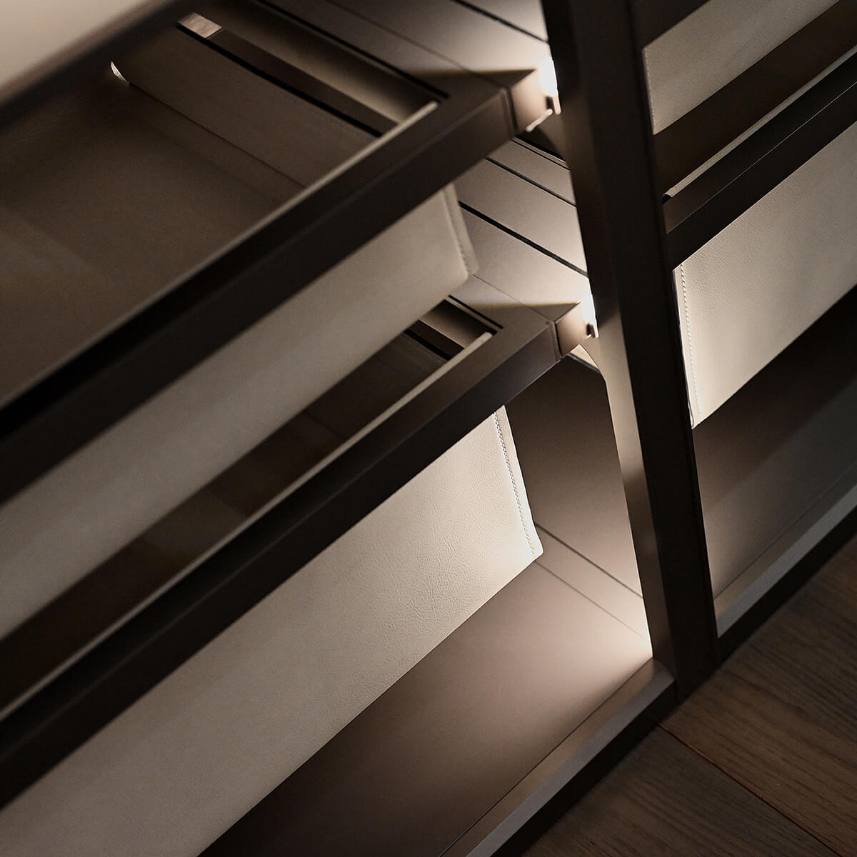 Defined by solid aluminum frames and refined junctions, the G System expresses a clear architectural order. Shelves, drawers, and hanging elements are anchored with visible precision, creating a composed and open structure. Materials such as wood, leather, and metal are layered with restraint, giving the system a sense of balance, depth, and lasting presence.