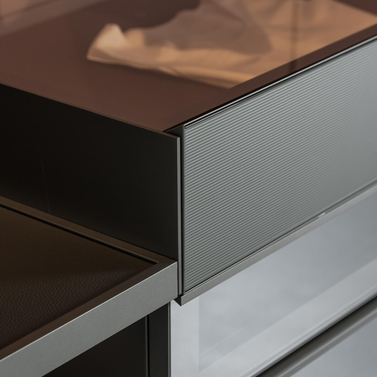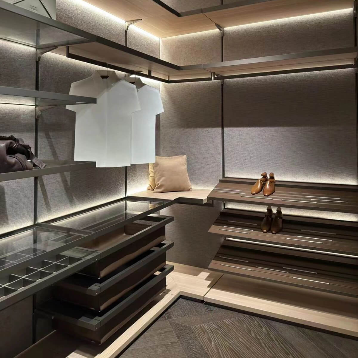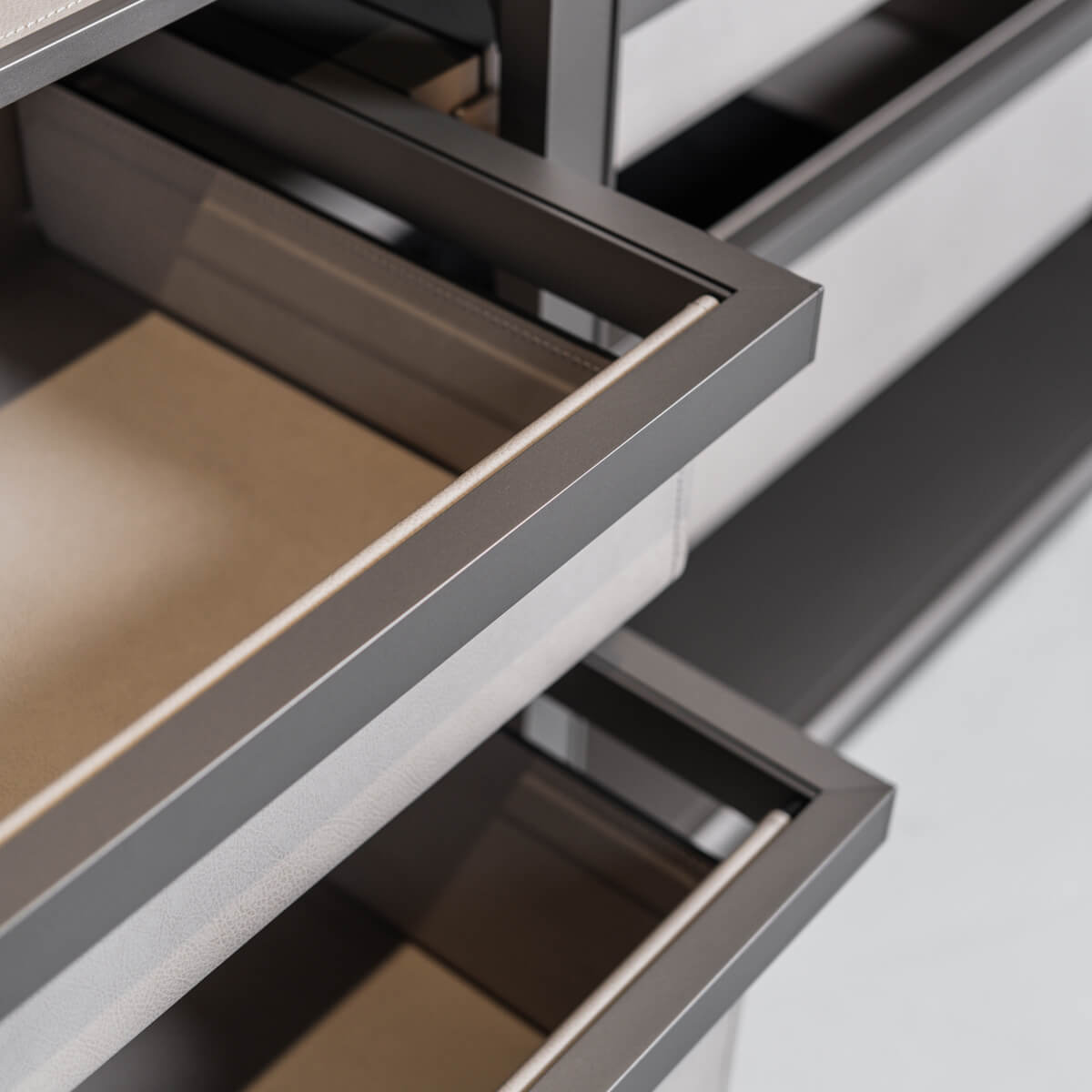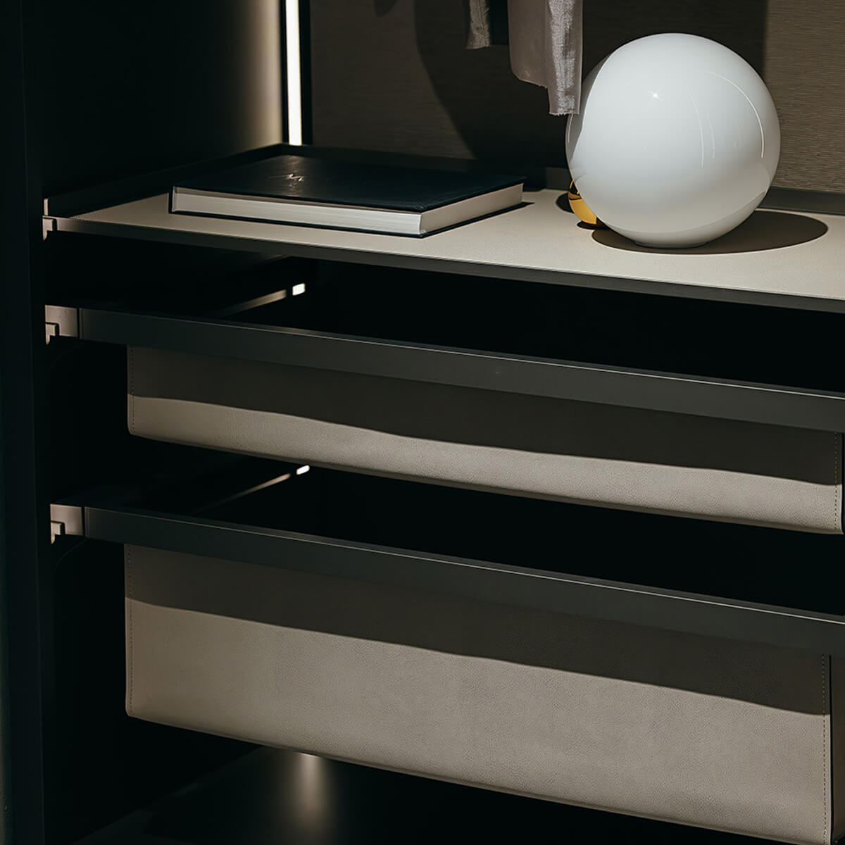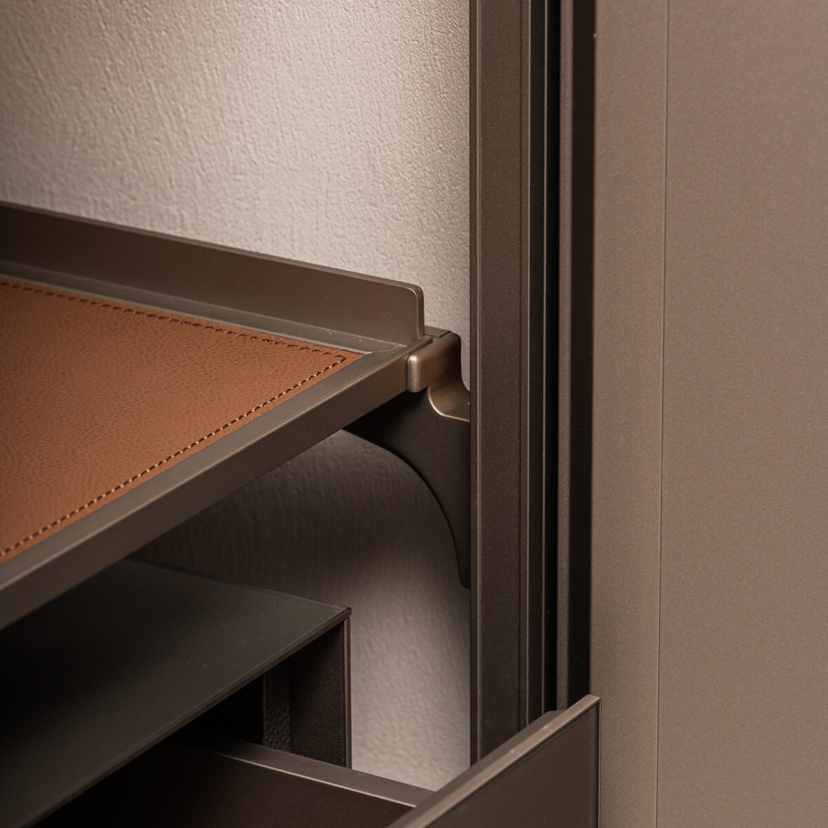 Defined by solid aluminum frames and refined junctions, the G System expresses a clear architectural order. Shelves, drawers, and hanging elements are anchored with visible precision, creating a composed and open structure. Materials such as wood, leather, and metal are layered with restraint, giving the system a sense of balance, depth, and lasting presence.