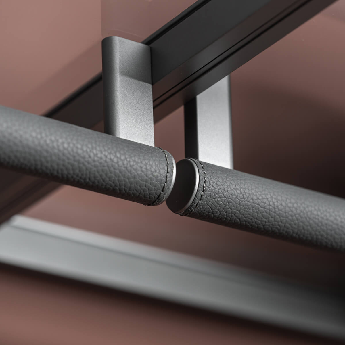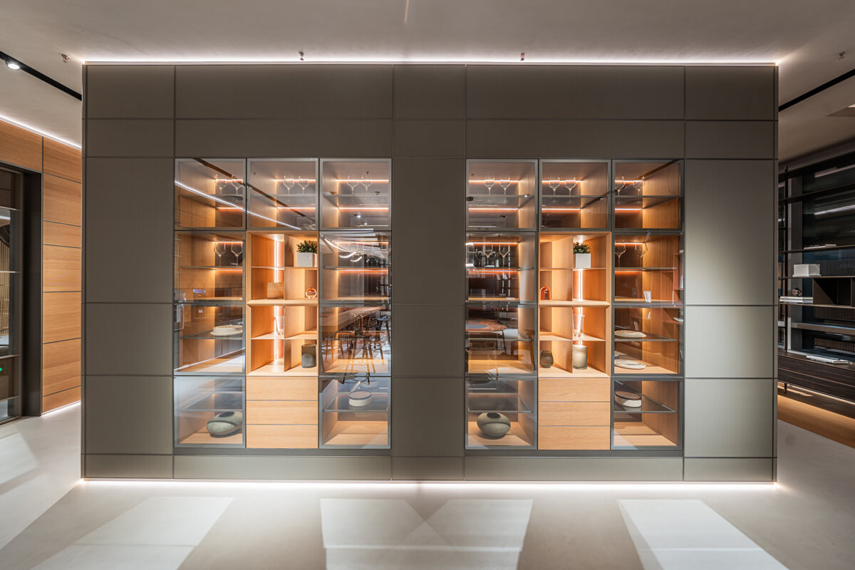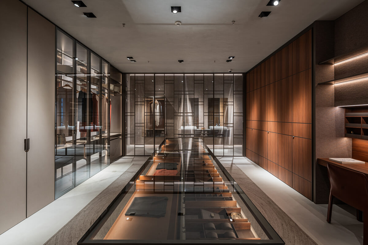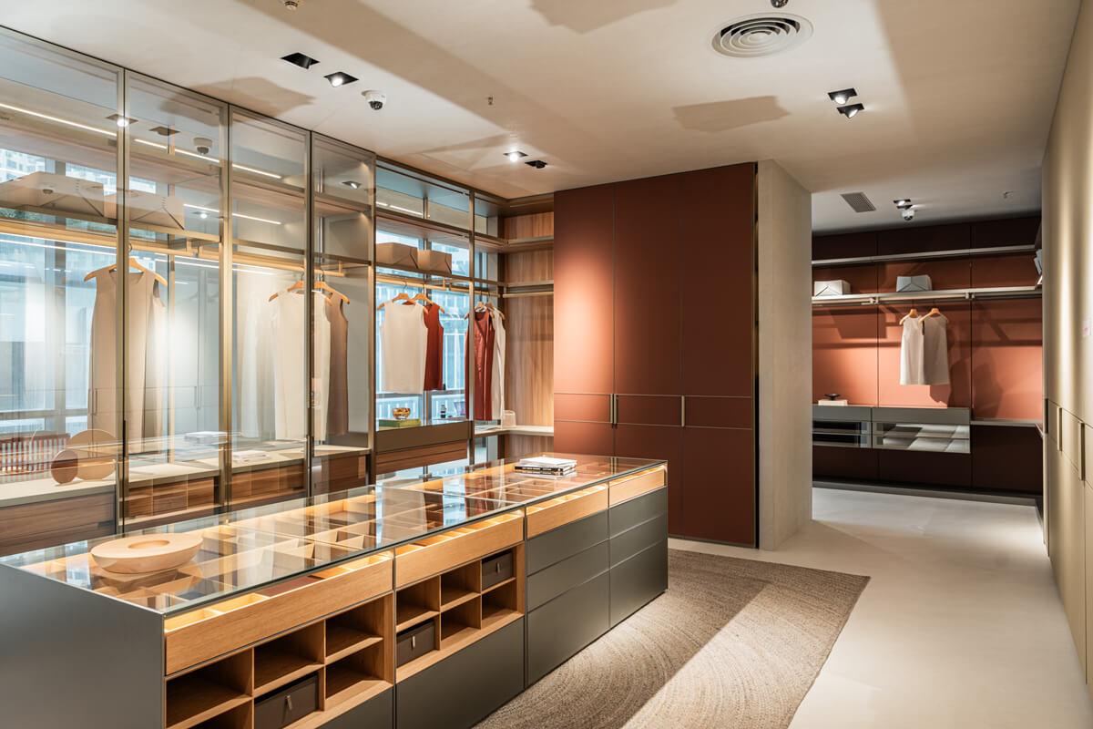 Defined by solid aluminum frames and refined junctions, the G System expresses a clear architectural order. Shelves, drawers, and hanging elements are anchored with visible precision, creating a composed and open structure. Materials such as wood, leather, and metal are layered with restraint, giving the system a sense of balance, depth, and lasting presence.