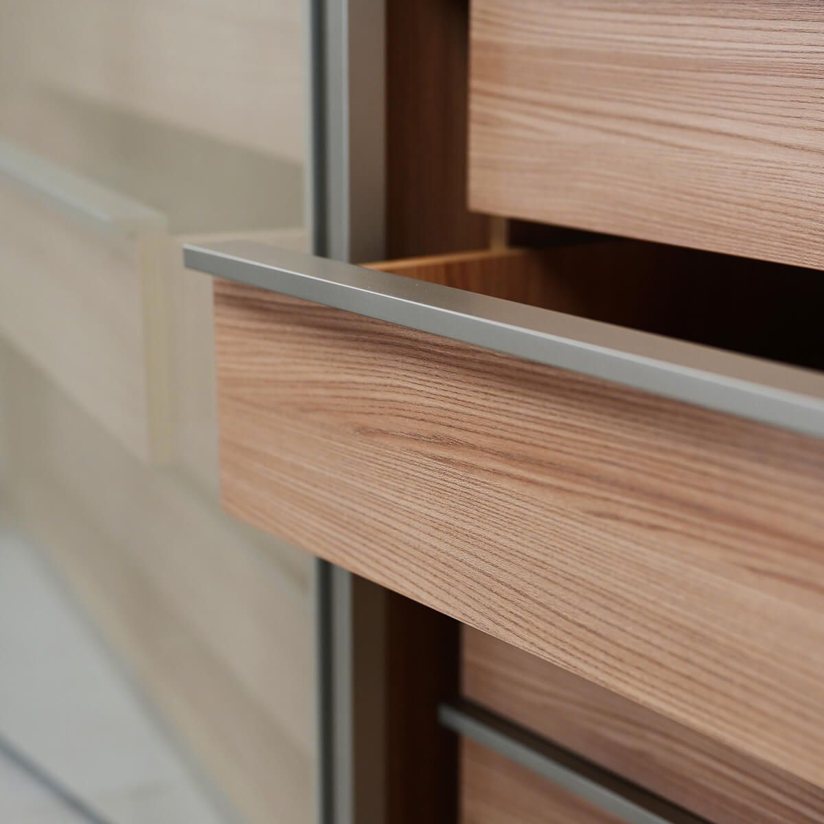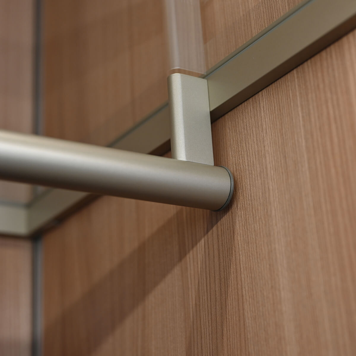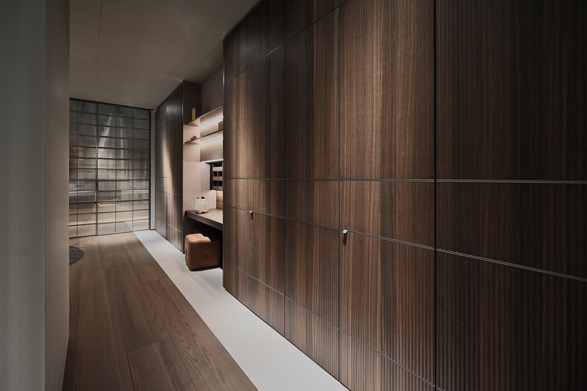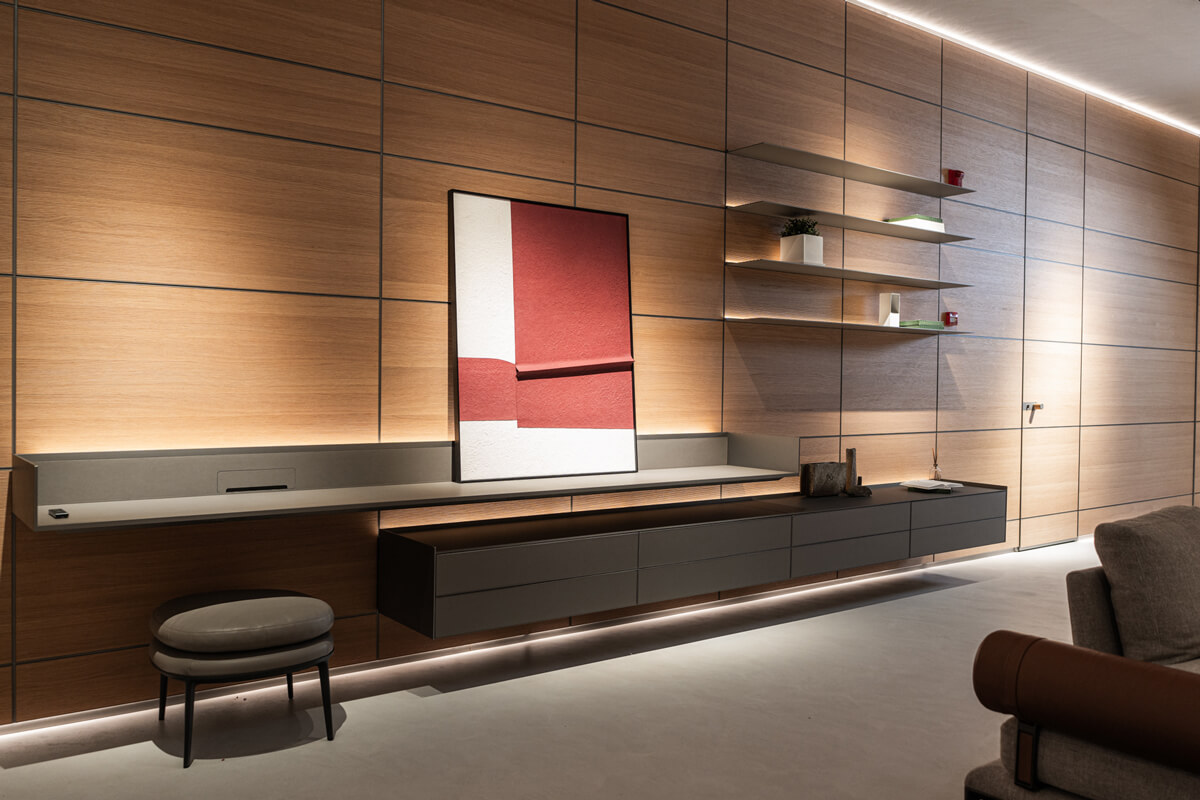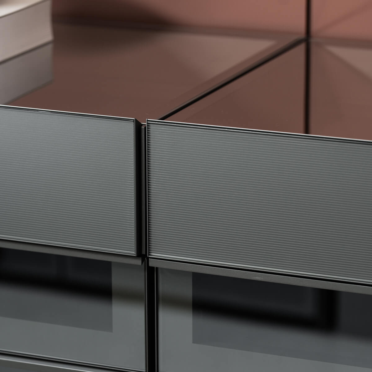 Defined by solid aluminum frames and refined junctions, the G System expresses a clear architectural order. Shelves, drawers, and hanging elements are anchored with visible precision, creating a composed and open structure. Materials such as wood, leather, and metal are layered with restraint, giving the system a sense of balance, depth, and lasting presence.