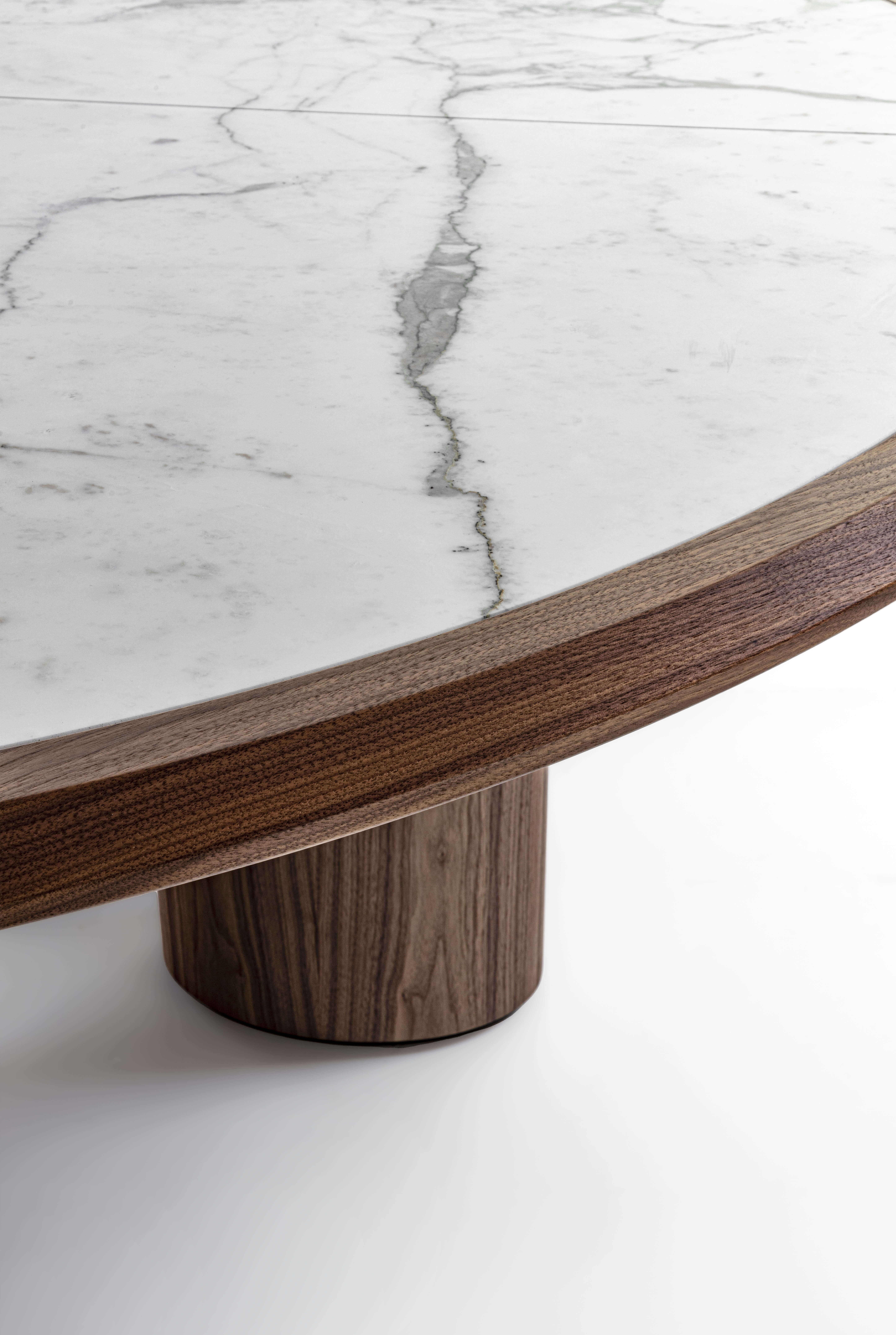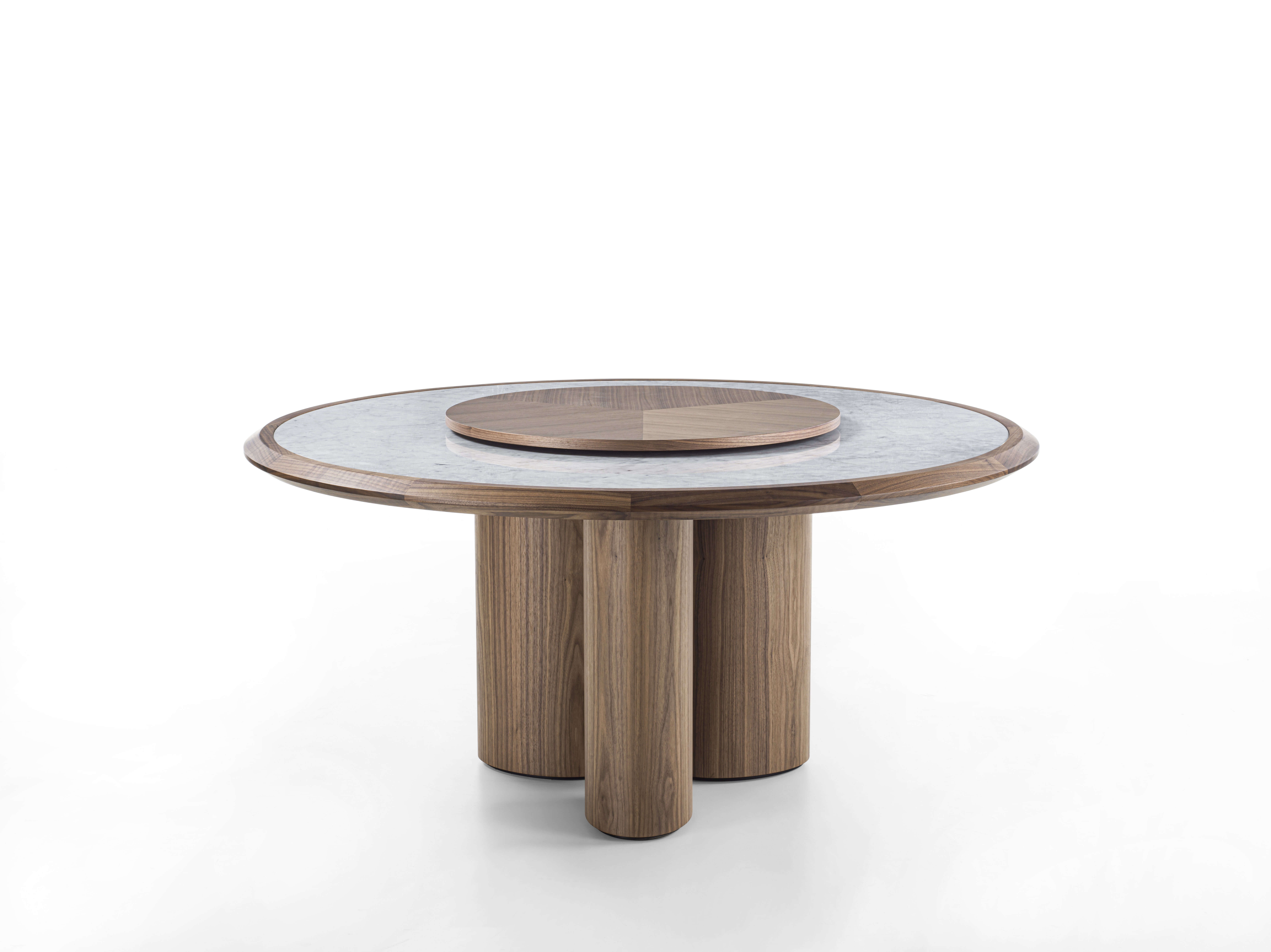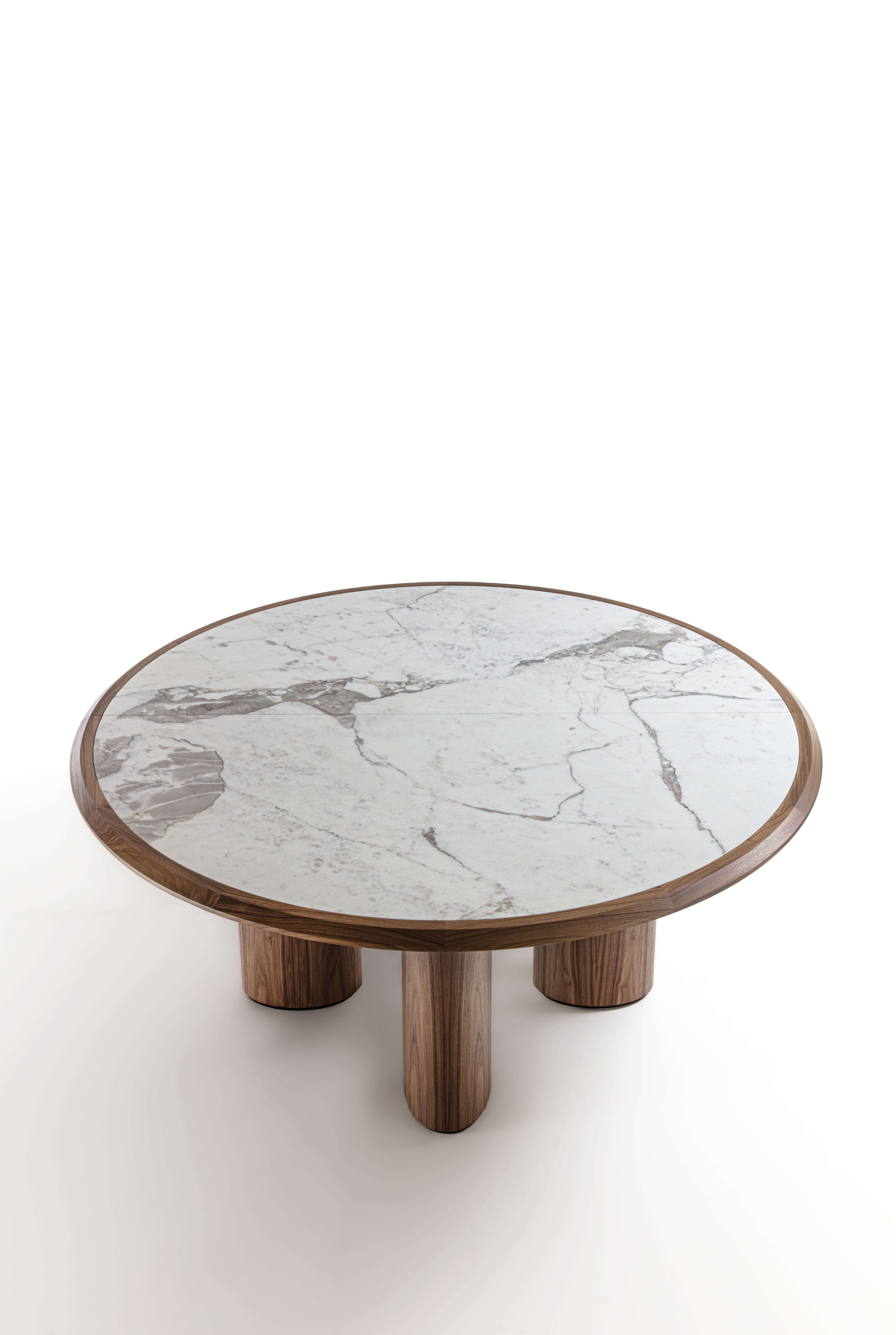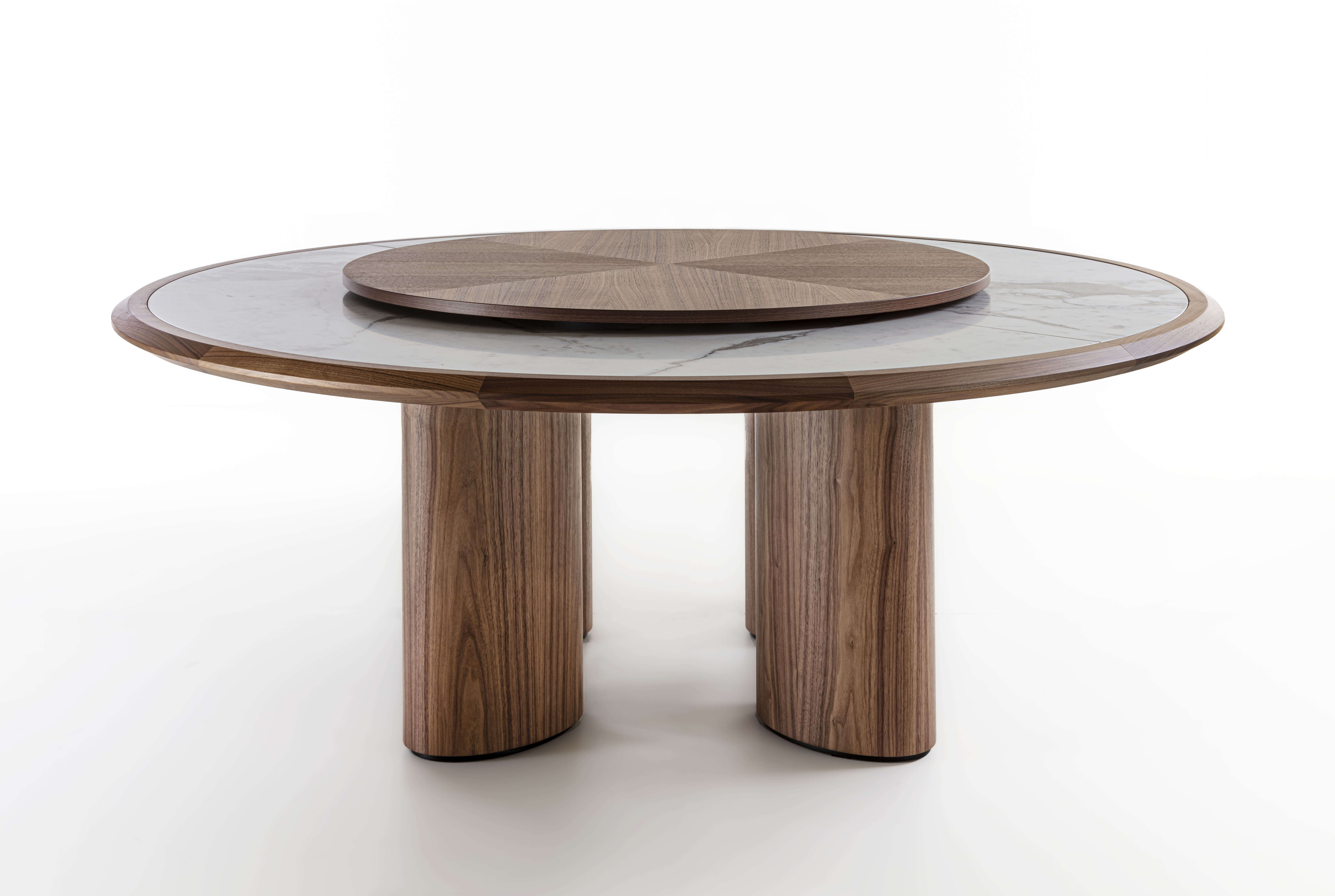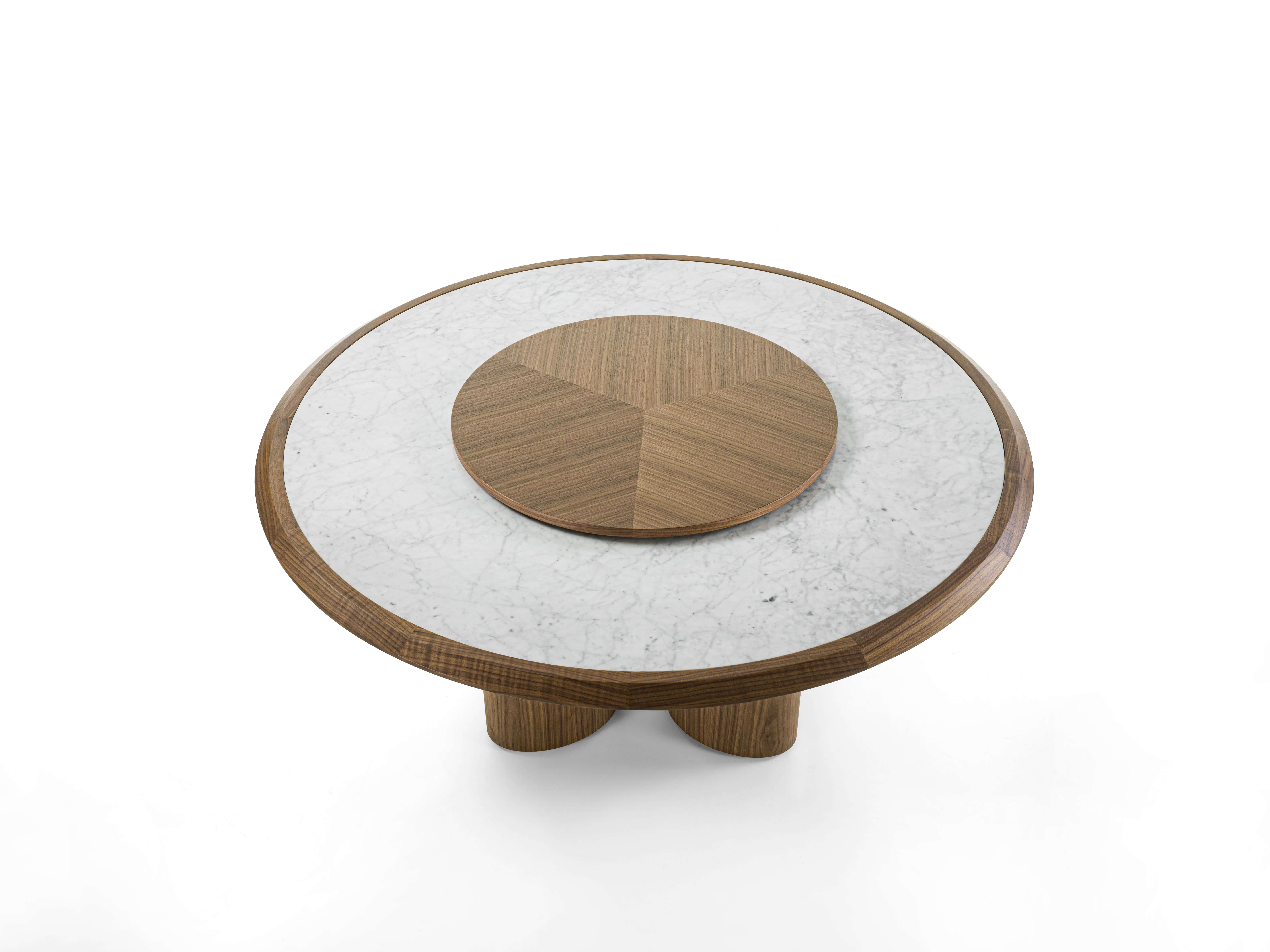 Round table with wooden structure and legs, with top characterized by a solid wood frame where the marble top is inserte.