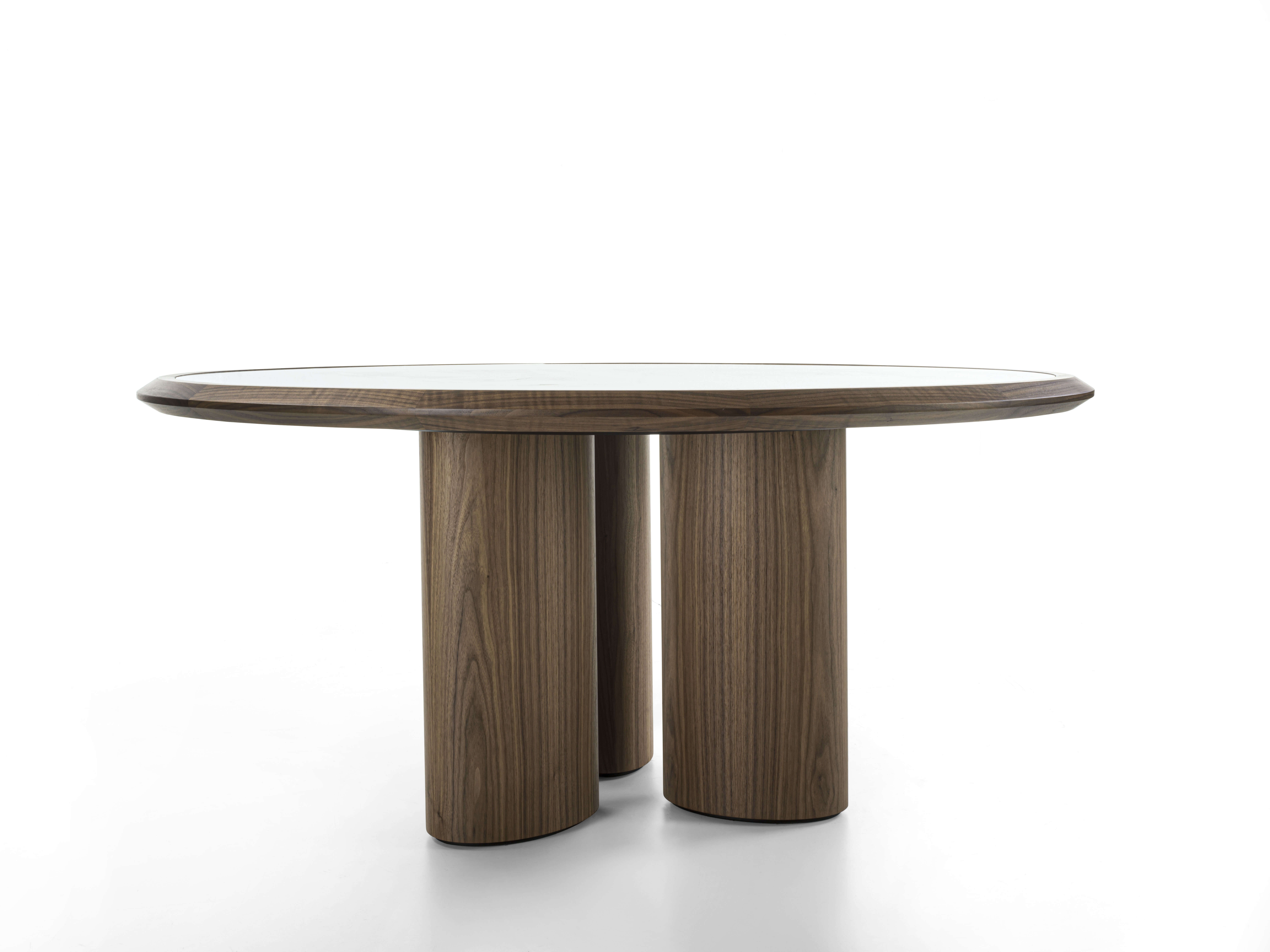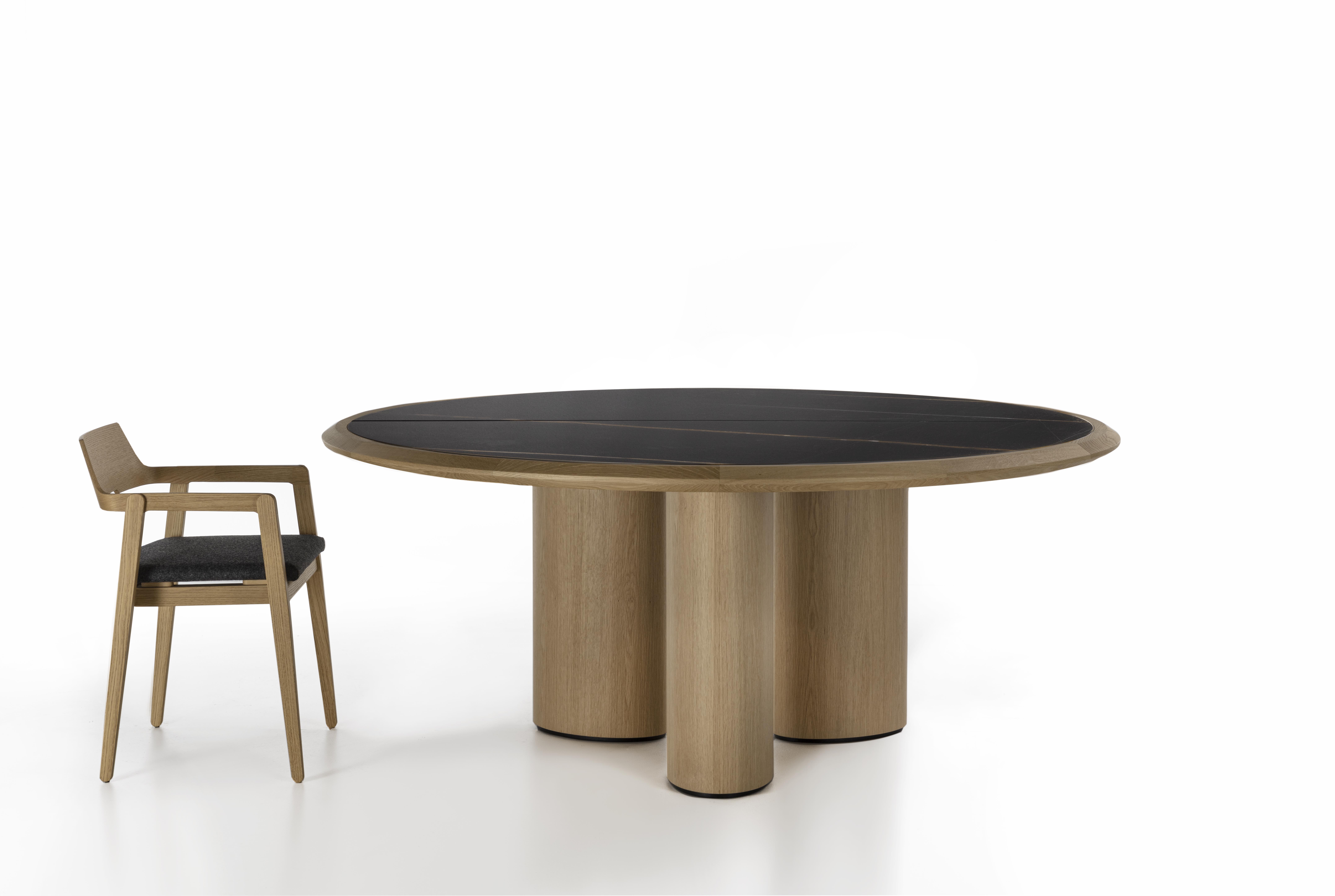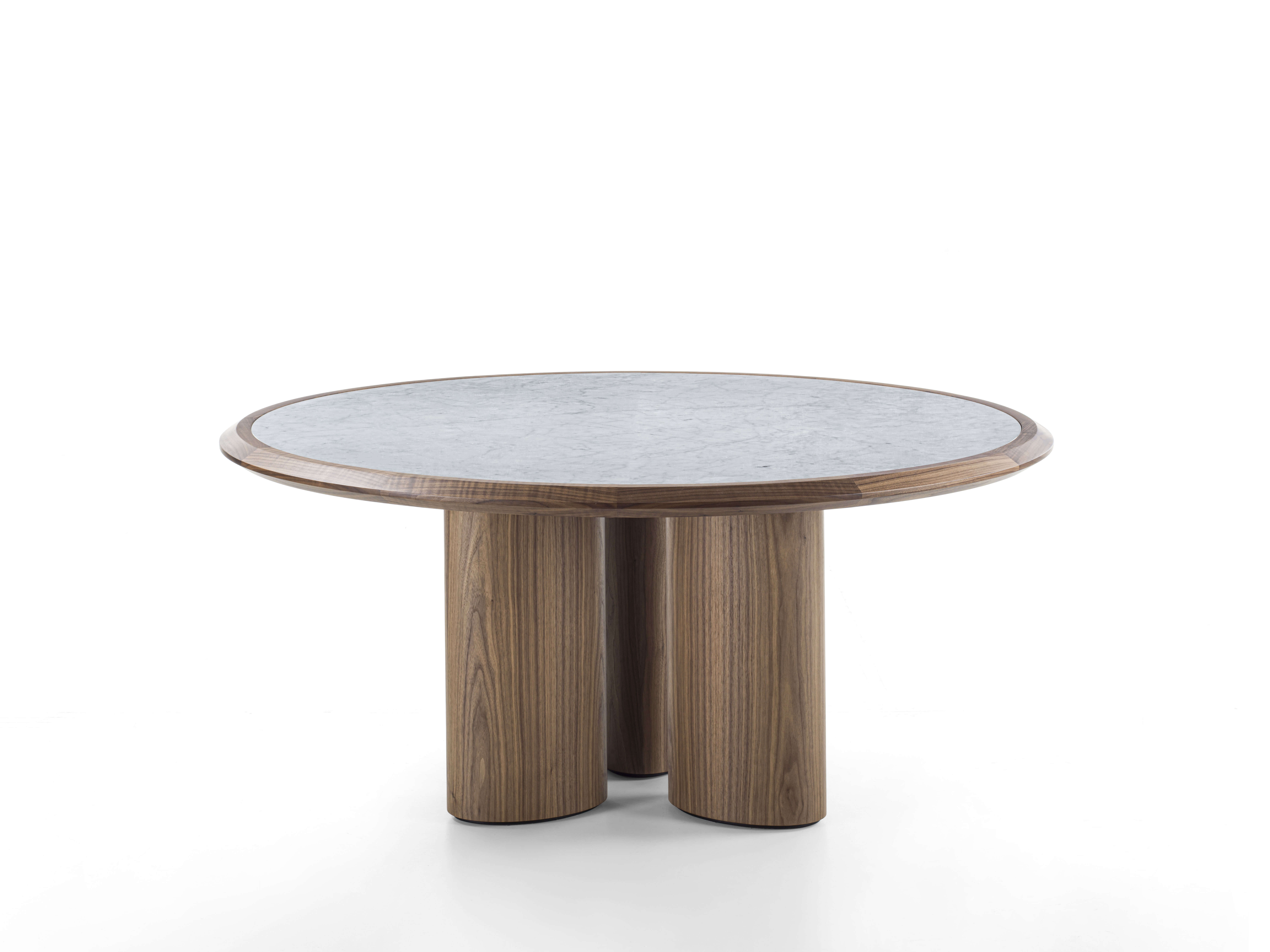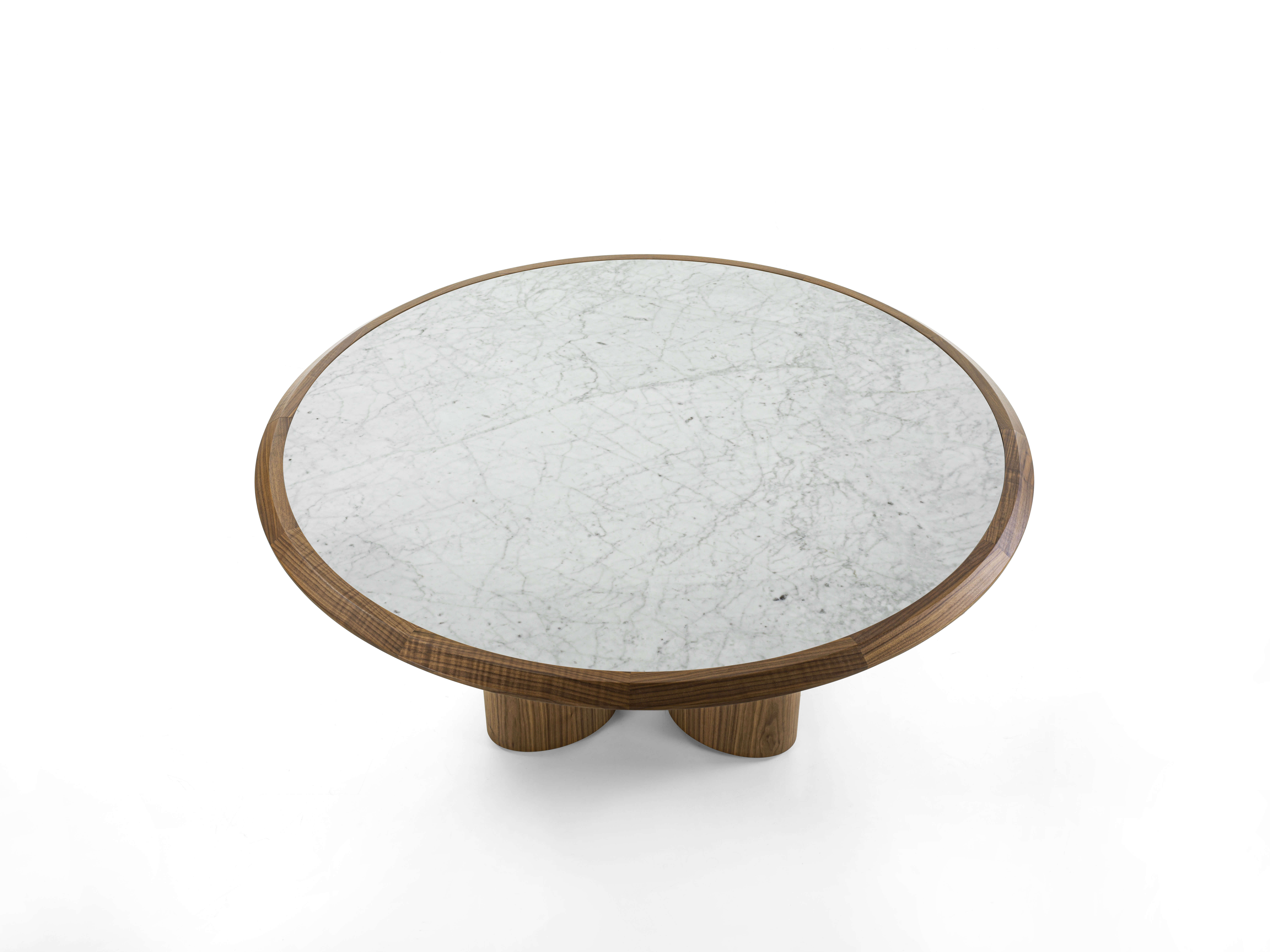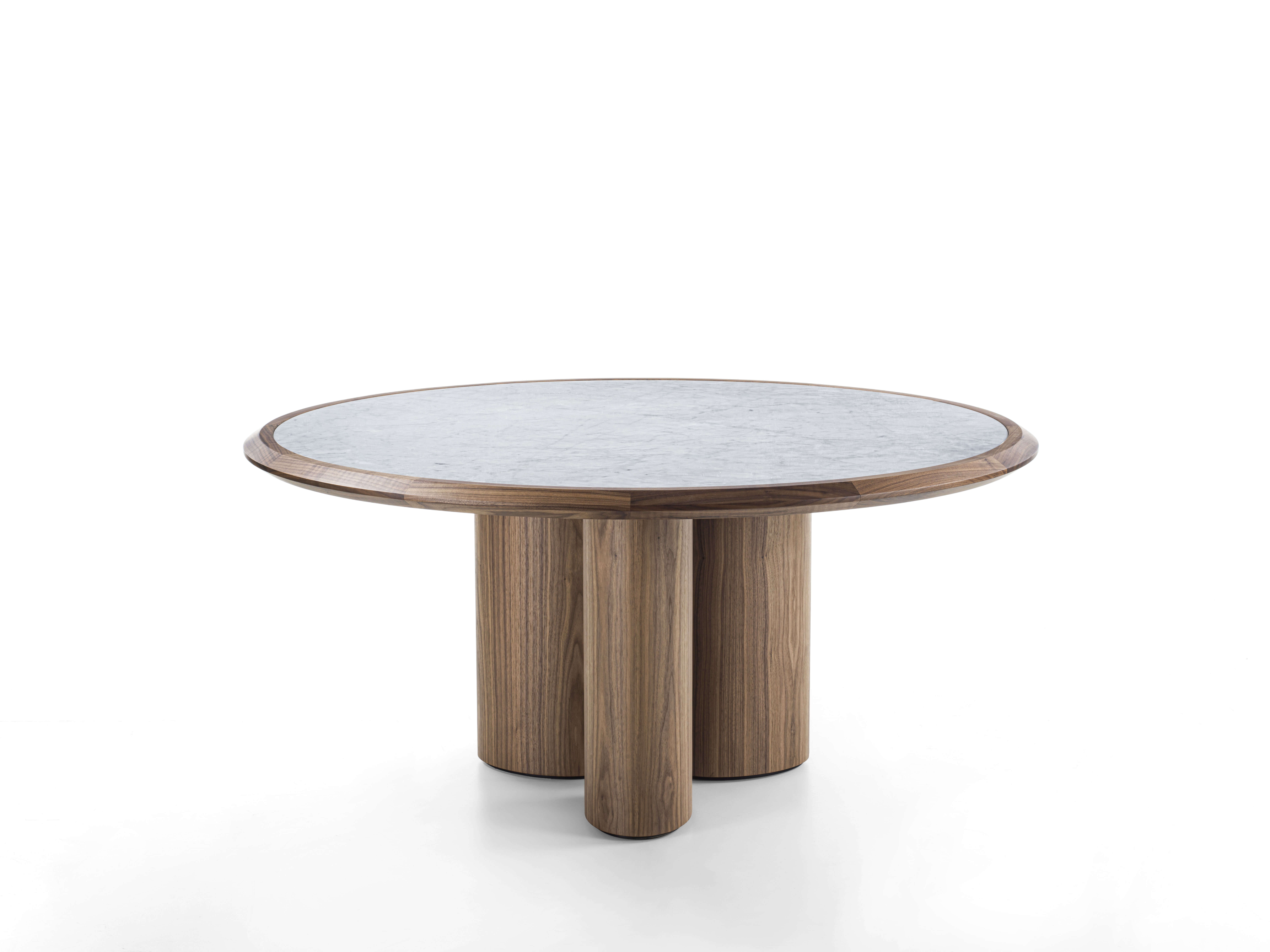 Round table with wooden structure and legs, with top characterized by a solid wood frame where the marble top is inserte.