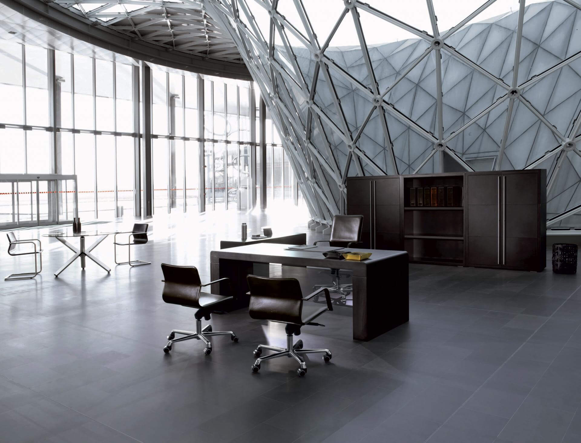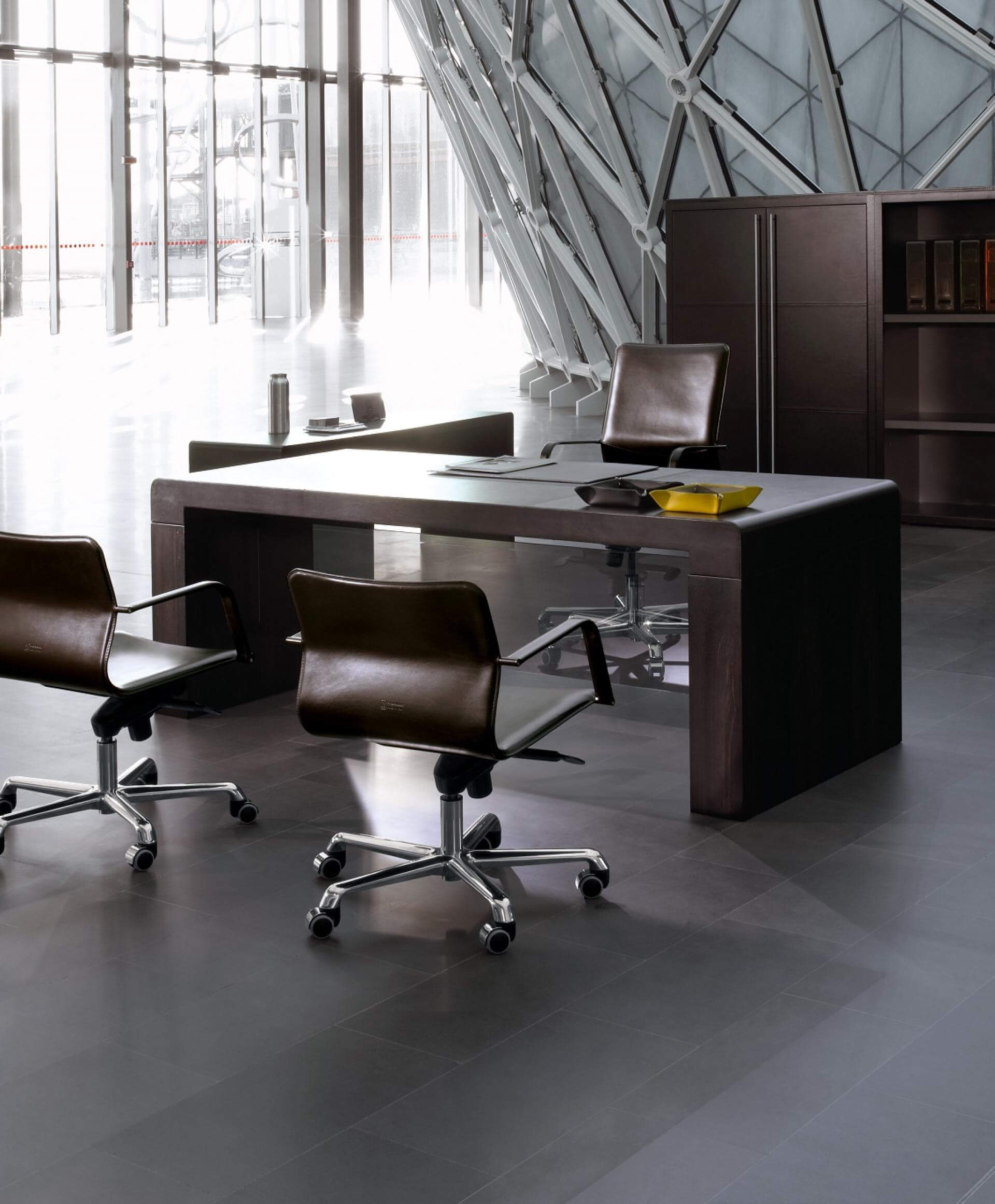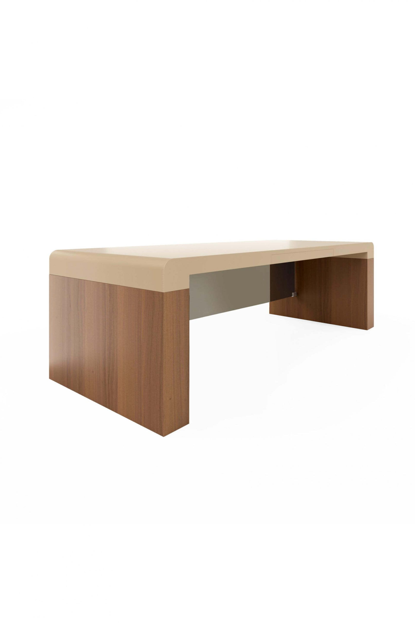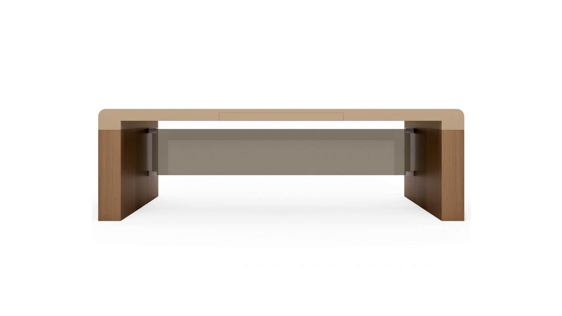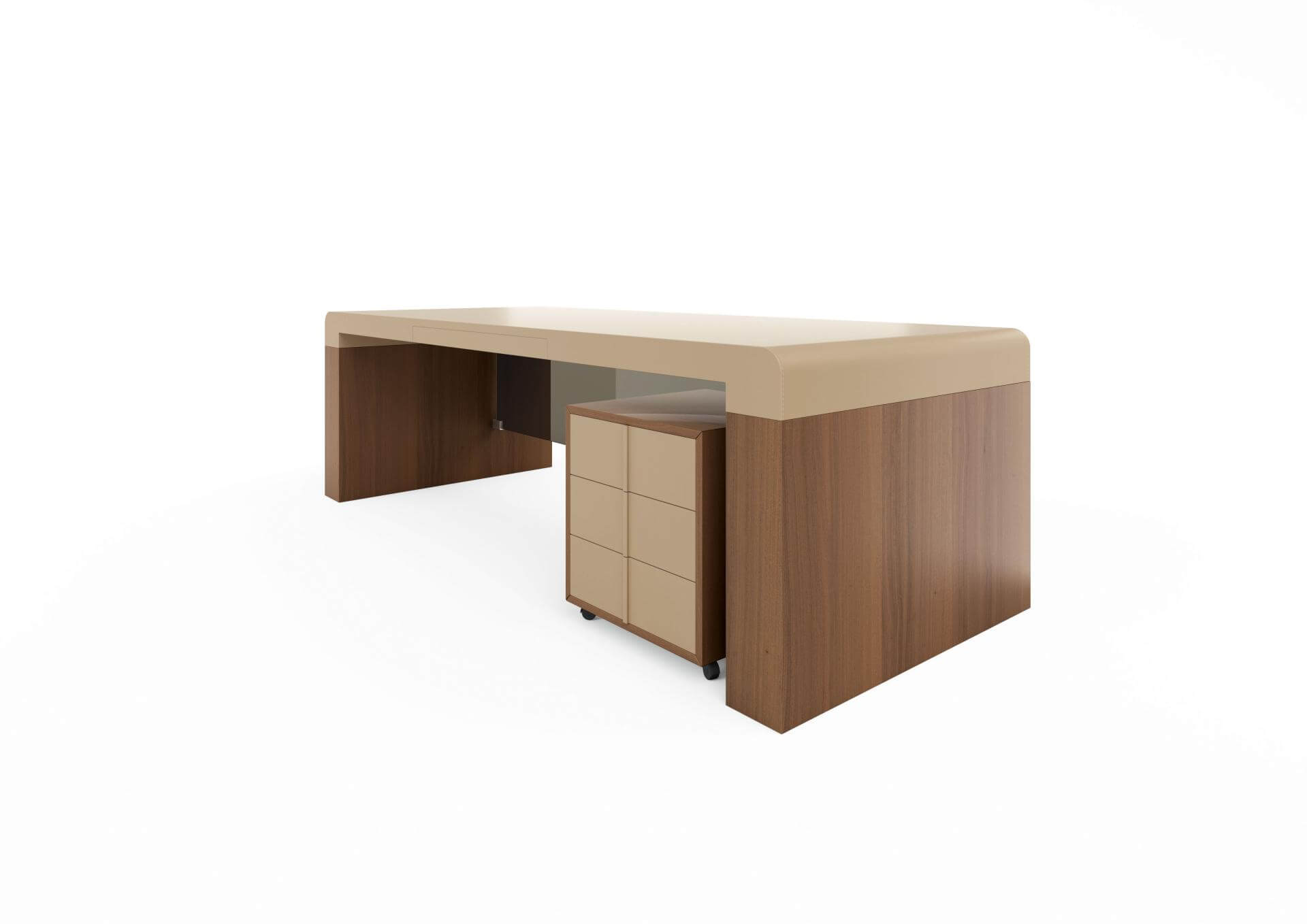 Desk with top covered with leather and central drawer. Feet in Ebony EB or Walnut Canaletto NC.