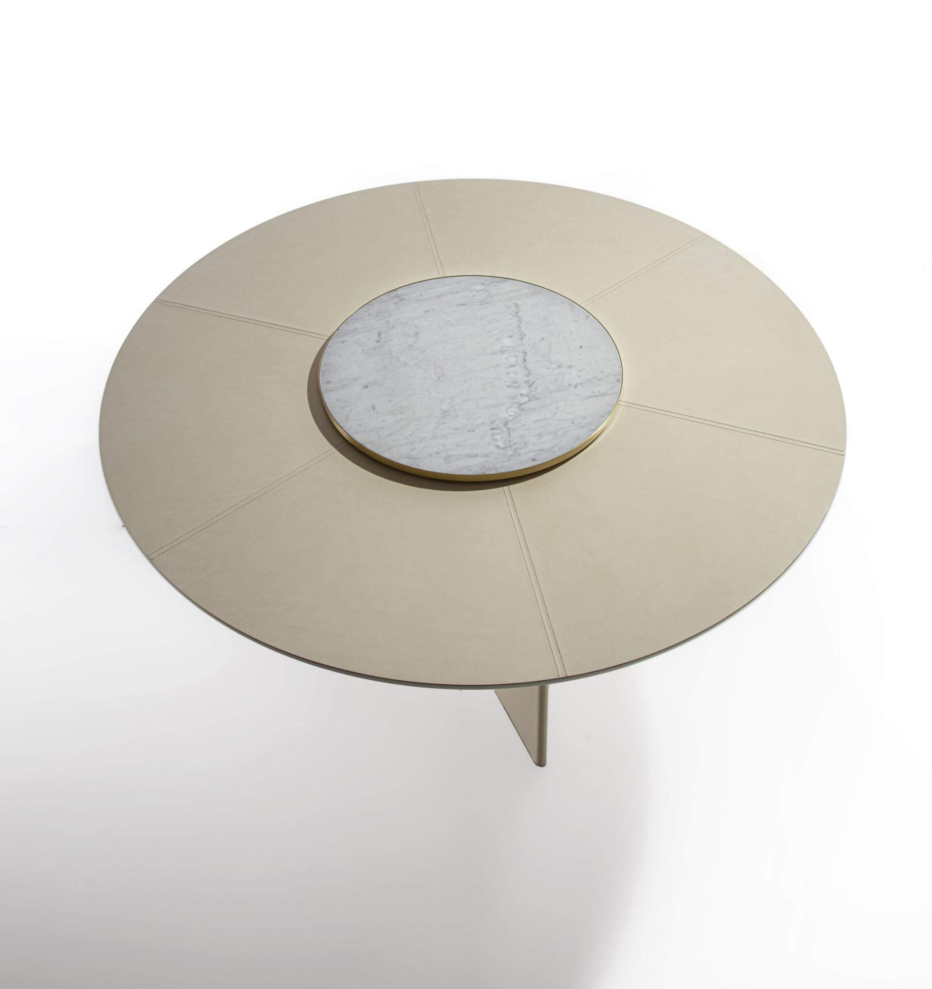 Table with central base in wood covered with leather, top in leather and rotating marble top placed in the center of the table. Ideal for dining tables.